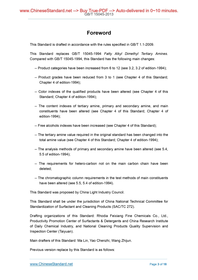 Similar standardsGB/T 15045-2013: Fatty alkyl dimethyl tertiary amines---This is an excerpt. Full copy of true-PDF in English version (including equations, symbols, images, flow-chart, tables, and figures etc.), auto-downloaded/delivered in 9 seconds, can be purchased online: https://www.ChineseStandard.net/PDF.aspx/GBT15045-2013GB NATIONAL STANDARD OF THE PEOPLE’S REPUBLIC OF CHINA ICS 71.100.40 G 73 Replacing GB/T 15045-1994 Fatty Alkyl Dimethyl Tertiary Amines 脂肪烷基二甲基叔胺 Issued on: DECEMBER 31, 2013 Implemented on: DECEMBER 01, 2014 Issued by. General Administration of Quality Supervision, Inspection and Quarantine of the People’s Republic of China; Standardization Administration of the People’s Republic of China. Table of ContentsForeword ... 3 1 Scope ... 5 2 Normative references ... 5 3 Product category ... 5 4 Technical requirements ... 6 5 Test methods... 8 6 Inspection rules ... 15 7 Marks, packaging, transport, storage and guarantee period ... 17ForewordThis Standard is drafted in accordance with the rules specified in GB/T 1.1-2009. This Standard replaces GB/T 15045-1994 Fatty Alkyl Dimethyl Tertiary Amines. Compared with GB/T 15045-1994, this Standard has the following main changes. -- Product categories have been increased from 6 to 12 (see 3.2, 3.2 of edition-1994); -- Product grades have been reduced from 3 to 1 (see Chapter 4 of this Standard; Chapter 4 of edition-1994); -- Color indexes of the qualified products have been altered (see Chapter 4 of this Standard; Chapter 4 of edition-1994); -- The content indexes of tertiary amine, primary and secondary amine, and main constituents have been altered (see Chapter 4 of this Standard; Chapter 4 of edition-1994); -- Free alcohols indexes have been increased (see Chapter 4 of this Standard); -- The tertiary amine value required in the original standard has been changed into the total amine value (see Chapter 4 of this Standard; Chapter 4 of edition-1994); -- The analysis methods of primary and secondary amine have been altered (see 5.4, 5.5 of edition-1994); -- The requirements for hetero-carbon not on the main carbon chain have been deleted; -- The chromatographic column requirements in the test methods of main constituents have been altered (see 5.5, 5.4 of edition-1994). This Standard was proposed by China Light Industry Council. This Standard shall be under the jurisdiction of China National Technical Committee for Standardization of Surfactant and Cleaning Products (SAC/TC 272). Drafting organizations of this Standard. Rhodia Feixiang Fine Chemicals Co., Ltd., Productivity Promotion Center of Surfactants & Detergents and China Research Institute of Daily Chemical Industry, and National Cleaning Products Quality Supervision and Inspection Center (Taiyuan). Main drafters of this Standard. Ma Lin, Yao Chenzhi, Wang Zhijun. Previous version replace by this Standard is as follows. -- GB/T 15045-1994. Fatty Alkyl Dimethyl Tertiary Amines1 ScopeThis Standard specifies the product category, technical requirements, test methods, inspection rules, marks, packaging, transport, storage and guarantee period of fatty alkyl dimethyl tertiary amines. This Standard applies to fatty alkyl dimethyl tertiary amines (N,N-dimethyl alkyl tertiary amine) produced by fatty alcohols or fatty acid, which are mainly used to produce cationic surfactants, zwitterionic surfactants, non-ionic surfactants, antistatic agents, etc. This Standard does not apply to fatty alkyl dimethyl tertiary amines produced by oxo-synthesis alcohols.2 Normative referencesThe following documents are indispensable for application of this document. For the dated documents so quoted, only dated versions apply to this document. For the undated documents so quoted, the latest versions (including all modification sheets) apply to this document. GB/T 3143 Color determination method of liquid chemicals (Hazen unit - Platinum-cobalt scale) GB/T 6682 Water for laboratory use; Specifications QB/T 2739 Preparations of standard volumetric solutions of general test methods for washing products3 Product category3.1 Structural formula CH3 N —R (R=CnH2n+1, n=even number between 8 and 24) CH3 3.2 Categories and codes Fatty alkyl dimethyl tertiary amines can be divided into 12 categories according to the fatty alkyl carbon atom numbers and main constituents. Categories and codes are as follows. Tertiary amine 5.3.2 Reagents 5.3.2.1 HCl 5.3.2.2 Isopropyl alcohol 5.3.2.3 Ethylene glycol 5.3.2.4 Standard solution of HCl- isopropyl alcohol-ethylene glycol, c = 0.15 mol/L. Add prepared HCl into the mixed solution of ethylene glycol and isopropyl alcohol (1.1, volume fraction); shake well; then conduct calibration in accordance with the provisions of QB/T 2739. The standard solution shall be sealed and stored in the refrigerator at about 10°C to avoid volatilization of the solvents due to high temperature. Before use, the standard solution shall be placed in room temperature to let it recover to the room temperature; the validity is 1 month. 5.3.2.5 Acetic anhydride 5.3.3 Instruments 5.3.3.1 Titration vessel or beaker, 100 mL. 5.3.3.2 Graduated cylinder, 50mL. 5.3.3.3 Acidometer. 5.3.4 Test procedures Weigh 0.2 g~0.3 g (less low-molecular-weight sample and more high-molecular-weight sample) of evenly melted and mixed sample (precision. 0.0001g); add into a 100 mL titration vessel or beaker; slowly add in 10 mL of acetic anhydride (if there is any solid in the sample, it shall be heated in hot water till melted); shake well; let the solution stay in room temperature for 15 min; then add in 50 mL of isopropyl alcohol solution; put it on the acidometer; conduct potentiometric titration by using standard solution of HCl- isopropyl alcohol-ethylene glycol (5.3.2.4) until the potential jumps to the maximum value; then write down the volume of standard solution of HCl- isopropyl alcohol-ethylene glycol that has been used in the titration (V1). Weigh another sample with an equiva