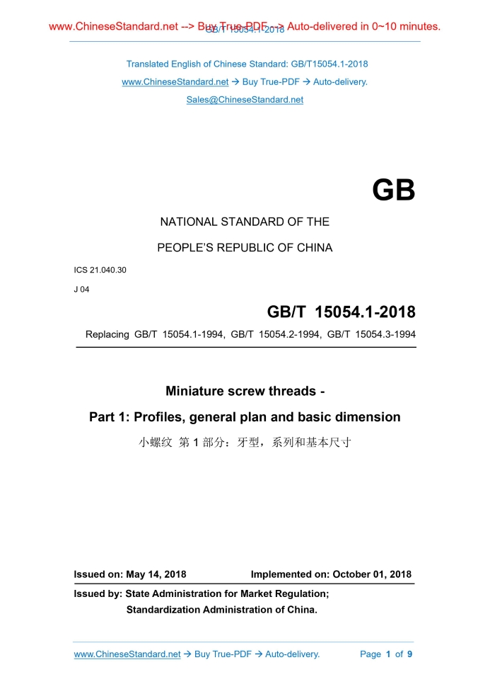 GB/T 15054.1-2018: Miniature screw threads -- Part 1: Profiles, general plan and basic dimensions Delivery: 9 seconds. True-PDF full-copy in English & invoice will be downloaded + auto-delivered via email. See step-by-step procedure Status: Valid GB/T 15054.1: Historical versions