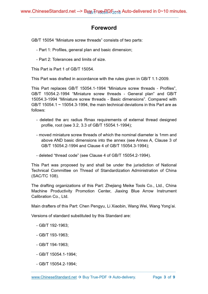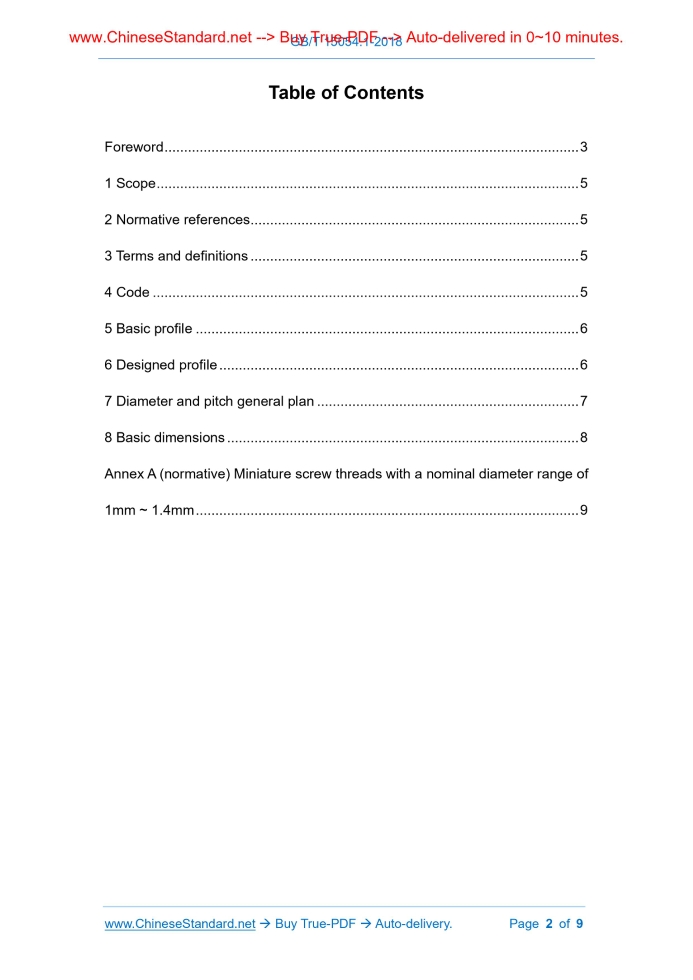 Similar standardsGB/T 15054.1-2018: Miniature screw threads -- Part 1: Profiles, general plan and basic dimensions---This is an excerpt. Full copy of true-PDF in English version (including equations, symbols, images, flow-chart, tables, and figures etc.), auto-downloaded/delivered in 9 seconds, can be purchased online: https://www.ChineseStandard.net/PDF.aspx/GBT15054.1-2018GB NATIONAL STANDARD OF THE PEOPLE’S REPUBLIC OF CHINA ICS 21.040.30 J 04 Replacing GB/T 15054.1-1994, GB/T 15054.2-1994, GB/T 15054.3-1994 Miniature screw threads - Part 1. Profiles, general plan and basic dimension Issued on: MAY 14, 2018 Implemented on: OCTOBER 01, 2018 Issued by. State Administration for Market Regulation; Standardization Administration of China. Table of ContentsForeword ... 3 1 Scope ... 5 2 Normative references ... 5 3 Terms and definitions ... 5 4 Code ... 5 5 Basic profile ... 6 6 Designed profile ... 6 7 Diameter and pitch general plan ... 7 8 Basic dimensions ... 8 Annex A (normative) Miniature screw threads with a nominal diameter range of 1mm ~ 1.4mm ... 9ForewordGB/T 15054 “Miniature screw threads” consists of two parts. - Part 1. Profiles, general plan and basic dimension; - Part 2. Tolerances and limits of size. This Part is Part 1 of GB/T 15054. This Part was drafted in accordance with the rules given in GB/T 1.1-2009. This Part replaces GB/T 15054.1-1994 “Miniature screw threads - Profiles”, GB/T 15054.2-1994 “Miniature screw threads - General plan” and GB/T 15054.3-1994 “Miniature screw threads - Basic dimensions”. Compared with GB/T 15054.1 ~ 15054.3-1994, the main technical deviations in this Part are as follows. - deleted the arc radius Rmax requirements of external thread designed profile, root (see 3.2, 3.3 of GB/T 15054.1-1994); - moved miniature screw threads of which the nominal diameter is 1mm and above AND basic dimensions into the annex (see Annex A, Clause 3 of GB/T 15054.2-1994 and Clause 4 of GB/T 15054.3-1994); - deleted “thread code” (see Clause 4 of GB/T 15054.2-1994). This Part was proposed by and shall be under the jurisdiction of National Technical Committee on Thread of Standardization Administration of China (SAC/TC 108). The drafting organizations of this Part. Zhejiang Meike Tools Co., Ltd., China Machine Productivity Promotion Center, Jiaxing Blue Arrow Instrument Calibration Co., Ltd. Main drafters of this Part. Chen Pengyu, Li Xiaobin, Wang Wei, Wang Yong’ai. Versions of standard substituted by this Standard are. - GB/T 192-1963; - GB/T 193-1963; - GB/T 194-1963; - GB/T 15054.1-1994; - GB/T 15054.2-1994; Miniature screw threads - Part 1. Profiles, general plan and basic dimension1 ScopeThis Part of GB/T 15054 specifies the profiles, diameters of miniature screw threads as well as pitch general plan and basic dimensions. This Part is applicable to miniature screw threads of general use of which the range of nominal diameter is 0.3mm~1.4mm. NOTE. The profile and tolerance of miniature screw threads with a nominal diameter range of 1mm~1.4mm (S) differ from those of ordinary screw threads (M).2 Normative referencesThe following referenced documents are indispensable for the application of this document. For dated references, only the edition cited applies. For undated references, the latest edition of the referenced document (including any amendments) applies. GB/T 14791, The terms of screw threads3 Terms and definitionsFor the purposes of this document, the terms and definitions defined in GB/T 14791 apply.4 CodeThe following codes apply to this document. D Basic large diameter of internal thread (nominal diameter) D2 Basic medium diameter of internal thread D1 Basic small diameter of internal thread d Basic large diameter of external thread (nominal diameter) d2 Basic medium diameter of external thread d1 Basic small diameter of external thread (on basic profile) d3 Root small diameter of external thread (on designed profile) P Pitch ......Source: Above contents are excerpted from the full-copy PDF -- translated/reviewed by: www.ChineseStandard.net / Wayne Zheng et al. Tips & Frequently Asked Questions:Question 1: How long will the true-PDF of English version of GB/T 15054.1-2018 be delivered?Answer: The full copy PDF of English version of GB/T 15054.1-2018 can be downloaded in 9 seconds, and it will also be emailed to you in 9 seconds (double mechanisms to ensure the delivery reliably), with PDF-invoice.Question 2: Can I share the purchased PDF of GB/T 15054.1-2018_English with my colleagues?Answer: Yes. The purchased PDF of GB/T 15054.1-2018_English will be deemed to be sold to your employer/organization who actually paid for it, including your colleagues and your employer's intranet.Question 3: Does the price include tax/VAT?Answer: Yes. Our tax invoice, downloaded/delivered in 9 seconds, includes all tax/VAT and complies with 100+ countries' tax regulations (tax exempted in 100+ countries) -- See Avoidance of Double Taxation Agreements (DTAs): List of DTAs signed between Singapore and 100+ countriesQuestion 4: Do you accept my currency other than USD?Answer: Yes. www.ChineseStandard.us -- GB/T 15054.1-2018 -- Click this link and select your country/currency to pay, the exact amount in your currency will be printed on the invoice. Full PDF will also be downloaded/emailed in 9 seconds.Question 5: Should I purchase the latest version GB/T 15054.1-2018?Answer: Yes. Unless special scenarios such as technical constraints or academic study, you should always prioritize to purchase the latest version GB/T 15054.1-2018 even if the enforcement date is in future. Complying with the latest version means that, by default, it also complies with all the earlier versions, technically.How to buy and download a true PDF of English version of GB/T 15054.1-2018?A step-by-step guide to download PDF of GB/T 15054.1-2018_EnglishStep 1: Visit website https://www.ChineseStandard.net (Pay in USD), or https://www.ChineseStandard.us (Pay in any currencies s