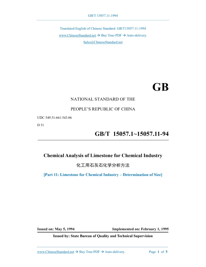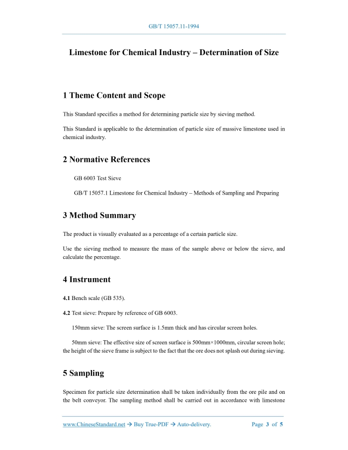 GB/T 15057.11-1994: Limestone for chemical industry. Determination of size Delivery: 9 seconds. True-PDF full-copy in English & invoice will be downloaded + auto-delivered via email. See step-by-step procedure