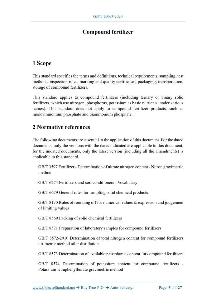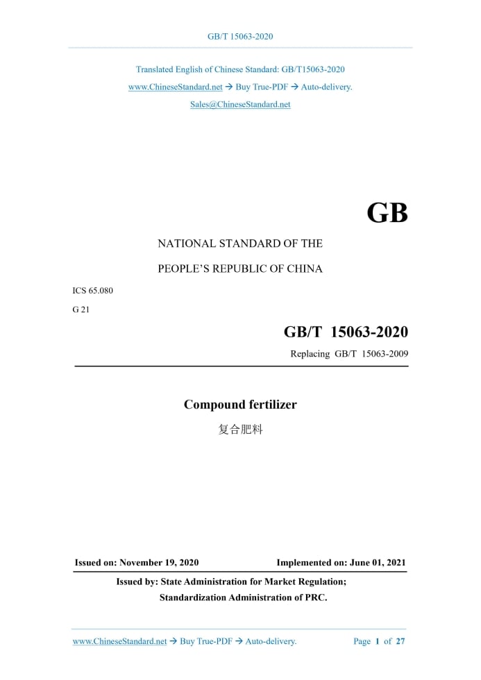 GB/T 15063-2020: Compound fertilizer Delivery: 9 seconds. True-PDF full-copy in English & invoice will be downloaded + auto-delivered via email. See step-by-step procedure Status: Valid GB/T 15063: Historical versions
