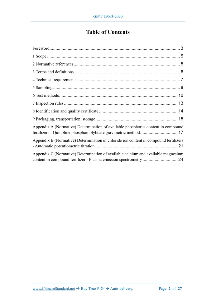 Similar standardsGB/T 15063-2020: Compound fertilizer---This is an excerpt. Full copy of true-PDF in English version (including equations, symbols, images, flow-chart, tables, and figures etc.), auto-downloaded/delivered in 9 seconds, can be purchased online: https://www.ChineseStandard.net/PDF.aspx/GBT15063-2020NATIONAL STANDARD OF THE PEOPLE’S REPUBLIC OF CHINA ICS 65.080 G 21 Replacing GB/T 15063-2009 Compound fertilizer 复合肥料 Issued on. NOVEMBER 19, 2020 Implemented on. JUNE 01, 2021 Issued by. State Administration for Market Regulation; Standardization Administration of PRC. Table of ContentsForeword... 3 1 Scope... 5 2 Normative references... 5 3 Terms and definitions... 6 4 Technical requirements... 7 5 Sampling... 8 6 Test methods... 10 7 Inspection rules... 13 8 Identification and quality certificate... 14 9 Packaging, transportation, storage... 15 Appendix A (Normative) Determination of available phosphorus content in compound fertilizers - Quinoline phosphomolybdate gravimetric method... 17 Appendix B (Normative) Determination of chloride ion content in compound fertilizers - Automatic potentiometric titration... 21 Appendix C (Normative) Determination of available calcium and available magnesium content in compound fertilizer - Plasma emission spectrometry... 241 ScopeThis standard specifies the terms and definitions, technical requirements, sampling, test methods, inspection rules, marking and quality certificates, packaging, transportation, storage of compound fertilizers. This standard applies to compound fertilizers (including ternary or binary solid fertilizers, which use nitrogen, phosphorus, potassium as basic nutrients, under various names). This standard does not apply to compound fertilizer products, such as monoammonium phosphate and diammonium phosphate.2 Normative referencesThe following documents are essential to the application of this document. For the dated documents, only the versions with the dates indicated are applicable to this document; for the undated documents, only the latest version (including all the amendments) is applicable to this standard. GB/T 3597 Fertilizer - Determination of nitrate nitrogen content - Nitron gravimetric method GB/T 6274 Fertilizers and soil conditioners - Vocabulary GB/T 6679 General rules for sampling solid chemical products GB/T 8170 Rules of rounding off for numerical values & expression and judgement of limiting values GB/T 8569 Packing of solid chemical fertilizers GB/T 8571 Preparation of laboratory samples for compound fertilizers GB/T 8572-2010 Determination of total nitrogen content for compound fertilizers titrimetric method after distillation GB/T 8573 Determination of available phosphorus content for compound fertilizers GB/T 8574 Determination of potassium content for compound fertilizers - Potassium tetraphenylborate gravimetric method GB/T 8576 Determination of free water for compound fertilizers - Vacuum oven method GB/T 8577 Determination of free water for compound fertilizers - Karl Fischer method3 Terms and definitionsThe terms and definitions, as defined in GB/T 6274, as well as the following terms and definitions, apply to this document. 3.1 Compound fertilizer Fertilizers, which are made by chemical methods and/or physical methods, indicating the content of at least two of the three nutrients of nitrogen, phosphorus, potassium. 3.2 Aggregate sample The sample, which is combined from the individual samples of the inspection lot. Note. For statistical analysis, the aggregate samples can be divided into several samples. for separate subdivision and analysis.4 Technical requirements4.1 Appearance Granular, strip or flake products, which have no mechanical impurities. 4.2 Technical indicators The product shall meet the technical indicators in Table 1.At the same time, it shall meet the indicated values on the packaging container. 4.3 Limit requirements for toxic and hazardous substances The biuret content of the products, which are indicated in the packaging container or the instructions for use that, it is suitable for simultaneous sowing of seed fertilizers, shall be ≤ 0.8%; the limit requirements of other toxic and harmful substances shall be implemented in accordance with GB 38400.5 Sampling5.1 Collection of aggregate samples 5.1.1 Bagged products 5.1.1.1 When the total number of bags, for each batch of products, does not exceed 512, it shall determine the number of sampling bags, according to Table 2.When the total number of bags of each batch of products is greater than 512, the minimum number of sampling bags shall be determined, according to the calculation result of formula (1). If there are decimals, it shall be rounded off to an integer. 5.1.2 Bulk products It is carried out, in accordance with the requirements of GB/T 6679. 5.2 Sample reduction Quickly mix the collected aggregate sample uniformly. Use a divider or quartering method, to reduce the sample to about 1 kg. Then divide it into two parts, which are divided into two clean and dry glass or plastic bottles with ground stoppers (the quality inspection department of the manufacturer can use a clean and dry plastic Ziplock bag, to hold the sample). Seal and label it. Indicate the name of the manufacturer, product name, batch number or production date, sampling date and the name of the sampler. One bottle is used for product inspection; the other bottle is retained for two month, for future reference.6 Test methods6.1 General provisions Except for appearance and particle size, make parallel determinations of two sets of samples. The reagents, solutions, water, which is used in this standard, shall comply with the provisions of HG/T 2843, when the specifications and preparation methods are not specified. 6.2 Visual inspection Use the sample in 5.2, to make inspection visually. 6.3 Total nutrients 6.3.1 Determination of total nitrogen content 6.3.2 Determination of available phosphorus content and calculation of the percentage of wat