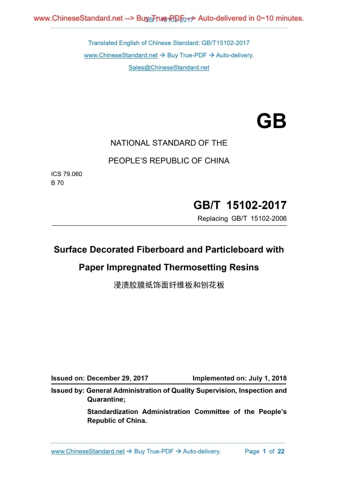 GB/T 15102-2017: Surface Decorated Fiberboard and Particleboard with Paper Impregnated Thermosetting Resins Delivery: 9 seconds. True-PDF full-copy in English & invoice will be downloaded + auto-delivered via email. See step-by-step procedure Status: Valid GB/T 15102: Historical versions