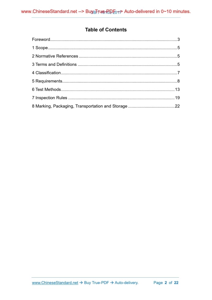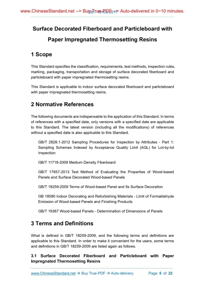 Similar standardsGB/T 15102-2017: Surface Decorated Fiberboard and Particleboard with Paper Impregnated Thermosetting Resins---This is an excerpt. Full copy of true-PDF in English version (including equations, symbols, images, flow-chart, tables, and figures etc.), auto-downloaded/delivered in 9 seconds, can be purchased online: https://www.ChineseStandard.net/PDF.aspx/GBT15102-2017 GB NATIONAL STANDARD OF THE PEOPLE’S REPUBLIC OF CHINA ICS 79.060 B 70 Replacing GB/T 15102-2006 Surface Decorated Fiberboard and Particleboard with Paper Impregnated Thermosetting Resins Issued on: DECEMBER 29, 2017 Implemented on: JULY 1, 2018 Issued by. General Administration of Quality Supervision, Inspection and Quarantine; Standardization Administration Committee of the People’s Republic of China. Table of ContentsForeword ... 3 1 Scope ... 5 2 Normative References ... 5 3 Terms and Definitions ... 5 4 Classification ... 7 5 Requirements... 8 6 Test Methods ... 13 7 Inspection Rules ... 19 8 Marking, Packaging, Transportation and Storage ... 22 Surface Decorated Fiberboard and Particleboard with Paper Impregnated Thermosetting Resins1 ScopeThis Standard specifies the classification, requirements, test methods, inspection rules, marking, packaging, transportation and storage of surface decorated fiberboard and particleboard with paper impregnated thermosetting resins. This Standard is applicable to indoor surface decorated fiberboard and particleboard with paper impregnated thermosetting resins.2 Normative ReferencesThe following documents are indispensable to the application of this Standard. In terms of references with a specified date, only versions with a specified date are applicable to this Standard. The latest version (including all the modifications) of references without a specified date is also applicable to this Standard. GB/T 2828.1-2012 Sampling Procedures for Inspection by Attributes - Part 1. Sampling Schemes Indexed by Acceptance Quality Limit (AQL) for Lot-by-lot Inspection GB/T 11718-2009 Medium Density Fiberboard GB/T 17657-2013 Test Method of Evaluating the Properties of Wood-based Panels and Surface Decorated Wood-based Panels GB/T 18259-2009 Terms of Wood-based Panel and Its Surface Decoration GB 18580 Indoor Decorating and Refurbishing Materials - Limit of Formaldehyde Emission of Wood-based Panels and Finishing Products GB/T 19367 Wood-based Panels - Determination of Dimensions of Panels3 Terms and DefinitionsWhat is defined in GB/T 18259-2009, and the following terms and definitions are applicable to this Standard. In order to make it convenient for the users, some terms and definitions in GB/T 18259-2009 are listed again as follows. 3.1 Surface Decorated Fiberboard and Particleboard with Paper Impregnated Thermosetting Resins 3.9 Dents Dents refers to jagged defects on the decorative panel layer during the processing of the edging. NOTE. Definition 2.2.4.69 in GB/T 18259-2009 is modified. 3.10 Blisters Blisters refers to abnormal protrusions on the surface caused by gas. NOTE. Definition 2.1.73 in GB/T 18259-2009 is modified. 3.11 Bulge Bulge refers to abnormal protrusions on the surface caused by solid objects. NOTE. Definition 2.2.4.70 in GB/T 18259-2009 is modified. 3.12 Light Fastness Light fastness refers to the surface color’s resistance to sunlight or the illumination of artificial light. NOTE. Definition 2.2.4.72 in GB/T 18259-2009 is modified.4 Classification4.1 In terms of substrate. ---Surface decorated fiberboard with paper impregnated thermosetting resins; ---Surface decorated particleboard with paper impregnated thermosetting resins. 4.2 In terms of decorative panel. ---Single-sided surface decorated fiberboard and particleboard with paper impregnated thermosetting resins; ---Double-sided surface decorated fiberboard and particleboard with paper impregnated thermosetting resins. 4.3 In terms of surface condition. ---Plane surface decorated fiberboard and particleboard with paper impregnated thermosetting resins; ---Embossed surface decorated fiberboard and particleboard with paper 6.2.1.1 Micrometer. division value. 0.01 mm. 6.2.1.2 Steel ruler. division value. 0.5 mm. 6.2.1.3 Steel tape. division value. 1 mm. 6.2.1.4 Mechanical square. equipped with two arms (length. 1,000 ± 1 mm), for the measurement of angular deviation between the adjacent side of the board and right angle. The mechanical square shall be accurate to 0.2 mm under the condition of 1,000 mm. 6.2.1.5 Metal wire. its diameter shall be not more than 0.5 mm. 6.2.2 Length and width measurement Length and width measurement shall comply with the stipulation in GB/T 19367-2009. 6.2.3 Thickness measurement Thickness measurement shall comply with the stipulation in GB/T 19367-2009. 6.2.4 Perpendicularity test Perpendicularity test shall comply with the stipulation in GB/T 19367-2009. 6.2.5 Edge straightness measurement Edge straightness measurement shall comply with the stipulation in GB/T 19367-2009. 6.2.6 Evenness Evenness test shall comply with the stipulation in GB/T 19367-2009. 6.3 Test Methods of Physical and Chemical Properties 6.3.1 Preparation and dimension of sample and test piece 6.3.1.1 Sample and test piece shall be taken from products that are kept for over 24 h after manufacture. 6.3.1.2 Surface decorated fiberboard and particleboard with paper impregnated thermosetting resins shall be cut into 5 samples in accordance with Figure 1. Each sample shall be marked with a number and a symbol of “” in the top right corner. Sample 1, Sample 3 and Sample 5 shall be adopted to prepare “numbered” test pieces; Sample 2 and Sample 4 shall be adopted to prepare “random” test pieces. Please refer to Table 5 for the dimension, quantity and number of the test pieces. In terms of the prepared test pieces, the edges shall be straight, and two adjacent edges shall form a right angle. The specification of numbered test pieces that are prepared from Sample 1, Sample 3 and Sample 5 shall comply 