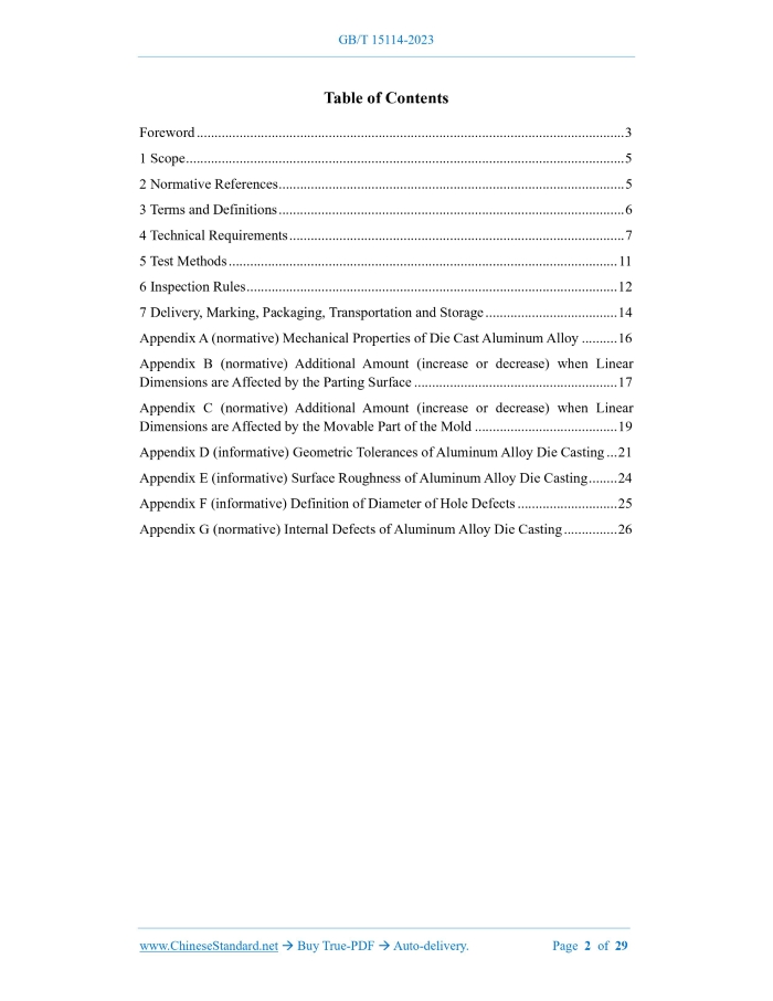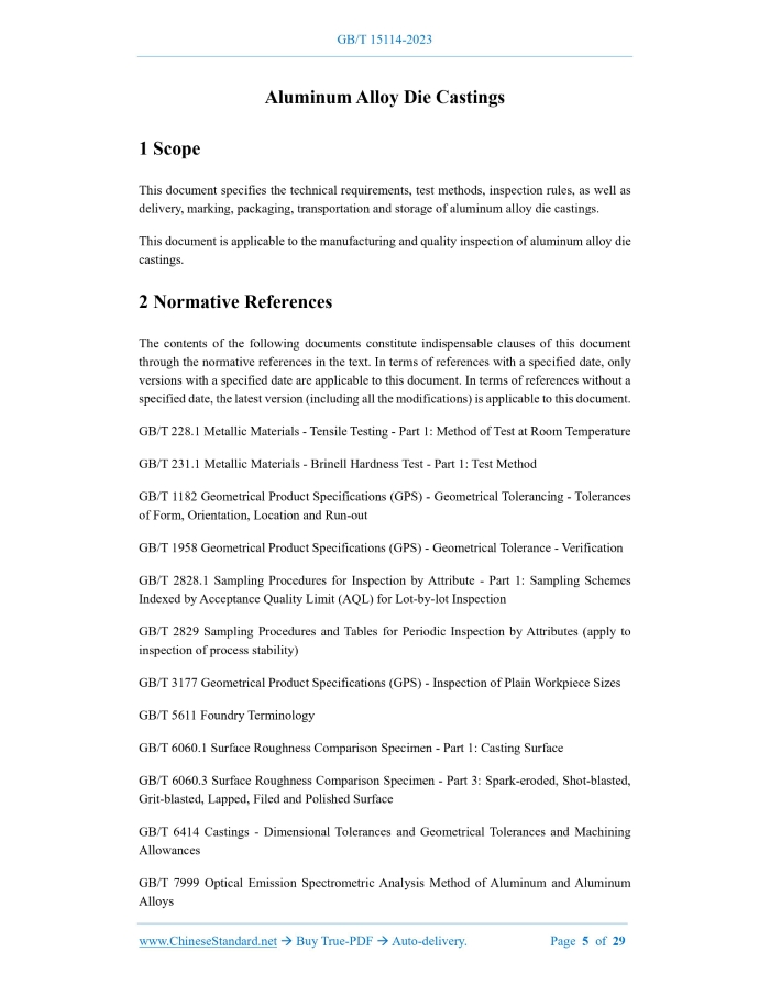 Similar standardsGB/T 15114-2023: Aluminum alloy die castings---This is an excerpt. Full copy of true-PDF in English version (including equations, symbols, images, flow-chart, tables, and figures etc.), auto-downloaded/delivered in 9 seconds, can be purchased online: https://www.ChineseStandard.net/PDF.aspx/GBT15114-2023GB NATIONAL STANDARD OF THE PEOPLE’S REPUBLIC OF CHINA ICS 77.120.10 CCS J 31 Replacing GB/T 15114-2009 Aluminum Alloy Die Castings Issued on. MAY 23, 2023 Implemented on. MAY 23, 2023 Issued by. State Administration for Market Regulation; Standardization Administration of the People’s Republic of China. Table of ContentsForeword... 3 1 Scope... 5 2 Normative References... 5 3 Terms and Definitions... 6 4 Technical Requirements... 7 5 Test Methods... 11 6 Inspection Rules... 12 7 Delivery, Marking, Packaging, Transportation and Storage... 14 Appendix A (normative) Mechanical Properties of Die Cast Aluminum Alloy... 16 Appendix B (normative) Additional Amount (increase or decrease) when Linear Dimensions are Affected by the Parting Surface... 17 Appendix C (normative) Additional Amount (increase or decrease) when Linear Dimensions are Affected by the Movable Part of the Mold... 19 Appendix D (informative) Geometric Tolerances of Aluminum Alloy Die Casting... 21 Appendix E (informative) Surface Roughness of Aluminum Alloy Die Casting... 24 Appendix F (informative) Definition of Diameter of Hole Defects... 25 Appendix G (normative) Internal Defects of Aluminum Alloy Die Casting... 261 ScopeThis document specifies the technical requirements, test methods, inspection rules, as well as delivery, marking, packaging, transportation and storage of aluminum alloy die castings. This document is applicable to the manufacturing and quality inspection of aluminum alloy die castings.2 Normative ReferencesThe contents of the following documents constitute indispensable clauses of this document through the normative references in the text. In terms of references with a specified date, only versions with a specified date are applicable to this document. In terms of references without a specified date, the latest version (including all the modifications) is applicable to this document. GB/T 228.1 Metallic Materials - Tensile Testing - Part 1.Method of Test at Room Temperature GB/T 231.1 Metallic Materials - Brinell Hardness Test - Part 1.Test Method GB/T 1182 Geometrical Product Specifications (GPS) - Geometrical Tolerancing - Tolerances of Form, Orientation, Location and Run-out GB/T 1958 Geometrical Product Specifications (GPS) - Geometrical Tolerance - Verification GB/T 2828.1 Sampling Procedures for Inspection by Attribute - Part 1.Sampling Schemes Indexed by Acceptance Quality Limit (AQL) for Lot-by-lot Inspection GB/T 2829 Sampling Procedures and Tables for Periodic Inspection by Attributes (apply to inspection of process stability) GB/T 3177 Geometrical Product Specifications (GPS) - Inspection of Plain Workpiece Sizes GB/T 5611 Foundry Terminology GB/T 6060.1 Surface Roughness Comparison Specimen - Part 1.Casting Surface GB/T 6060.3 Surface Roughness Comparison Specimen - Part 3.Spark-eroded, Shot-blasted, Grit-blasted, Lapped, Filed and Polished Surface GB/T 6414 Castings - Dimensional Tolerances and Geometrical Tolerances and Machining Allowances3 Terms and DefinitionsWhat is defined in GB/T 5611, and the following terms and definitions are applicable to this document. 3.1 aluminum alloy die casting Aluminum alloy die casting refers to an aluminum alloy casting produced through the mode of die casting using high-pressure die-casting equipment. 3.2 structural part Structural part refers to the load-bearing part or force-bearing part of aluminum alloy die casting (3.1) that is closely related to safety during use. 3.3 functional part Functional part refers to a component with functional characteristics.4 Technical Requirements4.1 Chemical Composition The chemical composition of aluminum alloy die casting shall comply with the stipulations of Table 1. 4.2 Mechanical Properties 4.2.1 The mechanical properties of aluminum alloy die castings are based on the mechanical properties determined on Type A tensile specimens specified in GB/T 13822 as the reference basis for inspection. 4.2.2 The typical mechanical properties determined using Type A tensile specimens specified in GB/T 13822 shall comply with the stipulations of Appendix A. 4.2.3 When it is necessary to use aluminum alloy die casting body for sampling inspection, the requirements for the mechanical properties shall be determined by the demand-side and the supply-side through negotiation. 4.3 Dimensions 4.3.1 The geometrical shapes and dimensions of aluminum alloy die casting shall comply with the stipulations of the casting drawings. 4.3.2 The dimensional tolerances of aluminum alloy die casting shall comply with the stipulations of GB/T 6414.An additional amount shall be added to the dimensional tolerances affected by the parting surface and the movable part of the mold, and shall comply with the stipulations of Appendix B and Appendix C. When there are special stipulations and requirements, they shall be indicated on the drawings. 4.3.5 The machining allowances of aluminum alloy die casting shall comply with the stipulations of GB/T 6414.When there are special stipulations and requirements, the machining allowances shall be indicated on the drawings. 4.4 Mass The selection of mass tolerance grade of aluminum alloy die casting shall comply with the stipulations of Grade MT4 ~ MT7 of GB/T 11351.If there are special stipulations and requirements, they shall be determined by the demand-side and the supply-side through negotiation. 4.5 Surface Quality 4.5.1 The surface roughness of aluminum alloy die casting shall comply with the requirements of the drawings or the demand-side. If there are no requirements, please refer to Appendix E. 4.5.2 Aluminum alloy die casting shall not have cracks and any penetrating defects. 4.5.3 Alu
