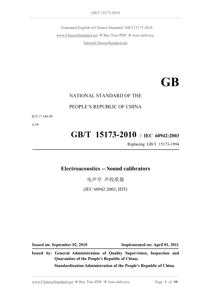 GB/T 15173-2010: Electroacoustics - Sound calibrators Delivery: 9 seconds. True-PDF full-copy in English & invoice will be downloaded + auto-delivered via email. See step-by-step procedure Status: Valid GB/T 15173: Historical versions