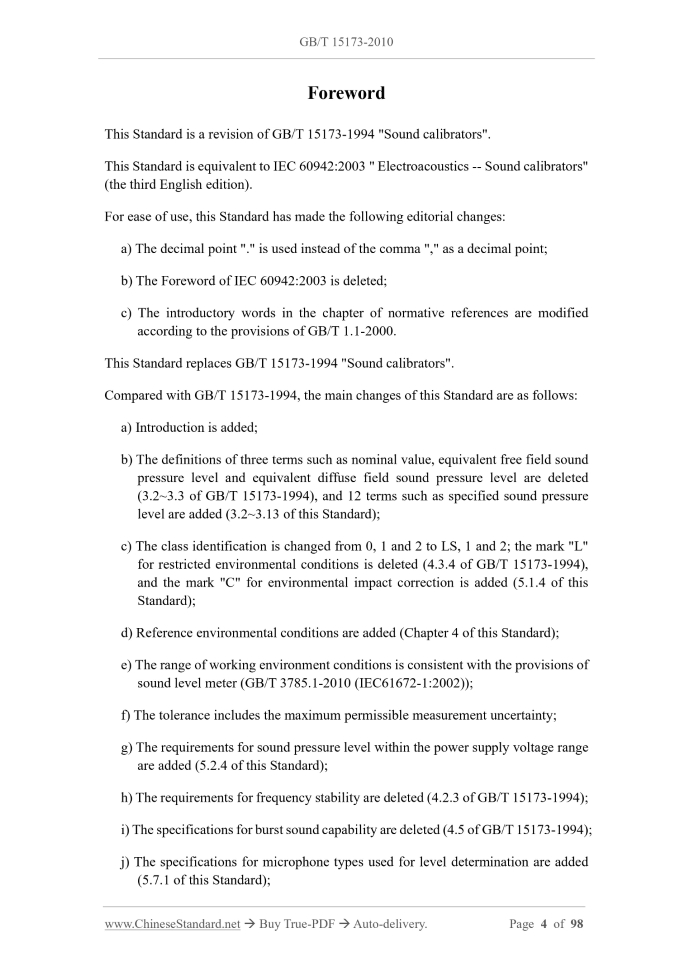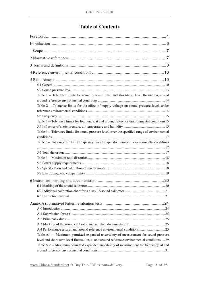 Similar standardsGB/T 15173-2010: Electroacoustics - Sound calibrators---This is an excerpt. Full copy of true-PDF in English version (including equations, symbols, images, flow-chart, tables, and figures etc.), auto-downloaded/delivered in 9 seconds, can be purchased online: https://www.ChineseStandard.net/PDF.aspx/GBT15173-2010GB NATIONAL STANDARD OF THE PEOPLE’S REPUBLIC OF CHINA ICS 17.140.50 A 59 GB/T 15173-2010 / IEC 60942.2003 Replacing GB/T 15173-1994 Electroacoustics -- Sound calibrators (IEC 60942.2003, IDT) Issued on: SEPTEMBER 02, 2010 Implemented on: APRIL 01, 2011 Issued by. General Administration of Quality Supervision, Inspection and Quarantine of the People's Republic of China; Standardization Administration of the People's Republic of China. Table of ContentsForeword... 4 Introduction... 6 1 Scope... 7 2 Normative references... 7 3 Terms and definitions... 8 4 Reference environmental conditions... 10 5 Requirements... 10 5.1 General... 10 5.2 Sound pressure level... 13 Table 1 -- Tolerance limits for sound pressure level and short-term level fluctuation, at and around reference environmental conditions... 14 Table 2 -- Tolerance limits for the effect of supply voltage on sound pressure level, under reference environmental conditions... 14 5.3 Frequency... 15 Table 3 -- Tolerance limits for frequency, at and around reference environmental conditions 15 5.4 Influence of static pressure, air temperature and humidity... 15 Table 4 -- Tolerance limits for sound pressure level, over the specified range of environmental conditions... 17 Table 5 -- Tolerance limits for frequency, over the specified rang e of environmental conditions ... 17 5.5 Total distortion... 17 Table 6 -- Maximum total distortion... 18 5.6 Power supply requirements... 18 5.7 Specification and calibration of microphones... 18 5.8 Electromagnetic compatibility... 19 6 Instrument marking and documentation... 20 6.1 Marking of the sound calibrator... 20 6.2 Individual calibration chart for a class LS sound calibrator... 21 6.3 Instruction manual... 21 Annex A (normative) Pattern evaluation tests... 24 A.0 Introduction... 24 A.1 Submission for test... 25 A.2 Principal values... 25 A.3 Marking of the sound calibrator and supplied documentation... 25 A.4 Performance tests at and around reference environmental conditions... 25 Table A.1 -- Maximum permitted expanded uncertainty of measurement for sound pressure level and short-term level fluctuation, at and around reference environmental conditions... 29 Table A.2 -- Maximum permitted expanded uncertainty of measurement for frequency, at and around reference environmental conditions... 31ForewordThis Standard is a revision of GB/T 15173-1994 "Sound calibrators". This Standard is equivalent to IEC 60942.2003 " Electroacoustics -- Sound calibrators" (the third English edition). For ease of use, this Standard has made the following editorial changes. a) The decimal point "." is used instead of the comma "," as a decimal point; b) The Foreword of IEC 60942.2003 is deleted; c) The introductory words in the chapter of normative references are modified according to the provisions of GB/T 1.1-2000. This Standard replaces GB/T 15173-1994 "Sound calibrators". Compared with GB/T 15173-1994, the main changes of this Standard are as follows. a) Introduction is added; b) The definitions of three terms such as nominal value, equivalent free field sound pressure level and equivalent diffuse field sound pressure level are deleted (3.2~3.3 of GB/T 15173-1994), and 12 terms such as specified sound pressure level are added (3.2~3.13 of this Standard); c) The class identification is changed from 0, 1 and 2 to LS, 1 and 2; the mark "L" for restricted environmental conditions is deleted (4.3.4 of GB/T 15173-1994), and the mark "C" for environmental impact correction is added (5.1.4 of this Standard); d) Reference environmental conditions are added (Chapter 4 of this Standard); e) The range of working environment conditions is consistent with the provisions of sound level meter (GB/T 3785.1-2010 (IEC61672-1.2002)); f) The tolerance includes the maximum permissible measurement uncertainty; g) The requirements for sound pressure level within the power supply voltage range are added (5.2.4 of this Standard); h) The requirements for frequency stability are deleted (4.2.3 of GB/T 15173-1994); i) The specifications for burst sound capability are deleted (4.5 of GB/T 15173-1994); j) The specifications for microphone types used for level determination are added (5.7.1 of this Standard); Electroacoustics -- Sound calibrators1 ScopeThis Standard specifies the performance requirements for three classes of sound calibrator. laboratory standard (class LS), class 1 and class 2.Tolerance limits are smallest for class LS and greatest for class 2 instruments. Class LS sound calibrators are normally used only in the laboratory; class 1 and class 2 are considered as sound calibrators for field use. A class 1 sound calibrator is primarily intended for use with a class 1 sound level meter and a class 2 sound calibrator primarily with a class 2 sound level meter, as specified in IEC 61672.1. The tolerance limits for class LS sound calibrators are based on the use of a laboratory standard microphone, as specified in IEC 61094-1, for demonstrations of conformance to the requirements of this Standard. The tolerance limits for class 1 and class 2 sound calibrators are based on the use of a working standard microphone, as specified in GB/T 20441.4, for demonstrations of conformance to the requirements of this Standard. A multi-level and multi-frequency sound calibrator has the same class designation for all sound pressure level and frequency combinations for which the instruction manual states that the instrument conforms to the requirements of this Standard. This Standard does not include requirements for equivalent free-field or random- incidence sound pressure levels, such as may be used in the overall sensit