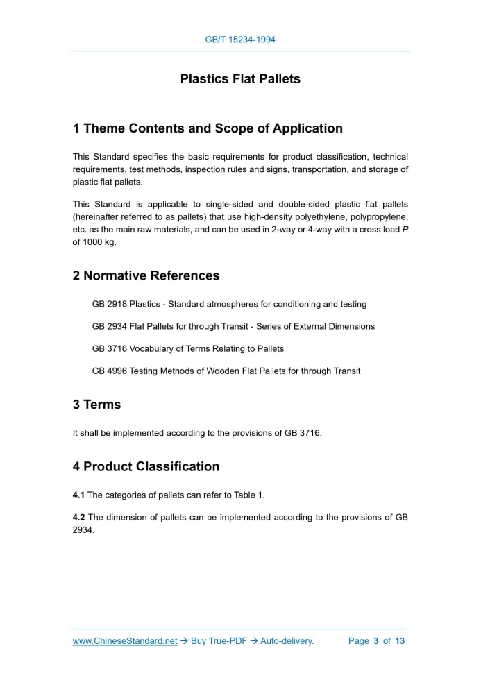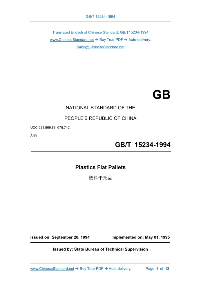GB/T 15234-1994: Plastics flat pallets Delivery: 9 seconds. True-PDF full-copy in English & invoice will be downloaded + auto-delivered via email. See step-by-step procedure GB/T 15234: Historical versions