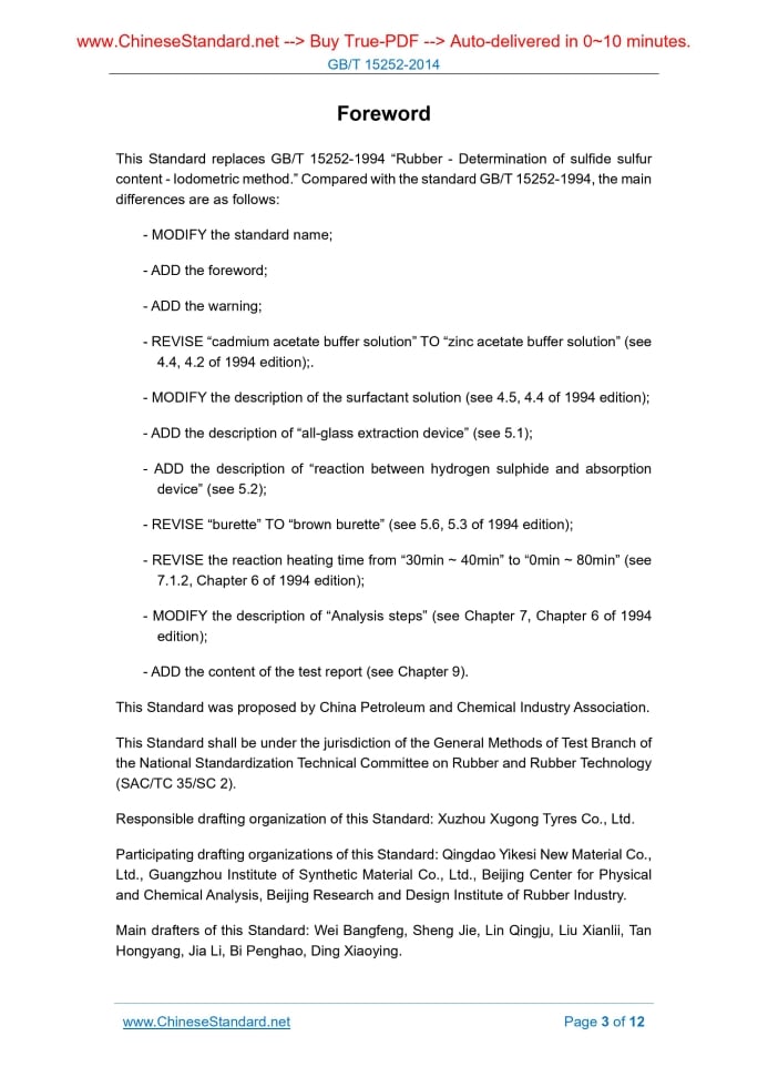 Similar standardsGB/T 15252-2014: Plastics and ebonite - Determination of indentation hardness by means of a durometer (shore hardness)---This is an excerpt. Full copy of true-PDF in English version (including equations, symbols, images, flow-chart, tables, and figures etc.), auto-downloaded/delivered in 9 seconds, can be purchased online: https://www.ChineseStandard.net/PDF.aspx/GBT15252-2014 GB CS 83.060 G 40 NATIONAL STANDARD OF THE PEOPLE'S REPUBLIC OF CHINA Replacing GB/T 15252-1994 Rubber, compounded or vulcanized - Determination of sulfide sulfur content - Lodometric method Issued on: DECEMBER 22, 2014 Implemented on: JUNE 1, 2015 Issued by. General Administration of Quality Supervision, Inspection and Quarantine of the People's Republic of China; Standardization Administration of the People's Republic of China. Table of ContentsForeword ... 3 Introduction ... 5 1 Scope ... 6 2 Normative references ... 6 3 Principle ... 6 4 Reagents and materials ... 7 5 Apparatus ... 7 6 Sampling and sample preparation ... 10 7 Procedures ... 10 8 Expression of analysis results ... 11 9 Test report ... 11ForewordThis Standard replaces GB/T 15252-1994 “Rubber - Determination of sulfide sulfur content - Iodometric method.” Compared with the standard GB/T 15252-1994, the main differences are as follows. - MODIFY the standard name; - ADD the foreword; - ADD the warning; - REVISE “cadmium acetate buffer solution” TO “zinc acetate buffer solution” (see 4.4, 4.2 of 1994 edition);. - MODIFY the description of the surfactant solution (see 4.5, 4.4 of 1994 edition); - ADD the description of “all-glass extraction device” (see 5.1); - ADD the description of “reaction between hydrogen sulphide and absorption device” (see 5.2); - REVISE “burette” TO “brown burette” (see 5.6, 5.3 of 1994 edition); - REVISE the reaction heating time from “30min ~ 40min” to “0min ~ 80min” (see 7.1.2, Chapter 6 of 1994 edition); - MODIFY the description of “Analysis steps” (see Chapter 7, Chapter 6 of 1994 edition); - ADD the content of the test report (see Chapter 9). This Standard was proposed by China Petroleum and Chemical Industry Association. This Standard shall be under the jurisdiction of the General Methods of Test Branch of the National Standardization Technical Committee on Rubber and Rubber Technology (SAC/TC 35/SC 2). Responsible drafting organization of this Standard. Xuzhou Xugong Tyres Co., Ltd. Participating drafting organizations of this Standard. Qingdao Yikesi New Material Co., Ltd., Guangzhou Institute of Synthetic Material Co., Ltd., Beijing Center for Physical and Chemical Analysis, Beijing Research and Design Institute of Rubber Industry. Main drafters of this Standard. Wei Bangfeng, Sheng Jie, Lin Qingju, Liu Xianlii, Tan Hongyang, Jia Li, Bi Penghao, Ding Xiaoying. Rubber, compounded or vulcanized - Determination of sulfide sulfur content - Lodometric method Warning. Personnel who use this Standard shall have experience of regular laboratory work. This Standard does not point out all possible safety issues; users have the responsibility to take appropriate safety and health measures, and to ensure that it complies with the conditions specified in relevant national regulations.1 ScopeThis Standard specifies the test methods for determination of sulfide sulfur content in compounded and vulcanized rubber by iodometric method. This Standard applies to compounded and vulcanized rubber of halogenated rubber, nitrile rubber and hydrocarbon rubber (including natural rubber).2 Normative referencesThe following documents are essential to the application of this document. For the dated documents, only the versions with the dates indicated are applicable to this document; for the undated documents, only the latest version (including all the amendments) are applicable to this document. GB/T 601-2002 Chemical reagent - Preparations of standard volumetric solutions GB/T 603-2002 Chemical reagent - Preparations of reagent solutions for use in test methods GB/T 3516-2006 Rubber - Determination of solvent extract GB/T 6682-2008 Water for analytical laboratory use - Specification and test methods GB/T 17783-1999 Rubber, vulcanized - Preparation of samples and test pieces - Chemical tests3 PrincipleFor rubbers extracted by acetone, use the mixture of hydrochloric acid and acetic acid 5.5 25mL pipette (grade A). 5.6 Brown burette.6 Sampling and sample preparation6.1 CUT the needed samples from vulcanized rubber specimen and finished rubber products according to the specifications in GB/T 17783-1999. For compounded rubber, it shall be made into compounded rubber slices by open mills with a roll pitch of not more than 0.5mm for 6 times at room temperature, and directly cut the test samples into small particles with a side length of less than 1mm. Vulcanized rubber is directly cut into small particles with a side length of less than 1mm. 6.2 WEIGH 0.5g ~ 2.0g of sample, accurate to 0.1mg. 6.3 WRAP the sample with filter paper, PLACE the sample in the the extraction unit (5.1) containing acetone (4.2) to extract for 6h ~ 8h. 6.4 TRANSFER the sample from Soxhlet extraction bottle to a weighing bottle; DRY in a 70°C oven for 15 min; PUT the dried sample into the extraction bottle (A).7 Procedures7.1 Determination 7.1.1 INSTALL the extraction bottle (A) at the unit shown in Figure 2, all connectors are sealed with glycerin or petrolatum (4.10). ADD 100mL of zinc acetate buffer solution (4.4) and 1mL of surfactant (4.5) into a conical flask (I). ADD zinc acetate buffer solution into the gas washing bottle (B and C), until it fills half cylinder capacity. INLET nitrogen (4.9), then adjust the flow rate of nitrogen in the absorption bottle to about one bubble per second. 7.1.2 ADD 50mL of hydrochloric acid - acetic acid mixture solution (4.3) slowly from the separating funnel (G) to the extraction bottle (A); HEAT slowly to boiling; MAINTAIN at micro-boiling for 60min ~ 80min. After the terminat