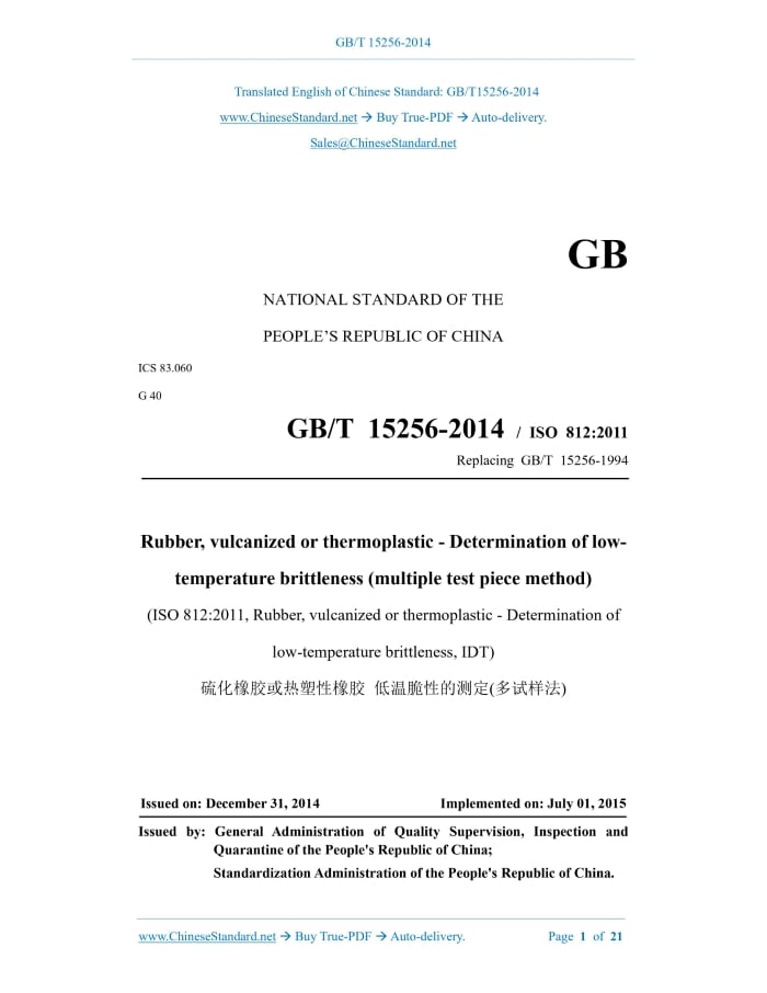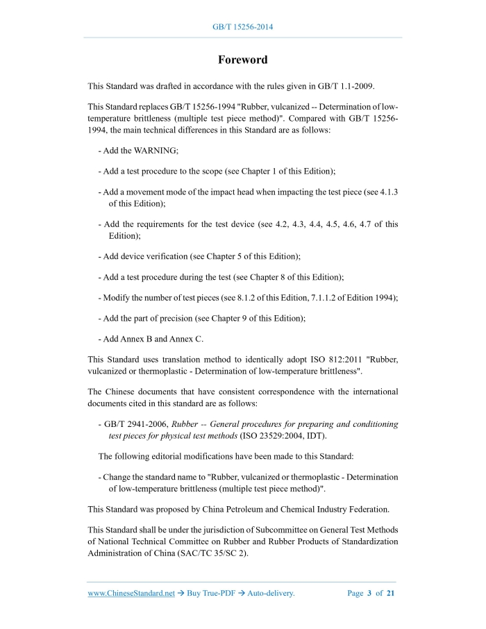 Similar standardsGB/T 15256-2014: Rubber or thermoplastic rubber, vulcanized -- Determination of low-temperature brittleness (multiple test piece method)---This is an excerpt. Full copy of true-PDF in English version (including equations, symbols, images, flow-chart, tables, and figures etc.), auto-downloaded/delivered in 9 seconds, can be purchased online: https://www.ChineseStandard.net/PDF.aspx/GBT15256-2014 GB NATIONAL STANDARD OF THE PEOPLE’S REPUBLIC OF CHINA ICS 83.060 G 40 GB/T 15256-2014 / ISO 812:2011 Replacing GB/T 15256-1994 Rubber, vulcanized or thermoplastic - Determination of low- temperature brittleness (multiple test piece method) (ISO 812:2011, Rubber, vulcanized or thermoplastic - Determination of low-temperature brittleness, IDT) ISSUED ON: DECEMBER 31, 2014 IMPLEMENTED ON: JULY 01, 2015 Issued by: General Administration of Quality Supervision, Inspection and Quarantine of the People's Republic of China; Standardization Administration of the People's Republic of China. Table of ContentsForeword ... 3 1 Scope ... 5 2 Normative references ... 6 3 Terms and definitions ... 6 4 Apparatus and materials ... 6 5 Calibration ... 9 6 Test pieces ... 9 7 Time interval between manufacture and testing ... 10 8 Procedure ... 10 9 Precision ... 12 10 Test report ... 13 Annex A (informative) Speed calibration of a solenoid-actuated low-temperature impact tester ... 14 Annex B (normative) Calibration schedule ... 18 Annex C (informative) Precision ... 20ForewordThis Standard was drafted in accordance with the rules given in GB/T 1.1-2009. This Standard replaces GB/T 15256-1994 "Rubber, vulcanized -- Determination of low- temperature brittleness (multiple test piece method)". Compared with GB/T 15256- 1994, the main technical differences in this Standard are as follows: - Add the WARNING; - Add a test procedure to the scope (see Chapter 1 of this Edition); - Add a movement mode of the impact head when impacting the test piece (see 4.1.3 of this Edition); - Add the requirements for the test device (see 4.2, 4.3, 4.4, 4.5, 4.6, 4.7 of this Edition); - Add device verification (see Chapter 5 of this Edition); - Add a test procedure during the test (see Chapter 8 of this Edition); - Modify the number of test pieces (see 8.1.2 of this Edition, 7.1.1.2 of Edition 1994); - Add the part of precision (see Chapter 9 of this Edition); - Add Annex B and Annex C. This Standard uses translation method to identically adopt ISO 812:2011 "Rubber, vulcanized or thermoplastic - Determination of low-temperature brittleness". The Chinese documents that have consistent correspondence with the international documents cited in this standard are as follows: - GB/T 2941-2006, Rubber -- General procedures for preparing and conditioning test pieces for physical test methods (ISO 23529:2004, IDT). The following editorial modifications have been made to this Standard: - Change the standard name to "Rubber, vulcanized or thermoplastic - Determination of low-temperature brittleness (multiple test piece method)". This Standard was proposed by China Petroleum and Chemical Industry Federation. This Standard shall be under the jurisdiction of Subcommittee on General Test Methods of National Technical Committee on Rubber and Rubber Products of Standardization Administration of China (SAC/TC 35/SC 2). Rubber, vulcanized or thermoplastic - Determination of low- temperature brittleness (multiple test piece method) WARNING -- Persons using this Standard should be familiar with normal laboratory practice. This standard does not purport to address all of the safety problems, if any, associated with its use. It is the responsibility of the user to establish appropriate safety and health practices and to ensure compliance with any national regulatory conditions. IMPORTANT -- Certain procedures specified in this Standard might involve the use or generation of substances, or the generation of waste, that could constitute a local environmental hazard. Reference should be made to appropriate documentation on safe handling and disposal after use.1 ScopeThis Standard specifies a method for determining the lowest temperature at which rubber materials do not exhibit brittle failure or the temperature at which half of the test pieces used in a test fail when impacted under specified conditions. This standard applies to the determination of low temperature brittleness of vulcanized rubber or thermoplastic rubber. The temperatures thus determined do not necessarily relate to the lowest temperature at which the material can be used since the brittleness will be affected by the conditions of test and especially by the rate of impact. Data obtained by this method should, therefore, be used to predict the behavior of rubbers at low temperatures only in applications in which the conditions of deformation are similar to those specified in the test. Three procedures are described: procedure A, in which the brittleness temperature is determined; procedure B, in which the brittleness temperature for 50% failure is determined; procedure C, in which the test piece is impacted at a specified temperature. Procedure C is used in the classification of rubber materials and for specification purposes. NOTE: A similar test for rubber-coated fabrics is described in ISO 4646, Rubber- or plastics-coated fabrics - Low-temperature impact test. punched from sheet using a suitable sharp die. Alternatively, type A test pieces can be prepared using sharp, parallel double-bladed cutters, in a single stroke. The strip so formed is then cut to the correct length.7 Time interval between manufacture and testingUnless otherwise specified, the time interval between the date the material was formed and testing shall be in accordance with ISO 23529.8 Procedure8.1 Procedure A (determination of brittleness temperature) 8.1.1 Bring the bath or test chamber to a temperature below the expected lowest temperature of non-failure. In the case of a liquid heat-transfer medium, place