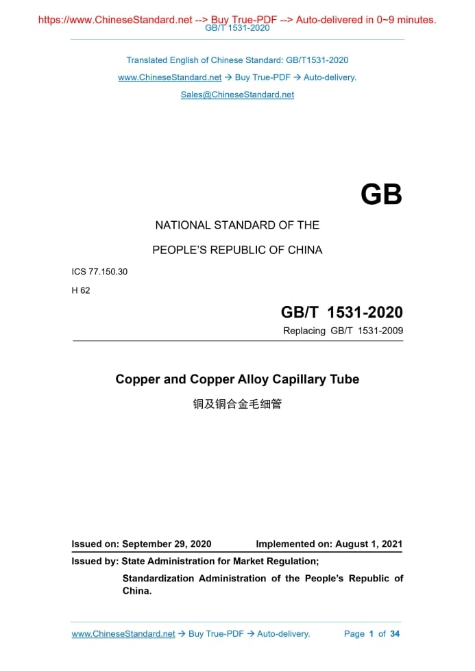 GB/T 1531-2020: Copper and Copper Alloy Capillary Tube Delivery: 9 seconds. True-PDF full-copy in English & invoice will be downloaded + auto-delivered via email. See step-by-step procedure Status: Valid GB/T 1531: Historical versions
