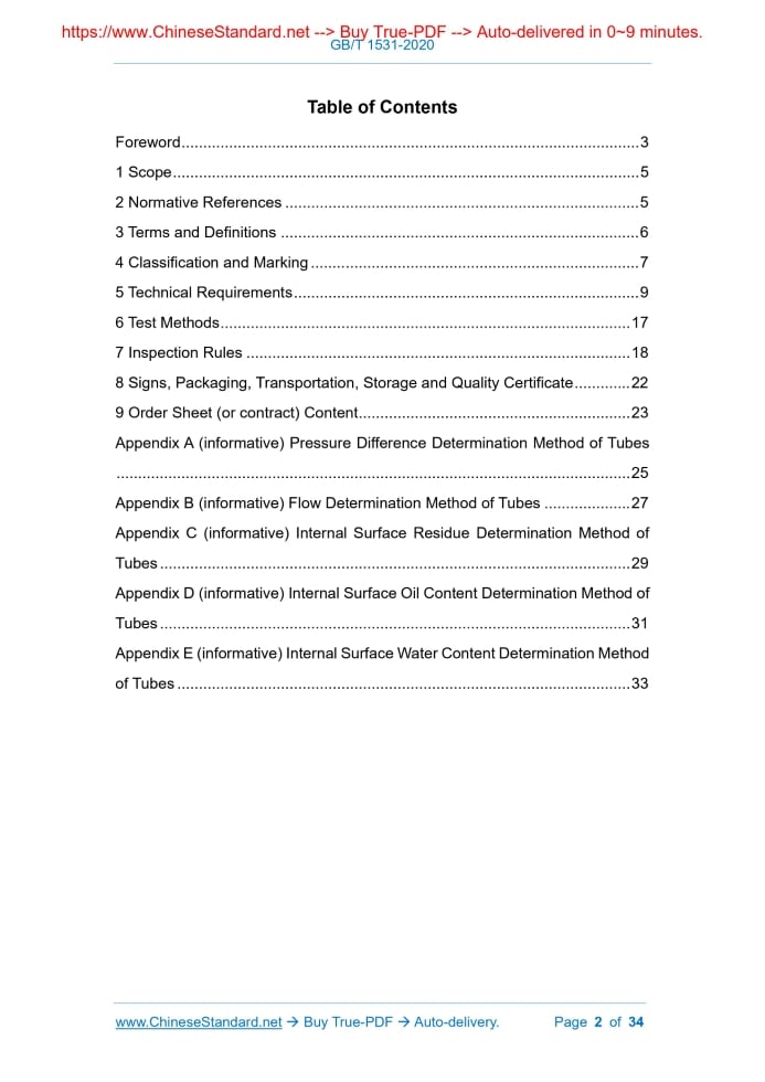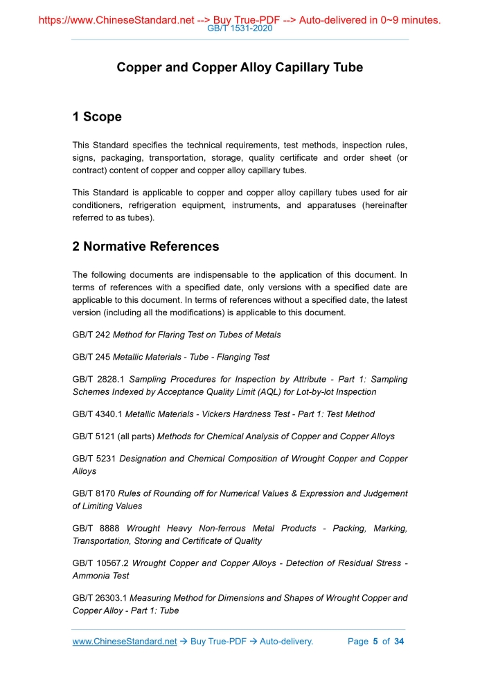 GB/T 1531-2020: Copper and Copper Alloy Capillary Tube---This is an excerpt. Full copy of true-PDF in English version (including equations, symbols, images, flow-chart, tables, and figures etc.), auto-downloaded/delivered in 9 seconds, can be purchased online: https://www.ChineseStandard.net/PDF.aspx/GBT1531-2020GB NATIONAL STANDARD OF THE PEOPLE’S REPUBLIC OF CHINA ICS 77.150.30 H 62 Replacing GB/T 1531-2009 Copper and Copper Alloy Capillary Tube ISSUED ON: SEPTEMBER 29, 2020 IMPLEMENTED ON: AUGUST 1, 2021 Issued by: State Administration for Market Regulation; Standardization Administration of the People’s Republic of China. Table of ContentsForeword ... 3 1 Scope ... 5 2 Normative References ... 5 3 Terms and Definitions ... 6 4 Classification and Marking ... 7 5 Technical Requirements ... 9 6 Test Methods ... 17 7 Inspection Rules ... 18 8 Signs, Packaging, Transportation, Storage and Quality Certificate ... 22 9 Order Sheet (or contract) Content ... 23 Appendix A (informative) Pressure Difference Determination Method of Tubes ... 25 Appendix B (informative) Flow Determination Method of Tubes ... 27 Appendix C (informative) Internal Surface Residue Determination Method of Tubes ... 29 Appendix D (informative) Internal Surface Oil Content Determination Method of Tubes ... 31 Appendix E (informative) Internal Surface Water Content Determination Method of Tubes ... 33 Copper and Copper Alloy Capillary Tube1 ScopeThis Standard specifies the technical requirements, test methods, inspection rules, signs, packaging, transportation, storage, quality certificate and order sheet (or contract) content of copper and copper alloy capillary tubes. This Standard is applicable to copper and copper alloy capillary tubes used for air conditioners, refrigeration equipment, instruments, and apparatuses (hereinafter referred to as tubes).2 Normative ReferencesThe following documents are indispensable to the application of this document. In terms of references with a specified date, only versions with a specified date are applicable to this document. In terms of references without a specified date, the latest version (including all the modifications) is applicable to this document. GB/T 242 Method for Flaring Test on Tubes of Metals GB/T 245 Metallic Materials - Tube - Flanging Test GB/T 2828.1 Sampling Procedures for Inspection by Attribute - Part 1: Sampling Schemes Indexed by Acceptance Quality Limit (AQL) for Lot-by-lot Inspection GB/T 4340.1 Metallic Materials - Vickers Hardness Test - Part 1: Test Method GB/T 5121 (all parts) Methods for Chemical Analysis of Copper and Copper Alloys GB/T 5231 Designation and Chemical Composition of Wrought Copper and Copper Alloys GB/T 8170 Rules of Rounding off for Numerical Values & Expression and Judgement of Limiting Values GB/T 8888 Wrought Heavy Non-ferrous Metal Products - Packing, Marking, Transportation, Storing and Certificate of Quality GB/T 10567.2 Wrought Copper and Copper Alloys - Detection of Residual Stress - Ammonia Test GB/T 26303.1 Measuring Method for Dimensions and Shapes of Wrought Copper and Copper Alloy - Part 1: Tube GB/T 34505 Copper and Copper Alloy Materials - Tensile Testing at Room Temperature YS/T 347 Copper and Copper Alloys - Estimation of Average Grain Size YS/T 482 Methods for Analysis of Copper and Copper Alloys - The Atomic Emission Spectrometry YS/T 483 Methods for Analysis of Copper and Copper Alloys - X-ray Fluorescence Spectrometric (wavelength dispersive) YS/T 668 Sampling Method of Physical and Chemical Testing for Copper and Copper Alloys YS/T 815 Preparation Method of Test Pieces for Mechanical and Technological Properties of Copper and Copper Alloys YS/T 999 Capillary Tube of Copper and Copper Alloy-eddy Current Testing Method3 Terms and DefinitionsThe following terms and definitions are applicable to this document. 3.1 Capillary Capillary refers to a copper tube for current limiting, and with an outer diameter of not greater than 6.1 mm and an inner diameter of not greater than 4.45 mm. 3.2 Pressure Difference Pressure difference refers to the resistance drop of the inner hole of tubes of a certain length. 3.3 Flow Flow refers to the volume of air flow passing through a tube per unit time at a certain temperature, a certain atmospheric pressure and a certain inlet pressure. 3.4 Residue Residue refers to solid impurities remaining on the inner surface of a tube unit. 3.5 Oil Content Oil content refers to processing oil remaining on the inner surface of a tube unit. 3.6 Bulge Circle (limit)6 Test Methods6.1 Chemical Composition The analysis method for the chemical composition of the tubes shall comply with the stipulations of GB/T 5121 (all parts) or YS/T 482 and YS/T 483. The arbitration shall comply with the stipulations of GB/T 5121 (all parts). 6.2 Overall Dimensions and Allowable Deviations The measurement method for the overall dimensions and allowable deviations of the tubes shall comply with the stipulations of GB/T 26303.1. 6.3 Mechanical Properties The tensile test of the tubes shall be conducted in accordance with the stipulations of GB/T 34505; the tensile test specimens shall comply with the stipulations of full-section test specimens in GB/T 34505. The Vickers hardness test of the tubes shall be conducted in accordance with the stipulations of GB/T 4340.1. 6.4 Process Properties 6.4.1 Air permeability The air permeability test of the tubes shall be conducted under the air pressure of not greater than 7.8 MPa; continuously pressurize it, and when there is relatively violent bubble-turning phenomenon at one end of the tube placed in the water, it proves that the tube is unblocked. 6.4.2 Air tightness For the air tightness test of the tubes, seal one end of the tube; immerse it in the water; ventilate at the other end, so that it complies with the test requirements of Table 8. 6.4.3 Pressure difference The test method for the pressure difference of the tubes shall take Appendix A as a reference. When there a