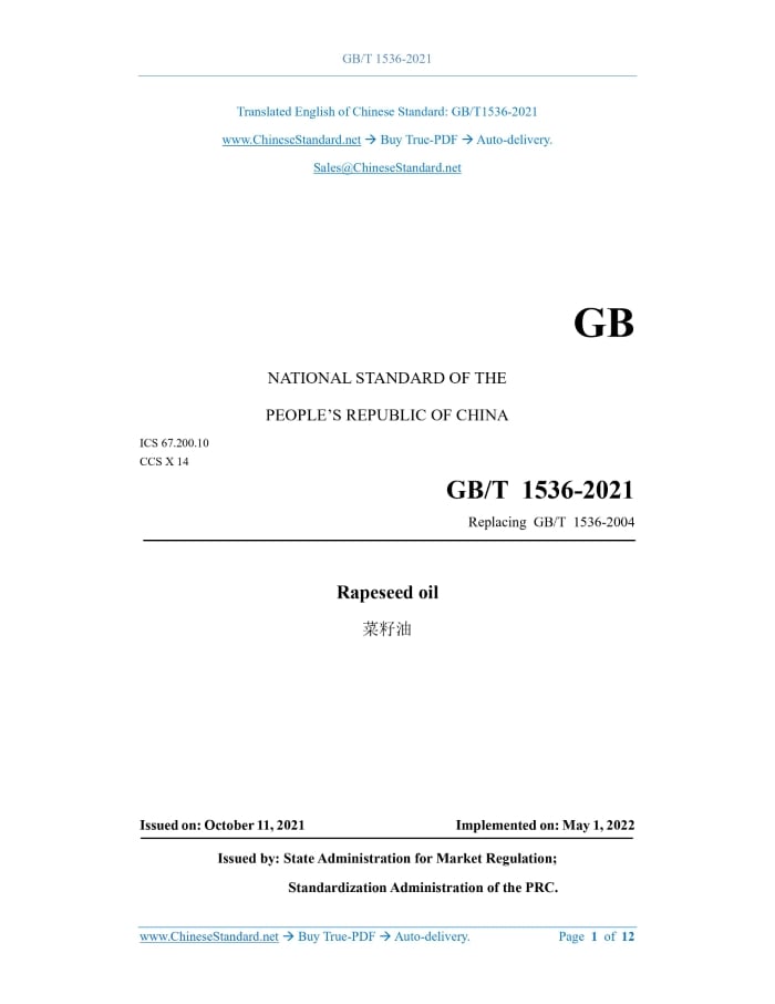 GB/T 1536-2021: Rapeseed oil Delivery: 9 seconds. True-PDF full-copy in English & invoice will be downloaded + auto-delivered via email. See step-by-step procedure Status: Valid GB/T 1536: Historical versions