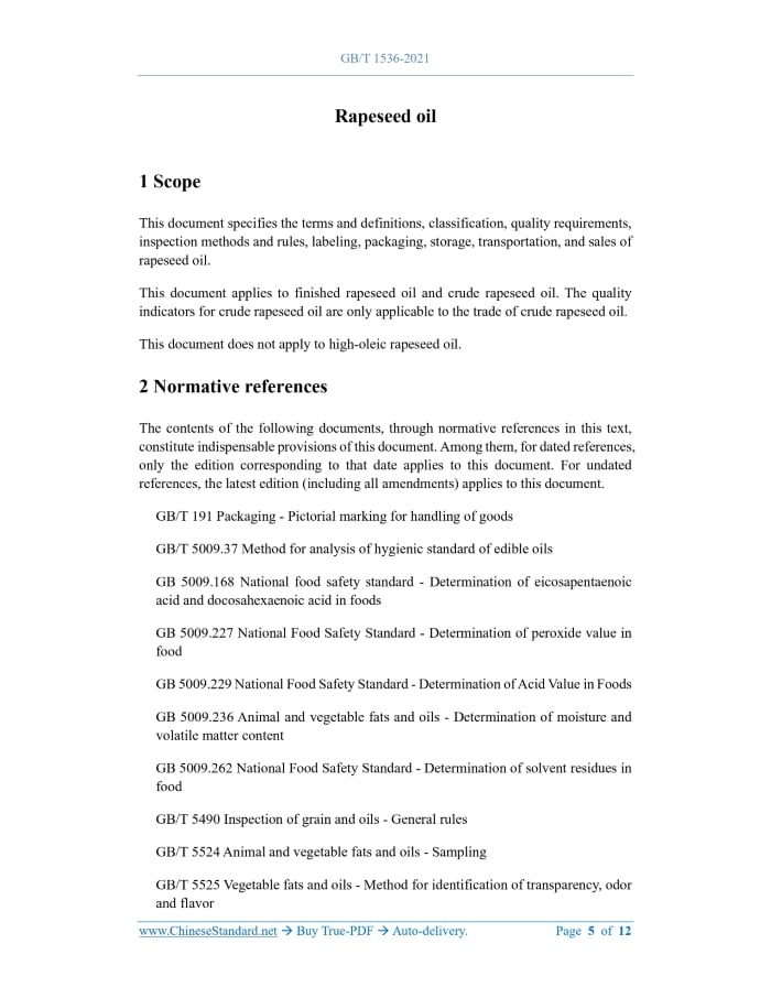 GB/T 1536-2021: Rapeseed oil---This is an excerpt. Full copy of true-PDF in English version (including equations, symbols, images, flow-chart, tables, and figures etc.), auto-downloaded/delivered in 9 seconds, can be purchased online: https://www.ChineseStandard.net/PDF.aspx/GBT1536-2021GB NATIONAL STANDARD OF THE PEOPLE’S REPUBLIC OF CHINA ICS 67.200.10 CCS X 14 Replacing GB/T 1536-2004 Rapeseed oil Issued on. OCTOBER 11, 2021 Implemented on. MAY 1, 2022 Issued by. State Administration for Market Regulation; Standardization Administration of the PRC. Table of ContentsForeword... 3 1 Scope... 5 2 Normative references... 5 3 Terms and definitions... 6 4 Classification... 7 5 Quality requirements... 7 6 Inspection methods... 10 7 Inspection rules... 10 8 Labeling and identification... 11 9 Packaging, storage, transportation, and sales... 11ForewordThis document is drafted in accordance with GB/T 1.1-2020 "Directives for standardization - Part 1.Rules for the structure and drafting of standardizing documents". This document replaces GB/T 1536-2004 "Rapeseed oil". Compared with GB/T 1536- 2004, the main technical changes are as follows. - Modify the scope (see Clause 1; Clause 1 of the 2004 edition); - Modify some terms and definitions (see 3.2, 3.3, 3.4, 3.5, and 3.6; 3.1, 3.2, 3.4, 3.5, and 3.6 of the 2004 edition); - Delete some terms and definitions (see 3.7, 3.8, 3.9, 3.10, 3.11, 3.12, 3.13, 3.14, 3.15, 3.16, 3.17, 3.18, 3.19, 3.20, 3.21, 3.22, and 3.23 of the 2004 edition); - Add some terms and definitions (see 3.1); - Modify the classification (see Clause 4; Clause 4 of the 2004 edition); - Modify the quality requirements; set "Basic composition and main physical parameters" (see 5.1, 5.2, and 5.3; Clause 5 of the 2004 edition); - Add the general rules for inspection (see 7.1); - Add sales requirements (see 9.4). This document was proposed by National Food and Strategic Reserves Administration. This document shall be under the jurisdiction of National Technical Committee 270 on Grain and Oil of Standardization Administration of China (SAC/TC 270). Drafting organizations of this document. Wuhan Polytechnic University; Standard Quality Center of National Food and Strategic Reserves Administration; Academy of National Food and Strategic Reserves Administration; Oil Crops Research Institute, Chinese Academy of Agricultural Sciences; Jiangnan University; Henan University of Technology; Grain, Oil and Food Quality Supervision and Testing Center of Hubei Province; Grain and Oil Central Monitoring Station of Sichuan Province; Chengdu New Shine Oil and Grain Co., Ltd.; COFCO Corporation Co., Ltd.; Yihai Kerry Arawana Holdings Co., Ltd.; Hubei Aoxing Grain and Oil Industry Co., Ltd.; Chang'an Hua Grain & Oil Co., Ltd.; Zhejiang Xinshi Oil Stock Co., Ltd.; Daodaoquan Grain and Oil Co., Ltd.; AUSCA Oils and Grains Industries Co., Ltd.; Zhongxing Energy (Hubei) Co., Ltd.; Tibet Characteristic Industry Co., Ltd.; Hunan Vchen Oil Industry Co., Ltd.; Hubei Hongsen Tianli Oil Biotechnology Co., Ltd. Main drafters of this document. He Dongping, Tang Ruiming, Long Lingli, Xu Guangchao, Xue Yalin, Zhang Sihong, Huang Fenghong, Wang Xingguo, Liu Yulan, Xiong Ning, Yang Jun, Jiang Minjie, Yu Lei, Pan Kun, Liu Heng, Yao Li, Yang Mei, Liang Hongxing, Zhang Jialiang, Bao Lilin, Zhang Hui, Deng Bin, Liu Zhixiang, Zhang Xiaozhong, Peng Hua, Hong Chuanlin, Jiao Shanhai. The releases of previous editions of this document and the document it replaces were as follows. - It was first issued as GB 1536-1986 in 1986; revised for the first time in 2004; - This is the second revision. Rapeseed oil1 ScopeThis document specifies the terms and definitions, classification, quality requirements, inspection methods and rules, labeling, packaging, storage, transportation, and sales of rapeseed oil. This document applies to finished rapeseed oil and crude rapeseed oil. The quality indicators for crude rapeseed oil are only applicable to the trade of crude rapeseed oil. This document does not apply to high-oleic rapeseed oil.2 Normative referencesThe contents of the following documents, through normative references in this text, constitute indispensable provisions of this document. Among them, for dated references, only the edition corresponding to that date applies to this document. For undated references, the latest edition (including all amendments) applies to this document. GB/T 191 Packaging - Pictorial marking for handling of goods GB/T 5009.37 Method for analysis of hygienic standard of edible oils GB 5009.168 National food safety standard - Determination of eicosapentaenoic acid and docosahexaenoic acid in foods GB 5009.227 National Food Safety Standard - Determination of peroxide value in food3 Terms and definitionsThe following terms and definitions apply to this document. 3.1 Rapeseed oil Oil made from rapeseed. 3.2 Low-crucic acid rapeseed oil Rapeseed oil whose fatty acid composition contains not more than 3% erucic acid. [Translator note. “Low-crucic acid” should be “Low-erucic acid”.] 3.3 Crude rapeseed oil An oil product made from rapeseed that meets the crude oil quality indicators in this document and cannot be directly used for human consumption.4 ClassificationAccording to the degree of processing, rapeseed oil is divided into two types. crude rapeseed oil and finished rapeseed oil. According to the erucic acid content of rapeseed oil, it is divided into common rapeseed oil and low-erucic acid rapeseed oil.5 Quality requirements5.1 Basic composition and main physical parameters The basic composition and main physical parameters of rapeseed oil are shown in Table 1.These compositions and parameters represent the basic characteristics of rapeseed oil. 5.2 Quality indicators 5.2.1 Quality indicators of crude rapeseed oil The quality indicators of crude rapeseed oil are shown in Table 2. 5.3 Others Rapeseed oil must not be mixed with other edible oils and non-edible oils.6 Inspection methods6.1 Inspecti