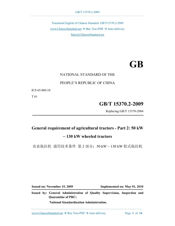 GB/T 15370.2-2009: General requirement of agricultural tractors - Part 2: 50 kW~130 kW wheeled tractors Delivery: 9 seconds. True-PDF full-copy in English & invoice will be downloaded + auto-delivered via email. See step-by-step procedure Status: Valid GB/T 15370.2: Historical versions