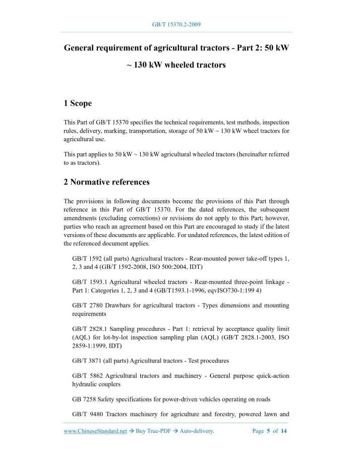 Similar standardsGB/T 15370.2-2009: General requirement of agricultural tractors - Part 2: 50 kW~130 kW wheeled tractors---This is an excerpt. Full copy of true-PDF in English version (including equations, symbols, images, flow-chart, tables, and figures etc.), auto-downloaded/delivered in 9 seconds, can be purchased online: https://www.ChineseStandard.net/PDF.aspx/GBT15370.2-2009 GB NATIONAL STANDARD OF THE PEOPLE’S REPUBLIC OF CHINA ICS 65.060.10 T 61 Replacing GB/T 15370-2004 General requirement of agricultural tractors - Part 2.50 kW ~ 130 kW wheeled tractors Issued on: NOVEMBER 15, 2009 Implemented on: MAY 01, 2010 Issued by. General Administration of Quality Supervision, Inspection and Quarantine of PRC; National Standardization Administration. Table of ContentsForeword... 3 1 Scope... 5 2 Normative references... 5 3 Technical requirements... 6 4 Test method... 9 5 Inspection rules... 10 6 Delivery... 13 7 Marking, transportation, storage... 14 General requirement of agricultural tractors - Part 2.50 kW ~ 130 kW wheeled tractors1 ScopeThis Part of GB/T 15370 specifies the technical requirements, test methods, inspection rules, delivery, marking, transportation, storage of 50 kW ~ 130 kW wheel tractors for agricultural use. This part applies to 50 kW ~ 130 kW agricultural wheeled tractors (hereinafter referred to as tractors).2 Normative referencesThe provisions in following documents become the provisions of this Part through reference in this Part of GB/T 15370.For the dated references, the subsequent amendments (excluding corrections) or revisions do not apply to this Part; however, parties who reach an agreement based on this Part are encouraged to study if the latest versions of these documents are applicable. For undated references, the latest edition of the referenced document applies. GB/T 1592 (all parts) Agricultural tractors - Rear-mounted power take-off types 1, 2, 3 and 4 (GB/T 1592-2008, ISO 500.2004, IDT) GB/T 1593.1 Agricultural wheeled tractors - Rear-mounted three-point linkage - Part 1.Categories 1, 2, 3 and 4 (GB/T1593.1-1996, eqvISO730-1.199 4) GB/T 2780 Drawbars for agricultural tractors - Types dimensions and mounting requirements GB/T 2828.1 Sampling procedures - Part 1.retrieval by acceptance quality limit (AQL) for lot-by-lot inspection sampling plan (AQL) (GB/T 2828.1-2003, ISO 2859-1.1999, IDT) GB/T 3871 (all parts) Agricultural tractors - Test procedures GB/T 5862 Agricultural tractors and machinery - General purpose quick-action hydraulic couplers GB 7258 Safety specifications for power-driven vehicles operating on roads GB/T 9480 Tractors machinery for agriculture and forestry, powered lawn and each system; there shall be no oil leakage, water leakage, air leakage, or electricity leakage. 3.1.4 Mud water is not allowed to penetrate into the tractor body during normal operation. 3.1.5 The appearance quality of the tractor shall comply with the provisions of JB/T 6712; the painting shall comply with the provisions of JB/T 5673; the adhesion performance of the paint film shall not be lower than the Level II requirements of 6.4 in JB/T 9832.2-1999. 3.1.6 The engine shall be able to operate stably within the entire speed range and be able to stop the engine directly or indirectly, through the flameout device. The hand throttle handle shall be able to stop reliably in any position and not be affected by the foot throttle operation. 3.1.7 The operation of each control mechanism of the tractor shall be light, flexible, moderately tight. The stroke adjustment of each mechanism shall comply with the provisions of the instruction manual. All control parts that can return automatically shall be able to reset automatically after the control force is removed; control parts that do not return automatically shall be able to stop reliably at the selected position. The maximum operating force of each control mechanism shall comply with the provisions of GB/T 19407. 3.1.8 The clutch shall be smoothly engaged and completely separated; it shall be able to transmit the full torque of the engine when engaged. No oil or air leakage is allowed in the control and booster pipeline systems. 3.1.9 The stepped transmission of tractors above 73 kW shall have at least 10 forward gears. When working in each gear, the transmission is not allowed to have random shifting or disengagement. 3.1.10 The rear-positioned power take-off shaft is independent and shall comply with the provisions of GB/T 1592 (all parts). The front-positioned power take-off shaft and front suspension device shall comply with the provisions of GB/T 10916. 3.1.11 The toe-in of the tractor's front wheels shall comply with enterprise standards. 3.1.12 When the tractor is parked in a straight-line driving position, the maximum free travel of the steering wheel shall not exceed 30°. The tractor shall be able to turn smoothly throughout the entire process; discontinuous operation and impact shall not be allowed. When the tractor stalls during driving, manual steering shall be possible; the steering performance shall meet the requirements of GB/T 19040. 3.1.13 When the tractor is traveling in a straight line on a hard pavement, no visible oscillation of the front wheels is allowed. 3.1.14 The hydraulic suspension device shall comply with the provisions of GB/T 1593.1. 3.1.15 The tractor's traction device shall comply with the provisions of GB/T 2780.The towing device shall comply with the provisions of GB/T 19408.1.The hydraulic quick- change joint shall comply with the provisions of GB/T 5862. 3.1.16 The instruments on the tractor shall comply with the provisions of JB/T 6697. The display shall be clear and accurate. The signal alarm system, electrical lighting and switches shall work reliably. 3.1.17 During the running-in operation and performance test, each sealing surface and pipe joint shall have no leakage after adjusting the fasteners three times. 3.1.18 When the tractor transport unit performs transportation op