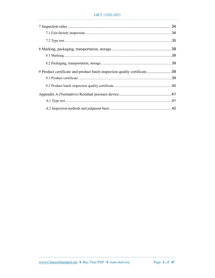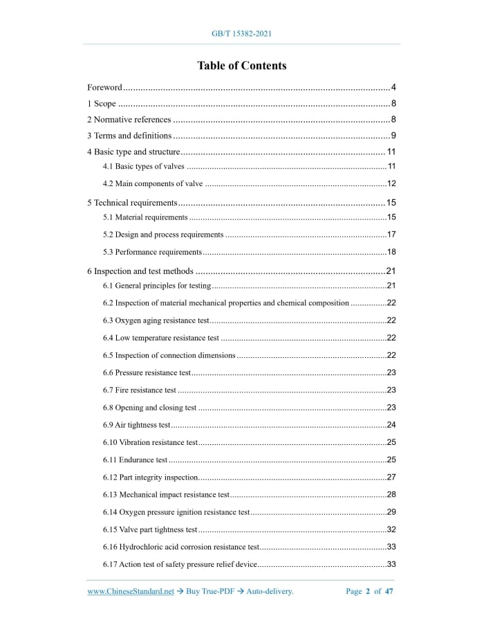 Similar standardsGB/T 15382-2021: General specifications of gas cylinder valves---This is an excerpt. Full copy of true-PDF in English version (including equations, symbols, images, flow-chart, tables, and figures etc.), auto-downloaded/delivered in 9 seconds, can be purchased online: https://www.ChineseStandard.net/PDF.aspx/GBT15382-2021GB NATIONAL STANDARD OF THE PEOPLE’S REPUBLIC OF CHINA ICS 23.020.30 CCS J 74 Replacing GB/T 15382-2009, GB/T 10879-2009 General specifications of gas cylinder valves (ISO 10297:2014, Gas cylinders - Cylinder valves - Specification and type testing, NEQ) ISSUED ON: AUGUST 20, 2021 IMPLEMENTED ON: MARCH 01, 2022 Issued by: State Administration for Market Regulation; National Standardization Administration. Table of ContentsForeword ... 4 1 Scope ... 8 2 Normative references ... 8 3 Terms and definitions ... 9 4 Basic type and structure ... 11 4.1 Basic types of valves ... 11 4.2 Main components of valve ... 12 5 Technical requirements ... 15 5.1 Material requirements ... 15 5.2 Design and process requirements ... 17 5.3 Performance requirements ... 18 6 Inspection and test methods ... 21 6.1 General principles for testing ... 21 6.2 Inspection of material mechanical properties and chemical composition ... 22 6.3 Oxygen aging resistance test ... 22 6.4 Low temperature resistance test ... 22 6.5 Inspection of connection dimensions ... 22 6.6 Pressure resistance test ... 23 6.7 Fire resistance test ... 23 6.8 Opening and closing test ... 23 6.9 Air tightness test ... 24 6.10 Vibration resistance test ... 25 6.11 Endurance test ... 25 6.12 Part integrity inspection ... 27 6.13 Mechanical impact resistance test ... 28 6.14 Oxygen pressure ignition resistance test ... 29 6.15 Valve part tightness test ... 32 6.16 Hydrochloric acid corrosion resistance test ... 33 6.17 Action test of safety pressure relief device ... 33 7 Inspection rules ... 34 7.1 Exit-factory inspection ... 34 7.2 Type test ... 35 8 Marking, packaging, transportation, storage ... 38 8.1 Marking... 38 8.2 Packaging, transportation, storage ... 39 9 Product certificate and product batch inspection quality certificate ... 39 9.1 Product certificate ... 39 9.2 Product batch inspection quality certificate ... 40 Appendix A (Normative) Residual pressure device ... 41 A.1 Type test ... 41 A.2 Inspection methods and judgment basis ... 42 General specifications of gas cylinder valves1 ScopeThis document stipulates the terms and definitions, basic types, technical requirements, inspection and test methods, inspection rules, marking, packaging, transportation, storage, product certificates, product batch inspection quality certificates of gas cylinder valves. This document is applicable to valves for compressed, liquefied, dissolved gas cylinders (hereinafter referred to as valves), whose ambient temperature is -40 °C ~ +60 °C, whose nominal working pressure is not greater than 35 MPa, which is transportable and refillable. This document does not apply to the valves for welding insulated cylinders, fire extinguishing cylinders, vehicle cylinders, respirator cylinders, liquefied petroleum gas cylinders, liquefied dimethyl ether cylinders, industrial non-refillable welded cylinders.2 Normative referencesThe contents of the following documents constitute essential provisions of this document through normative references in the text. Among them, for dated reference documents, only the version corresponding to the date applies to this document; for undated reference documents, the latest version (including all amendments) applies to this document. GB/T 197 General purpose metric screw threads - Tolerances GB/T 228.1 Metallic materials - Tensile testing - Part 1: Method of test at room temperature GB/T 3863 Industrial oxygen GB/T 4423 Copper and copper alloy cold-drawn rod and bar GB/T 7307 Pipe threads with 55 degree thread angle where pressure-tight joints are not made on the threads GB/T 8335 Special thread for gas cylinders GB/T 8337 Fusible plug device for gas cylinders GB/T 13005 Terminology of gas cylinders 5.1.1.5 The liquid chlorine cylinder valve shall be made of materials resistant to hydrochloric acid corrosion. 5.1.2 Valve body material 5.1.2.1 The valve body material shall be made of materials that will not change from plasticity to brittleness (such as copper alloy, austenitic stainless steel, aluminum alloy, nickel alloy, etc.), meanwhile it shall meet the design strength requirements of the valve body. The performance of the material shall comply with corresponding national standards. 5.1.2.2 When selecting brass material for the valve body, its copper content shall be in the range of 57.0% ~ 65.0%, lead content shall be in the range of 0.8% ~ 1.9%, iron content shall be ≤ 0.5%. The mechanical properties of the material shall not be lower than those specified in GB/T 4423. 5.1.3 Operating mechanism and operating device materials 5.1.3.1 The valve operating device shall have sufficient strength and fire resistance, which should be made of aluminum alloy material. 5.1.3.2 The materials of the valve stem, valve, connecting plate shall have sufficient strength and corrosion resistance. The valve stem used for liquid chlorine medium shall be made of stainless steel material, that is resistant to hydrochloric acid corrosion, or materials with higher resistance to hydrochloric acid corrosion. 5.1.3.3 The spring placed inside the valve should be made of corrosion-resistant stainless steel. 5.1.3.4 The diaphragm piece of the diaphragm valve shall be made of elastic stainless steel material, or a combination of media corrosion-resistant material and elastic stainless steel material. 5.1.4 Rubber seal materials 5.1.4.1 Oxygen aging resistance The rubber seal shall be kept in oxygen at a pressure of (2.3 ± 0.2) MPa and a temperature of (70 ± 5) °C for 96 hours; there shall be no visible cracks or aging. 5.1.4.2 Low temperature resistance The rubber seal shall be kept in air at a temperature of (