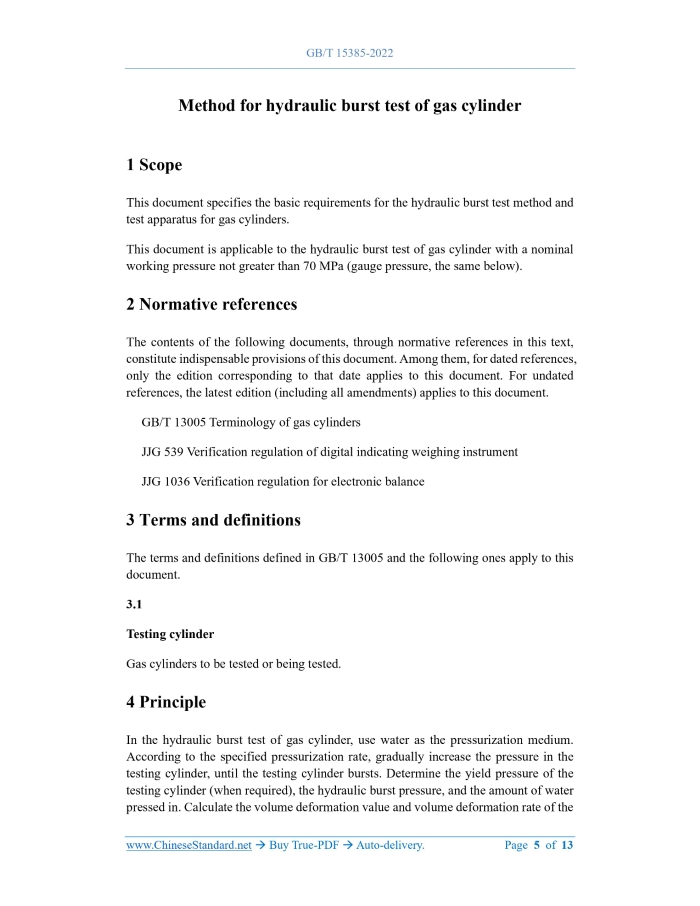 Similar standardsGB/T 15385-2022: Method for hydraulic burst test of gas cylinder---This is an excerpt. Full copy of true-PDF in English version (including equations, symbols, images, flow-chart, tables, and figures etc.), auto-downloaded/delivered in 9 seconds, can be purchased online: https://www.ChineseStandard.net/PDF.aspx/GBT15385-2022GB NATIONAL STANDARD OF THE PEOPLE’S REPUBLIC OF CHINA ICS 23.020.30 CCS J 74 Replacing GB/T 15385-2011 Method for hydraulic burst test of gas cylinder ISSUED ON: MARCH 9, 2022 IMPLEMENTED ON: OCTOBER 1, 2022 Issued by: State Administration for Market Regulation; Standardization Administration of the PRC. Table of ContentsForeword ... 3 1 Scope ... 5 2 Normative references ... 5 3 Terms and definitions ... 5 4 Principle ... 5 5 Test conditions ... 6 6 Apparatus ... 6 7 Test procedure ... 9 8 Test data processing ... 10 9 Precautions during the test ... 10 10 Test records and report ... 11 Appendix A (Informative) Average compressibility coefficient of water ... 13 Method for hydraulic burst test of gas cylinder1 ScopeThis document specifies the basic requirements for the hydraulic burst test method and test apparatus for gas cylinders. This document is applicable to the hydraulic burst test of gas cylinder with a nominal working pressure not greater than 70 MPa (gauge pressure, the same below).2 Normative referencesThe contents of the following documents, through normative references in this text, constitute indispensable provisions of this document. Among them, for dated references, only the edition corresponding to that date applies to this document. For undated references, the latest edition (including all amendments) applies to this document. GB/T 13005 Terminology of gas cylinders JJG 539 Verification regulation of digital indicating weighing instrument JJG 1036 Verification regulation for electronic balance3 Terms and definitionsThe terms and definitions defined in GB/T 13005 and the following ones apply to this document. 3.1 Testing cylinder Gas cylinders to be tested or being tested.4 PrincipleIn the hydraulic burst test of gas cylinder, use water as the pressurization medium. According to the specified pressurization rate, gradually increase the pressure in the testing cylinder, until the testing cylinder bursts. Determine the yield pressure of the testing cylinder (when required), the hydraulic burst pressure, and the amount of water pressed in. Calculate the volume deformation value and volume deformation rate of the testing cylinder (when required). And check the cracking forms such as cracking characteristics and cracking position of the testing cylinder.5 Test conditions5.1 The test water shall be clean fresh water. Continuous and stable water supply is required. 5.2 The temperature of the test water and the test environment shall not be lower than 5 °C.6 Apparatus6.1 Basic requirements for test apparatus 6.1.1 The typical layout of test apparatus is shown in Figure 1. 6.1.2 The pressurization of the testing cylinder shall use a plunger pump, a pneumatic pump, or other pressurization devices with stable pressure output. Use water as the pressurization medium. 6.1.3 The rated working pressure of the pressurization device shall meet the requirements for the hydraulic burst pressure of gas cylinder. The pressurization device shall have good sealing performance and stable pressurization rate. Its flow rate shall be adjustable, to meet the requirements of the testing cylinder product standard for pressurization rate. 6.1.4 The connection between the pressure-bearing pipeline and the test device and measuring instrument shall have a good seal. Metal pipes shall be used for fixedly- installed pressure-bearing pipelines. A flexible connection that acts as a shock absorber can be a high-pressure hose. The pressure-bearing capacity of the pressure-bearing pipeline shall meet the requirements for the hydraulic burst pressure of gas cylinder. 6.2 Measuring instruments 6.2.1 Pressure measuring instrument 6.2.1.1 A pressure gauge and a pressure transmitter (or a digital pressure gauge capable of outputting pressure signals) shall be installed on the test apparatus. The pressure gauge is used to display test pressure in real time. The pressure transmitter (or digital pressure gauge that can output pressure signals) is used to collect pressure data. The installation position of pressure gauge and pressure transmitter (or digital pressure gauge that can output pressure signals) shall be such that the test pressure can be correctly displayed. 6.2.1.2 The range of the pressure gauge shall be 1.5~3 times the minimum burst pressure of the testing cylinder. The accuracy level shall not be lower than level 1.6. The range of the pressure transmitter (or digital pressure gauge capable of outputting pressure signals) shall be 1.5~3 times the minimum burst pressure of the testing cylinder. The accuracy level shall not be lower than level 0.5. 6.2.1.3 Pressure measuring instruments shall be verified or calibrated regularly. The verification or calibration cycle shall be implemented in accordance with relevant regulations. 6.2.2 Water volume measuring instrument 6.2.2.1 The water volume measuring instrument can be electronic balance, measuring tube, flow sensor, or other suitable measuring instruments. 6.2.2.2 The range of electronic balance shall meet the test requirements. The accuracy level and allowable error shall meet the requirements of Class III specified in JJG 1036. If the nominal volume of gas cylinder is greater than 450 L, the verification scale value and the actual scale value shall not be greater than 10 g. If the nominal volume of gas cylinder is not greater than 450 L, the verification scale value shall not be greater than 5 g; the actual scale value shall be 1 g. 6.2.2.3 The range of measuring tube shall meet the test requirements. The relative error of the scale value on this measuring range shall not be greater than ±1%. 6.2.2.4 The range of t