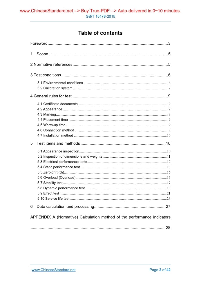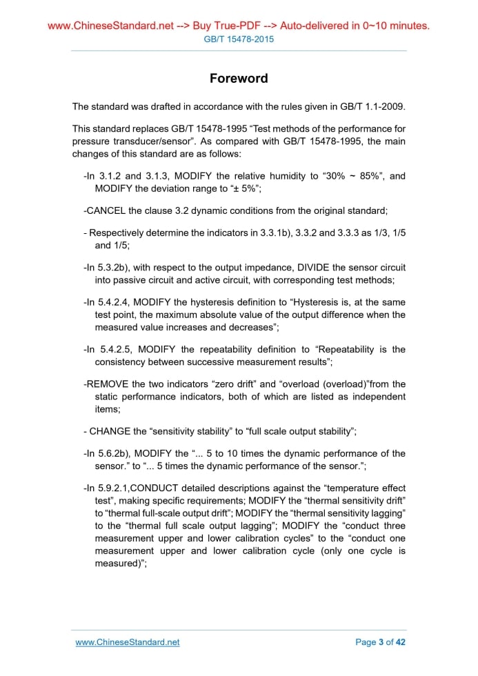 Similar standardsGB/T 15478-2015: Test methods of the performances for pressure transducer-sensor---This is an excerpt. Full copy of true-PDF in English version (including equations, symbols, images, flow-chart, tables, and figures etc.), auto-downloaded/delivered in 9 seconds, can be purchased online: https://www.ChineseStandard.net/PDF.aspx/GBT15478-2015ICS 17.100 N 11 GB NATIONAL STANDARD OF THE PEOPLE’S REPUBLIC OF CHINA Replacing 15478-1995 Test methods of the performances for pressure transducer/sensor Issued on: DECEMBER 10, 2015 Implemented on: JULY 01, 2016 Issued by. General Administration of Quality Supervision, Inspection and Quarantine; Standardization Administration of PRC. Table of ContentsForeword ... 3 1 Scope ... 5 2 Normative references ... 5 3 Test conditions ... 6 3.1 Environmental conditions ... 6 3.2 Calibration system ... 7 4 General rules for test ... 9 4.1 Certificate documents ... 9 4.2 Appearance ... 9 4.3 Marking ... 9 4.4 Placement time ... 9 4.5 Warm-up time ... 9 4.6 Connection method ... 9 4.7 Installation method ... 10 5 Test items and methods ... 10 5.1 Appearance inspection ... 10 5.2 Inspection of dimensions and weights ... 11 5.3 Electrical performance tests ... 12 5.4 Static performance test ... 13 5.5 Zero drift (dz) ... 16 5.6 Overload (Overload) ... 16 5.7 Stability test ... 17 5.8 Dynamic performance test ... 18 5.9 Effect test ... 21 5.10 Service life test ... 26 6 Data calculation and processing ... 27 APPENDIX A (Normative) Calculation method of the performance indicators ... 28ForewordThe standard was drafted in accordance with the rules given in GB/T 1.1-2009. This standard replaces GB/T 15478-1995 “Test methods of the performance for pressure transducer/sensor”. As compared with GB/T 15478-1995, the main changes of this standard are as follows. -In 3.1.2 and 3.1.3, MODIFY the relative humidity to “30% ~ 85%”, and MODIFY the deviation range to “± 5%”; -CANCEL the clause 3.2 dynamic conditions from the original standard; - Respectively determine the indicators in 3.3.1b), 3.3.2 and 3.3.3 as 1/3, 1/5 and 1/5; -In 5.3.2b), with respect to the output impedance, DIVIDE the sensor circuit into passive circuit and active circuit, with corresponding test methods; -In 5.4.2.4, MODIFY the hysteresis definition to “Hysteresis is, at the same test point, the maximum absolute value of the output difference when the measured value increases and decreases”; -In 5.4.2.5, MODIFY the repeatability definition to “Repeatability is the consistency between successive measurement results”; -REMOVE the two indicators “zero drift” and “overload (overload)”from the static performance indicators, both of which are listed as independent items; - CHANGE the “sensitivity stability” to “full scale output stability”; -In 5.6.2b), MODIFY the “... 5 to 10 times the dynamic performance of the sensor.” to “... 5 times the dynamic performance of the sensor.”; -In 5.9.2.1,CONDUCT detailed descriptions against the “temperature effect test”, making specific requirements; MODIFY the “thermal sensitivity drift” to “thermal full-scale output drift”; MODIFY the “thermal sensitivity lagging” to the “thermal full scale output lagging”; MODIFY the “conduct three measurement upper and lower calibration cycles” to the “conduct one measurement upper and lower calibration cycle (only one cycle is measured)”; Test methods of the performances for pressure transducer/sensor1 ScopeThis standard specifies the test conditions, the general provisions of the test, the test items and the test methods, AND data calculation and processing for the performance of the pressure sensor (abbreviated as sensor). This standard applies to pressure sensors (including absolute pressure sensor, differential pressure sensor, gauge pressure sensor AND negative pressure sensor).2 Normative referencesThe following documents are essential to the application of this document. For the dated documents, only the versions with the dates indicated are applicable to this document; for the undated documents, only the latest version (including all the amendments) are applicable to this Standard. GB/T 2423.1-2008 Environmental testing for electric and electronic products - Part 2. Test methods - Test A. Cold; GB/T 2423.2-2008 Environmental testing for electric and electronic products - Part 2. Test methods - Test B. Dry heat; GB/T 2423.3-2006 Environmental testing for electric and electronic products - Part 2. Test methods - Test Cab. Damp heat steady state; GB/T 2423.5-1995 Environmental testing for electric and electronic products - Part 2. Test methods - Test Ea and guidance. Shock; GB/T 2423.10-2008 Environmental testing for electric and electronic products - Part 2. Test methods - Test Fc. Vibration (sinusoidal); GB/T 2423.15-2008 Environmental testing for electric and electronic products - Part 2. Test methods - Test Ga and guidance. Acceleration steady; GB/T 2423.17-2008 Environmental testing for electric and electronic products - Part 2. Test methods - Test Ka. Salt mist; GB/T 2423.21-2008 Environmental testing for electric and electronic products - Part 2. Test methods - Test M. Low air pressure GB/T 2423.24-2013 Environmental testing – Part 2. Test methods – Test Sa. Simulated solar radiation at ground level and guidance for solar radiation testing; GB/T 2423.25-2008 Environmental testing – Part 2. Test methods – Test Z/AM. Combined cold/low air pressure tests; GB/T 2423.26-2008 Environmental testing – Part 2. Test methods – Test Z/AM. Combined dry heat/low air pressure tests; GB/T 2423.27-2005 Environmental testing for electric and electronic products - Part 2. Test methods - Test Z/AMD. Combined sequential cold, low air pressure and damp heat test; GB/T 2423.37-2006 Environmental testing for electric and electronic products - Part 2. Test methods - Test L. Dust and sand; GB/T 8170-2008 Rules for rounding off for numerical values &