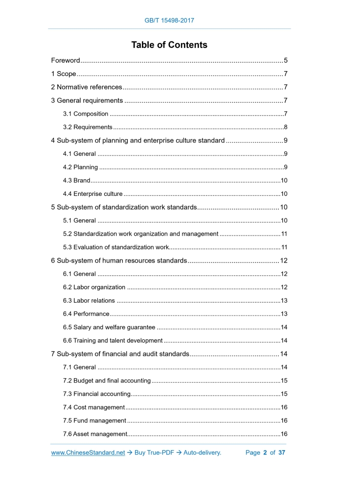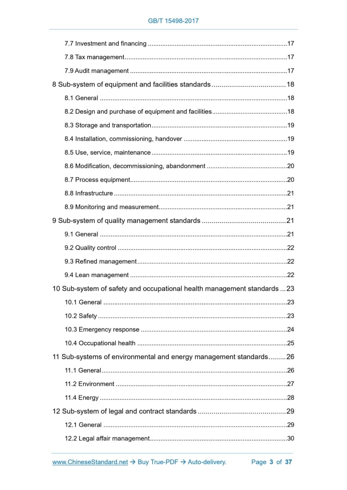 Similar standardsGB/T 15498-2017: Enterprise standards system - Fundamental supports---This is an excerpt. Full copy of true-PDF in English version (including equations, symbols, images, flow-chart, tables, and figures etc.), auto-downloaded/delivered in 9 seconds, can be purchased online: https://www.ChineseStandard.net/PDF.aspx/GBT15498-2017GB NATIONAL STANDARD OF THE PEOPLE’S REPUBLIC OF CHINA ICS 01.120 A 00 Replacing GB/T 15498-2003 Enterprise standards system - Fundamental supports ISSUED ON: DECEMBER 29, 2017 IMPLEMENTED ON: JULY 01, 2018 Issued by: General Administration of Quality Supervision, Inspection and Quarantine of PRC; Standardization Administration of PRC. Table of ContentsForeword ... 5 1 Scope ... 7 2 Normative references ... 7 3 General requirements ... 7 3.1 Composition ... 7 3.2 Requirements ... 8 4 Sub-system of planning and enterprise culture standard ... 9 4.1 General ... 9 4.2 Planning ... 9 4.3 Brand ... 10 4.4 Enterprise culture ... 10 5 Sub-system of standardization work standards ... 10 5.1 General ... 10 5.2 Standardization work organization and management ... 11 5.3 Evaluation of standardization work ... 11 6 Sub-system of human resources standards ... 12 6.1 General ... 12 6.2 Labor organization ... 12 6.3 Labor relations ... 13 6.4 Performance ... 13 6.5 Salary and welfare guarantee ... 14 6.6 Training and talent development ... 14 7 Sub-system of financial and audit standards... 14 7.1 General ... 14 7.2 Budget and final accounting ... 15 7.3 Financial accounting... 15 7.4 Cost management ... 16 7.5 Fund management ... 16 7.6 Asset management... 16 7.7 Investment and financing ... 17 7.8 Tax management ... 17 7.9 Audit management ... 17 8 Sub-system of equipment and facilities standards ... 18 8.1 General ... 18 8.2 Design and purchase of equipment and facilities ... 18 8.3 Storage and transportation ... 19 8.4 Installation, commissioning, handover ... 19 8.5 Use, service, maintenance ... 19 8.6 Modification, decommissioning, abandonment ... 20 8.7 Process equipment... 20 8.8 Infrastructure ... 21 8.9 Monitoring and measurement ... 21 9 Sub-system of quality management standards ... 21 9.1 General ... 21 9.2 Quality control ... 22 9.3 Refined management ... 22 9.4 Lean management ... 22 10 Sub-system of safety and occupational health management standards ... 23 10.1 General ... 23 10.2 Safety ... 23 10.3 Emergency response ... 24 10.4 Occupational health ... 25 11 Sub-systems of environmental and energy management standards ... 26 11.1 General ... 26 11.2 Environment ... 27 11.4 Energy ... 28 12 Sub-system of legal and contract standards ... 29 12.1 General ... 29 12.2 Legal affair management ... 30 12.3 Contract management ... 30 13 Sub-system of knowledge management and information standards ... 30 13.1 General ... 30 13.2 Intellectual property management ... 31 13.3 Information ... 32 13.4 Documents and records ... 32 13.5 File ... 33 14 Sub-system of administrative affairs and comprehensive standards ... 34 14.1 General ... 34 14.2 Administrative affairs ... 34 14.3 Technical resources ... 35 14.4 Risk and internal control management standards ... 35 References ... 37 Enterprise standards system - Fundamental supports1 ScopeThis standard specifies the construction and requirements of the fundamental supports standard system AND its sub-systems, in the production, operation, management activities of enterprises. This standard is applicable to enterprises of various types and sizes, to establish a fundamental supports standard system. Other organizations can refer to it for implementation.2 Normative referencesThe following documents are essential to the application of this document. For the dated documents, only the versions with the dates indicated are applicable to this document; for the undated documents, only the latest version (including all the amendments) is applicable to this standard. GB/T 15496 Enterprise standards system - Requirement GB/T 15497 Enterprise standards system - Product realization3 General requirements3.1 Composition The fundamental supports standard system generally includes planning and enterprise culture standards, standardized work standards, human resources standards, financial and audit standards, equipment and facility standards, quality management standards, safety and occupational health management standards, environmental and energy management standards, legal affairs and contracts standards, knowledge management and information standards, administrative affairs and comprehensive standards and other sub-systems. The structure is as shown in Figure 1. 6.3 Labor relations The standards, for determining the employment form, work content, work requirements, labor relationship management and other matters of the enterprise's employees, include but not limited to: a) Employee recruitment, selection, hiring, filing, transfer, resignation, retirement management; b) Inspection, selection, appointment, assessment, communication, training of middle and senior management personnel; c) Professional technical job management, vocational skill appraisal, ability quality evaluation; d) Personnel file management of employees; e) Labor contract management; f) Handling of labor disputes. 6.4 Performance 6.4.1 Standards for the formulation of performance plans, performance coaching communication, performance appraisal evaluation, performance results application, performance target improvement, that target the performance of enterprise employees, include but not limited to: a) Building an employee performance management system; b) Indicator design of employee performance management; c) Implementation, feedback, improvement of employee performance management; d) Application of employee performance evaluation results. 6.4.2 Standards, which are formed by the establishment, measurement, analysis, evaluation of the enterprise performance system, include but not limited to: a) The structure, elements, key indicator system of the enterprise
