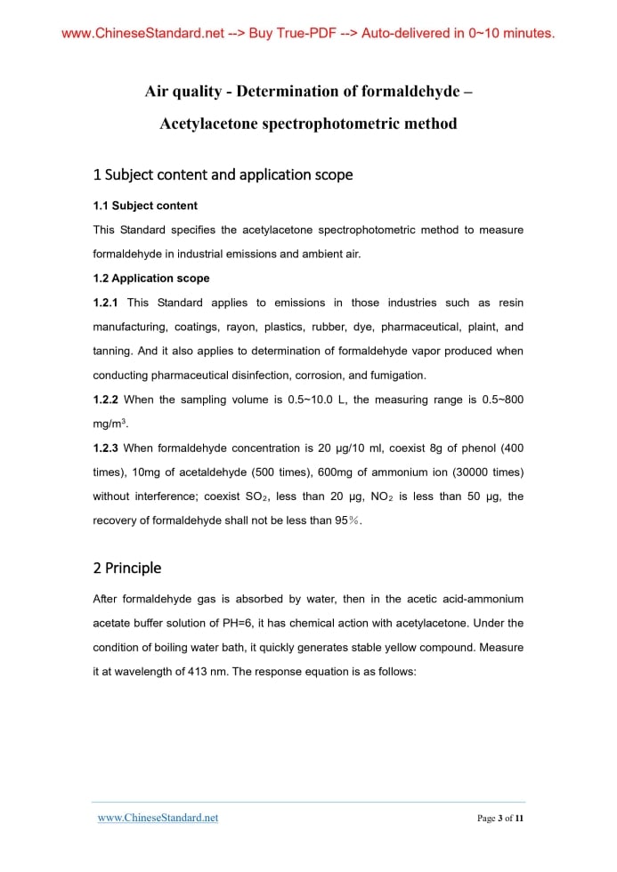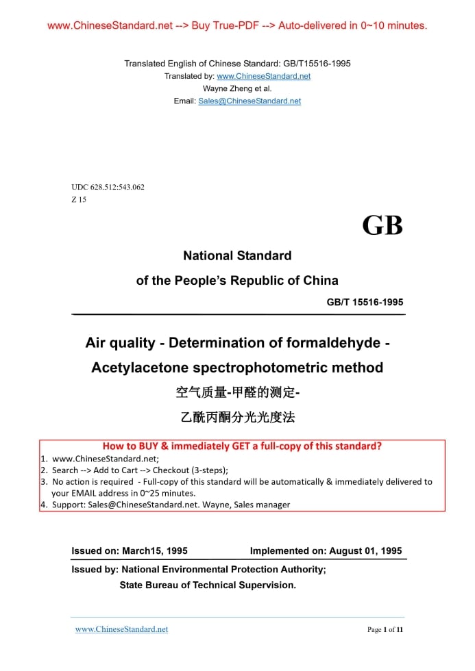 GB/T 15516-1995: Air quality - Determination of formaldehyde - Acetylacetone spectrophotometric method Delivery: 9 seconds. True-PDF full-copy in English & invoice will be downloaded + auto-delivered via email. See step-by-step procedure
