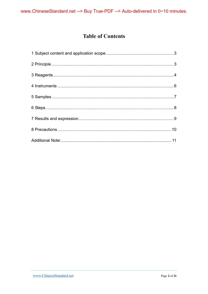 GB/T 15516-1995: Air quality - Determination of formaldehyde - Acetylacetone spectrophotometric method---This is an excerpt. Full copy of true-PDF in English version (including equations, symbols, images, flow-chart, tables, and figures etc.), auto-downloaded/delivered in 9 seconds, can be purchased online: https://www.ChineseStandard.net/PDF.aspx/GBT15516-1995 UDC 628.512.543.062 Z 15 GB National Standard of the People’s Republic of China Air quality - Determination of formaldehyde - Acetylacetone spectrophotometric method Issued on. MARCH15, 1995 Implemented on. AUGUST 01, 1995 Issued by. National Environmental Protection Authority; State Bureau of Technical Supervision. Table of Contents1 Subject content and application scope... 3 2 Principle... 3 3 Reagents... 4 4 Instruments... 6 5 Samples... 7 6 Steps... 8 7 Results and expression... 9 8 Precautions... 10 Additional Note... 11 Air quality - Determination of formaldehyde – Acetylacetone spectrophotometric method1 Subject content and application scope1.1 Subject content This Standard specifies the acetylacetone spectrophotometric method to measure formaldehyde in industrial emissions and ambient air. 1.2 Application scope 1.2.1 This Standard applies to emissions in those industries such as resin manufacturing, coatings, rayon, plastics, rubber, dye, pharmaceutical, plaint, and tanning. And it also applies to determination of formaldehyde vapor produced when conducting pharmaceutical disinfection, corrosion, and fumigation. 1.2.2 When the sampling volume is 0.5~10.0 L, the measuring range is 0.5~800 mg/m3. 1.2.3 When formaldehyde concentration is 20 µg/10 ml, coexist 8g of phenol (400 times), 10mg of acetaldehyde (500 times), 600mg of ammonium ion (30000 times) without interference; coexist SO2, less than 20 µg, NO2 is less than 50 µg, the recovery of formaldehyde shall not be less than 95%.2 PrincipleAfter formaldehyde gas is absorbed by water, then in the acetic acid-ammonium acetate buffer solution of PH=6, it has chemical action with acetylacetone. Under the condition of boiling water bath, it quickly generates stable yellow compound. Measure it at wavelength of 413 nm. The response equation is as follows.3 ReagentsUnless otherwise specified, when analyzing, it shall use the analytical pure reagents which comply with national standard and the water prepared according to 3.1. 3.1 Organic-free distilled water. Add a small mount of alkaline solution of potassium permanganate into water. Then distill it (Water shall always be red throughout the whole distillation process, or potassium permanganate shall be added at any time). 3.2 Absorbing liquid. The organic-free double distilled water (3.1). 3.3 Ammonium acetate (NH4CH3COO). 3.4 Glacial acetic acid (CH3COOH). ρ=1.055. 3.5 Acetylacetone (C5H8O2). ρ=0.975. 3.6 Hydrochloric acid (HCl) solution. ρ=1.19 (1+5). 3.7 Sodium hydroxide (NaOH) solution. 30g/100ml. 3.8 Iodine (I2). 3.9 Potassium iodide (KI). 3.10 Potassium iodate (KIO3) solution c(1/6KIO3)=0.1000 mol/L. Weigh 3.567g of potassium iodate which has been dried at 110°C for 2h. Dissolve into water. Dilute to constant volume in the 1000ml flask. 3.11 Starch solution. 1g/100ml. Weigh 1g of starch. Mix them into paste with water. Pour it into 100ml of boiling water. It is transparent solution. It shall be prepared before using. 3.12 Sodium thiosulfate solution. c(Na2S2O3)=0.1 mol/L. Weigh 25g of sodium thiosulfate solution (Na2S2O3•5H2O) and 2g of sodium (Na2CO3) to dissolve into 1000ml of water that has been freshly boiled and cooled. Store in the brown reagent bottle. Filter after placing for 1 week. And mark the concentration.4 Instruments4.1 Sampler. Air sampler. The flow range is 0.2~1.0L/min (with flow measurement device). 4.2 Soap film flowmeter. 4.6 Standard Pitot tube. With correction factor. 4.7 Inclined micro-manometer. 4.8 Sampling lead pipe. Teflon tube. Inner diameter is 6~7mm, with glass fiber filter in front of the lead pipe. 4.9 Aneroid barometer. 4.10 Mercury thermometers. 0~100°C. 4.11 pH acidity.5 Samples5.1 Sample collection Sampling system is in-series consisted of sampling lead pipe (4.8), sampling absorption tube (4.3), and air sampler (4.1). 5.2 Sample storage Collected sample shall be stored up at 2~5°C. Complete the analysis in 2 days, so as to prevent formaldehyde from oxidation. 5.3 Calibration of sample volume6 Steps6.1 Drawing of calibration curve Take 7 piece of 25ml colorimetric tube with stopper. Prepare the standard color columns according to following table. 6.2 Sample determination Transfer the after-absorbing sample solution into 50ml or 100ml flask. Use water to dilute to constant volume. Take less than 10ml of sample (the drawn amount is determined by sample concentration). In 25ml colorimetric tube (4.4), use water to fix constant volume to 10.0ml scale. 6.3 Blank test Use the absorbing liquid of blank absorption tube which does not sample on the spot to perform blank determination according to (6.1).7 Results and expression7.1 Calculation formula Calculate the formaldehyde absorbance y in the test sample with formula (6). 7.2 Precision and accuracy Analyzed by 6 laboratories, the 2 samples containing 2.96mg/L and 3.55mg/L of formaldehyde are consistent.8 PrecautionsFormaldehyde will be oxidized under the sunshine. Therefore, when sampling, it shall use brown absorption tube. In the transport and storage process of sample, it shall adopt the measures to avoid light. ......Source: Above contents are excerpted from the full-copy PDF -- translated/reviewed by: www.ChineseStandard.net / Wayne Zheng et al. Tips & Frequently Asked Questions:Question 1: How long will the true-PDF of English version of GB/T 15516-1995 be delivered?Answer: The full copy PDF of English version of GB/T 15516-1995 can be downloaded in 9 seconds, and it will also be emailed to you in 9 seconds (double mechanisms to ensure the delivery reliably), with PDF-invoice.Question 2: Can I share the purchased PDF of GB/