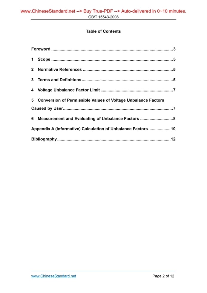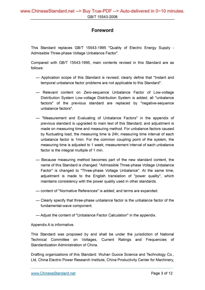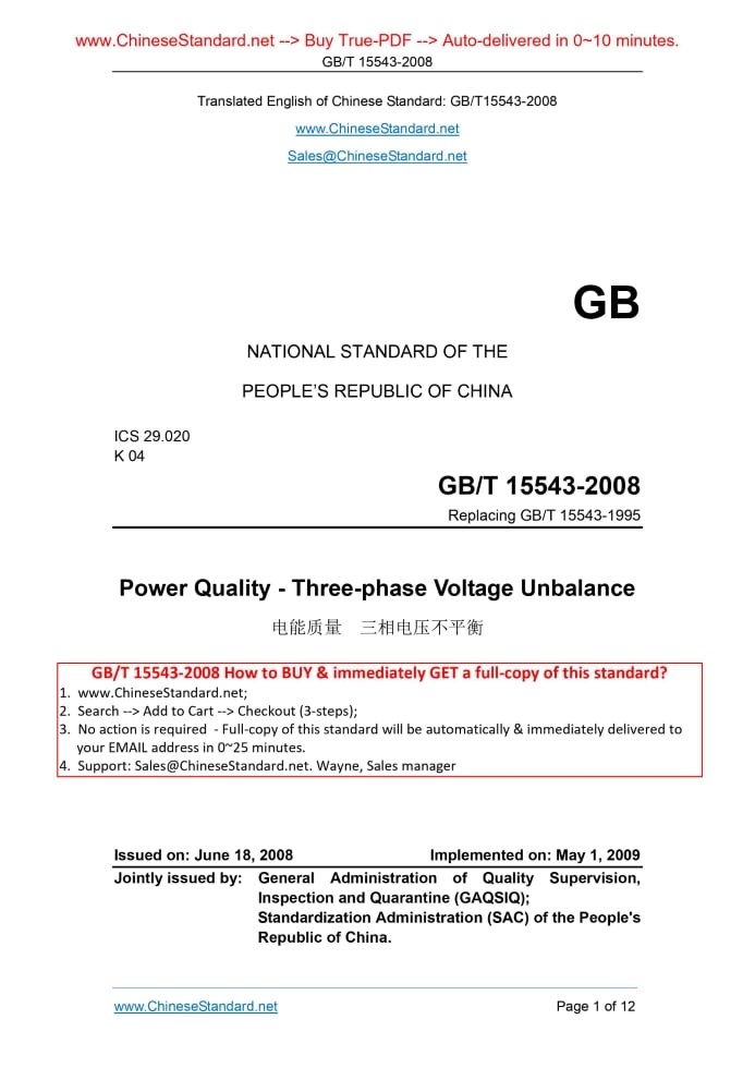 Similar standardsGB/T 15543-2008: Power quality -- Three-phase voltage unbalance---This is an excerpt. Full copy of true-PDF in English version (including equations, symbols, images, flow-chart, tables, and figures etc.), auto-downloaded/delivered in 9 seconds, can be purchased online: https://www.ChineseStandard.net/PDF.aspx/GBT15543-2008GB NATIONAL STANDARD OF THE PEOPLE’S REPUBLIC OF CHINA ICS 29.020 K 04 Replacing GB/T 15543-1995 Power Quality - Three-phase Voltage Unbalance Issued on. JUNE 18, 2008 Implemented on. MAY 1, 2009 Jointly issued by. General Administration of Quality Supervision, Inspection and Quarantine (GAQSIQ); Standardization Administration (SAC) of the People's Republic of China. Table of ContentsForeword... 3 1 Scope... 5 2 Normative References... 5 3 Terms and Definitions... 5 4 Voltage Unbalance Factor Limit... 7 5 Conversion of Permissible Values of Voltage Unbalance Factors Caused by User... 7 6 Measurement and Evaluating of Unbalance Factors... 8 Appendix A (Informative) Calculation of Unbalance Factors... 10 Bibliography... 12ForewordThis Standard replaces GB/T 15543-1995 "Quality of Electric Energy Supply - Admissible Three-phase Voltage Unbalance Factor". Compared with GB/T 15543-1995, main contents revised in this Standard are as follows. — Application scope of this Standard is revised; clearly define that "Instant and temporal unbalance factor problems are not applicable to this Standard". — Relevant content on Zero-sequence Unbalance Factor of Low-voltage Distribution System Low-voltage Distribution System is added; all "unbalance factors" of the previous standard are replaced by "negative-sequence unbalance factors". — "Measurement and Evaluating of Unbalance Factors" in the appendix of previous standard is upgraded to main text of this Standard; and adjustment is made on measuring time and measuring method. For unbalance factors caused by fluctuating load, the measuring time is 24h; measuring time interval of each unbalance factor is 1min. For the common coupling point of the system, the measuring time is adjusted to 1 week; measurement interval of each unbalance factor is the integral multiple of 1 min. — Because measuring method becomes part of the new standard content, the name of this Standard is changed; "Admissible Three-phase Voltage Unbalance Factor" is changed to "Three-phase Voltage Unbalance". At the same time, adjustment is made to the English translation of "power quality", which maintains consistency with the power quality used in other standards. — content of "Normative References" is added; and terms are expanded. — Clearly specify that three-phase unbalance factor is the unbalance factor of the fundamental-wave component. — Adjust the content of "Unbalance Factor Calculation" in the appendix. Appendix A is informative. This Standard was proposed by and shall be under the jurisdiction of National Technical Committee on Voltages, Current Ratings and Frequencies of Standardization Administration of China. Drafting organizations of this Standard. Wuhan Guoce Science and Technology Co., Ltd, China Electric Power Research Institute, China Productivity Center for Machinery, Wuhan High Voltage Institute of State Grid, China Railway Siyuan Survey and Design Group Co., Ltd, Wuhan Iron and Steel (Group) Corp., and Harbin Research Institute of Electrical Instruments. Chief drafting staffs of this Standard. Hou Tiexin, Bu Zhengliang, Lin Haixue, Liu Xun, Li Shusen, Huang Zuping, Zou Jiaping, Zhang Jianping, Mei Guihua, and Li Zhaoyang. Participating drafting staffs of this Standard. Jing Deyan, Gu Wen, Zeng Youtian, Wu Mingli, Wang Wei, Lin Xiang Nin, and Wu Lijun. The previous edition replaced by this Standard is. — GB/T 15543-1995. Power Quality - Three-phase Voltage Unbalance1 ScopeThis Standard specifies limits, calculation, measurement and evaluation methods of three-phase voltage unbalance. This Standard is applicable to, AC power system of which the nominal frequency is 50Hz is operated in normal mode, voltage unbalance at common coupling point caused by negative-sequence fundamental-wave component; and voltage unbalance at common coupling point caused by zero-sequence fundamental-wave component of the low-voltage system. Voltage permissible unbalance factor and permissible value of negative-sequence current of rated condition of electrical equipment shall still be specified by the various standards, for example, rotating motors shall meet the requirements in GB 755. Instantaneous and momentary unbalance problem are not applicable to this Standard.2 Normative ReferencesThe following documents contain provisions which, through reference in this Standard, constitute provisions of this Standard. For dated reference, subsequent amendments (excluding corrigendum) or revisions of these publications do not apply. However, parties who enter in agreement based on this Standard are encouraged to investigate the possibility of applying the most recent editions of the standards indicated below. For undated references, the latest edition of the normative document is applicable to this Standard. GB/T 156-2007 Standard Voltage (IEC 60038.2002, MOD) GB/T 12325 Power Quality - Deviation of Supply Voltage3 Terms and DefinitionsThe following terms and definitions apply to this Standard. 3.1 Voltage unbalance Three-phase voltage is different in amplitude or (and) the phase difference is not 120°, or both. 3.2 Unbalance factor It refers to the unbalanced degree of three-phase in the three-phase power system. It is represented by square mean root value percentage BETWEEN voltage, current negative-sequence fundamental-wave component or zero-sequence fundamental-wave component AND positive-sequence fundamental-wave component. Voltage, current negative-sequence unbalance factor and zero-sequence unbalance factor are respectively represented by 2U, 0U, 12 and 10. 3.3 Positive-sequence component It is the component of the positive-sequence symmetric