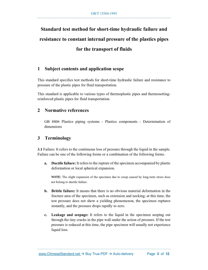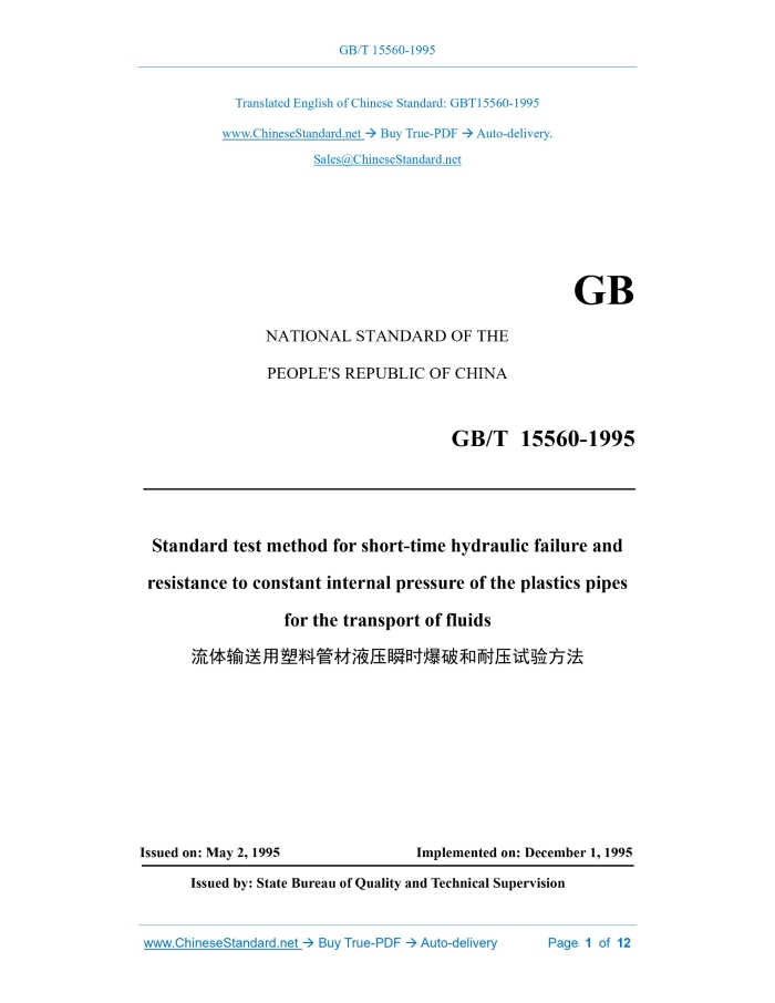GB/T 15560-1995: Standard test method for short-time hydraulic failure and resistance to constant internal pressure of the plastics pipes for the transport of fluids Delivery: 9 seconds. True-PDF full-copy in English & invoice will be downloaded + auto-delivered via email. See step-by-step procedure