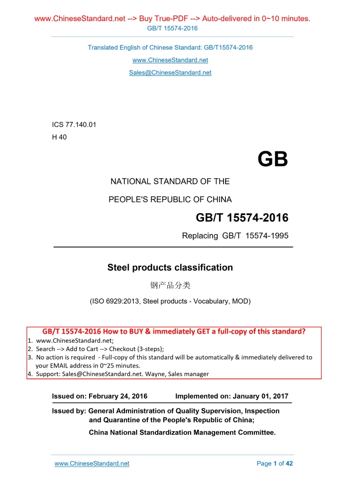 GB/T 15574-2016: Steel products classification Delivery: 9 seconds. True-PDF full-copy in English & invoice will be downloaded + auto-delivered via email. See step-by-step procedure Status: Valid GB/T 15574: Historical versions