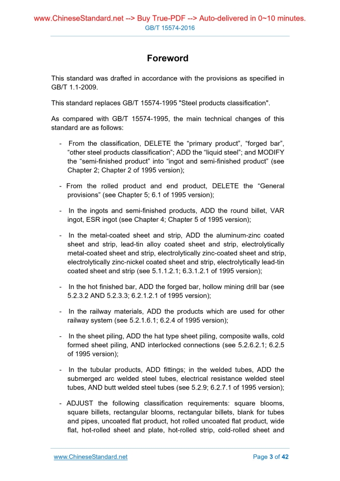 Similar standardsGB/T 15574-2016: Steel products classification---This is an excerpt. Full copy of true-PDF in English version (including equations, symbols, images, flow-chart, tables, and figures etc.), auto-downloaded/delivered in 9 seconds, can be purchased online: https://www.ChineseStandard.net/PDF.aspx/GBT15574-2016ICS 77.140.01 H 40 GB NATIONAL STANDARD OF THE PEOPLE'S REPUBLIC OF CHINA Replacing GB/T 15574-1995 Steel products classification (ISO 6929.2013, Steel products - Vocabulary, MOD) Issued on: FEBRUARY 24, 2016 Implemented on: JANUARY 01, 2017 Issued by. General Administration of Quality Supervision, Inspection and Quarantine of the People's Republic of China; China National Standardization Management Committee. Table of ContentsForeword ... 3 1 Scope ... 5 2 Classification ... 5 3 Liquid steel ... 5 4 Ingots and semi-finished products ... 5 5 Rolled finished-products and end products ... 7 6 Other products ... 23 APPENDIX A (Informative) Frame diagram of steel products (except for liquid steel) classification ... 25 APPENDIX B (Informative) Sheet piling schematics ... 29 Appendix C (Informative) Cross-sectional shape schematics of mining frame sections ... 32 Appendix D (Informative) Schematics of typical heavy sections ... 33 Appendix E (Informative) Clause number comparison list of this standard and ISO 6929.2013 ... 34 Appendix F (Informative) Technical differences between this standard and ISO 6929.2013 AND their causes ... 38ForewordThis standard was drafted in accordance with the provisions as specified in GB/T 1.1-2009. This standard replaces GB/T 15574-1995 "Steel products classification". As compared with GB/T 15574-1995, the main technical changes of this standard are as follows. - From the classification, DELETE the “primary product”, “forged bar”, “other steel products classification”; ADD the “liquid steel”; and MODIFY the “semi-finished product” into “ingot and semi-finished product” (see Chapter 2; Chapter 2 of 1995 version); - From the rolled product and end product, DELETE the “General provisions” (see Chapter 5; 6.1 of 1995 version); - In the ingots and semi-finished products, ADD the round billet, VAR ingot, ESR ingot (see Chapter 4; Chapter 5 of 1995 version); - In the metal-coated sheet and strip, ADD the aluminum-zinc coated sheet and strip, lead-tin alloy coated sheet and strip, electrolytically metal-coated sheet and strip, electrolytically zinc-coated sheet and strip, electrolytically zinc-nickel coated sheet and strip, electrolytically lead-tin coated sheet and strip (see 5.1.1.2.1; 6.3.1.2.1 of 1995 version); - In the hot finished bar, ADD the forged bar, hollow mining drill bar (see 5.2.3.2 AND 5.2.3.3; 6.2.1.2.1 of 1995 version); - In the railway materials, ADD the products which are used for other railway system (see 5.2.1.6.1; 6.2.4 of 1995 version); - In the sheet piling, ADD the hat type sheet piling, composite walls, cold formed sheet piling, AND interlocked connections (see 5.2.6.2.1; 6.2.5 of 1995 version); - In the tubular products, ADD fittings; in the welded tubes, ADD the submerged arc welded steel tubes, electrical resistance welded steel tubes, AND butt welded steel tubes (see 5.2.9; 6.2.7.1 of 1995 version); - ADJUST the following classification requirements. square blooms, square billets, rectangular blooms, rectangular billets, blank for tubes and pipes, uncoated flat product, hot rolled uncoated flat product, wide flat, hot-rolled sheet and plate, hot-rolled strip, cold-rolled sheet and Steel product classification1 ScopeThis standard specifies the basic criteria for classification of steel products in accordance with the production process, shape, size and surface condition. This standard applies to the classification of steel products in accordance with the production process, shape, size and surface condition.2 ClassificationSteel products are usually divided into four categories. a) Liquid steel (see Chapter 3); b) Ingots and semi-finished products (see Chapter 4); c) Rolled finished products and end products (see Chapter 5); d) Other products (see Chapter 6).3 Liquid steelIt refers to the steel in liquid state which is obtained through smelting or direct melting of the raw materials, AND it is used for ingot casting, continuous casting OR forging steel products.4 Ingots and semi-finished products4.1 Ingot It refers to the product obtained by casting liquid steel into moulds of a certain shape. The ingot mould’s shape shall be similar to the shape of the hot-rolled OR wrought processed material. The cross section of the ingot used for rolling a profile may be square, rectangular (width to thickness ratio less than 2), polygonal, circular, elliptical, and various special shapes. The cross section of the flat ingot which is used for rolling a sheet is rectangular, AND its width to thickness ratio is not less than 2. For the purposes of further processing, under the conditions of not changing the original classifications of ingots, it is also allowed to make it subject to the treatment below. a) USE an abrasive tool OR spray gun to clear all surface defects; b) CUT the head & tail; or otherwise CUT it to the length facilitate to further processing; c) After surface cleaning, CONDUCT cutting operation. 4.2 Semi-finished products It refers to the product obtained from a rolled or forged ingot, OR obtained by continuous casting. The semi-finished products are usually used for further rolling or forging into finished products. The cross-sections of the semi-finished products may be of various shapes (see 4.2.1 ~ 4.2.8); the cross-sectional dimensions are constant along the length direction with wider tolerances than those of the finished products AND side corners more or less rounded. It is allowed for the side surfaces to have slightly convex or concave, as well as rolling, forging or continuous casting marks, AND they can be partly or totally dressed to remove surface defects, e.g. by cutting, fla