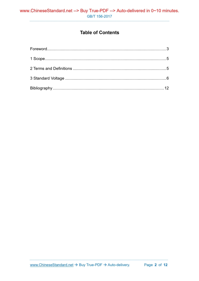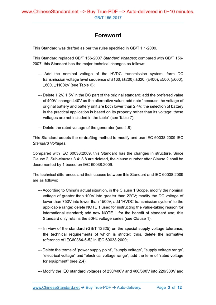 Similar standardsGB/T 156-2017: Standard voltages---This is an excerpt. Full copy of true-PDF in English version (including equations, symbols, images, flow-chart, tables, and figures etc.), auto-downloaded/delivered in 9 seconds, can be purchased online: https://www.ChineseStandard.net/PDF.aspx/GBT156-2017GB NATIONAL STANDARD OF THE PEOPLE’S REPUBLIC OF CHINA ICS 29.020 K 04 Replacing GB/T 156-2007 Standard Voltages (IEC 60038.2009, IEC Standard Voltages, MOD) Issued on: NOVEMBER 01, 2017 Implemented on: MAY 01, 2018 Issued by. General Administration of Quality Supervision, Inspection and Quarantine; Standardization Administration of PRC. Table of ContentsForeword ... 3 1 Scope ... 5 2 Terms and Definitions ... 5 3 Standard Voltage ... 6 Bibliography ... 12ForewordThis Standard was drafted as per the rules specified in GB/T 1.1-2009. This Standard replaced GB/T 156-2007 Standard Voltages; compared with GB/T 156- 2007, this Standard has the major technical changes as follows. --- Add the nominal voltage of the HVDC transmission system, form DC transmission voltage level sequence of ±160, (±200), ±320, (±400), ±500, (±660), ±800, ±1100kV (see Table 6); --- Delete 1.2V, 1.5V in the DC part of the original standard; add the preferred value of 400V; change 440V as the alternative value; add note “because the voltage of original battery and battery unit are both lower than 2.4V; the selection of battery in the practical application is based on its property rather than its voltage; these voltages are not included in the table” (see Table 7); --- Delete the rated voltage of the generator (see 4.8). This Standard adopts the re-drafting method to modify and use IEC 60038.2009 IEC Standard Voltages. Compared with IEC 60038.2009, this Standard has the changes in structure. Since Clause 2, Sub-clauses 3.4~3.8 are deleted, the clause number after Clause 2 shall be decremented by 1 based on IEC 60038.2009. The technical differences and their causes between this Standard and IEC 60038.2009 are as follows. --- According to China’s actual situation, in the Clause 1 Scope, modify the nominal voltage of greater than 100V into greater than 220V; modify the DC voltage of lower than 750V into lower than 1500V; add “HVDC transmission system” to the applicable range; delete NOTE 1 used for instructing the value-taking reason for international standard; add new NOTE 1 for the benefit of standard use; this Standard only retains the 50Hz voltage series (see Clause 1); --- In view of the standard (GB/T 12325) on the special supply voltage tolerance, the technical requirements of which is stricter; thus, delete the normative reference of IEC60364-5-52 in IEC 60038.2009; --- Delete the terms of “power supply point”, “supply voltage”, “supply voltage range”, “electrical voltage” and “electrical voltage range”; add the term of “rated voltage for equipment” (see 2.4); --- Modify the IEC standard voltages of 230/400V and 400/690V into 220/380V and Standard Voltages1 ScopeThis Standard specifies the nominal voltage value to be. --- The preferred value for the nominal voltage of the power supply system; --- The reference value for the equipment and system design. This Standard is applicable to. --- AC transmission, distribution, power systems and equipment with nominal voltage greater than 220V, standard frequency of 50Hz. --- AC and DC traction system. --- Equipment with rated voltage lower than 120V, standard frequency of 50Hz (but not absolutely limited), DC voltage less than 1500V. They include batteries (consist of primary battery and battery cell), other power supply units (AC or DC), electrical equipment (including industrial and communication), and electrical appliances. --- HVDC transmission system. This Standard is not applicable to the voltages that characterize or transmit signals and measurements. This Standard is not applicable to the voltages of the elements, components, parts inside the electrical equipment. NOTE 1. the AC voltage is the rms value; while the DC voltage is the ripple-free DC voltage value in this Standard. NTOE 2. test voltage, test conditions, acceptance criteria require to be specified in the system and product standards.2 Terms and DefinitionsThe following terms and definitions are applicable to this document. 2.1 Nominal system voltage It is used to mark or identify a given value of the system voltage. NOTE. rewrite GB/T 2900.50-2008, definition 601-01-21. 2.2 Highest voltage of a system The maximum operating voltage value that occurs at any point in the system, or at any time during the normal system operation. NOTE. Transient overvoltage (such as those caused by switching operation) and abnormal transient voltage change shall be excluded. [GB/T 2900.50-2008, definition 601-01-23]. 2.3 Lowest voltage of a system The minimum operating voltage that occurs at any point in a system, or at any time during normal system operation. NOTE. Transient overvoltage (such as those caused by switching operation) and abnormal transient voltage change shall be excluded. [GB/T 2900.50-2008, definition 601-01-24]. 2.4 Rated voltage (for equipment) The voltage specified by the manufacturer for an electrical equipment under specified operating conditions. NOTE. rewrite GB/T2900.1-2008, definition 3.5.86. 2.5 Highest voltage for equipment The highest voltage for the equipment is specified to indicate. a) Insulation; b) Other performance associated with the high voltage for equipment. NOTE. the equipment can only be used in the systems where the highest voltage of a system is no greater than the highest voltage for equipment.3 Standard Voltage3.1 AC system and related equipment with nominal voltage of 220V~1000V The standard voltages of AC system and relevant equipment with nominal voltage of 220V~1000V shall be selected from Table 1. In the Table, the lower value in the same set of data indicates the phase voltage; while the higher value indicates the line voltage;