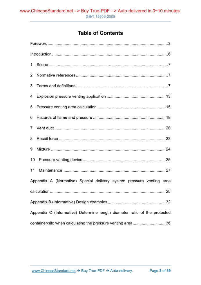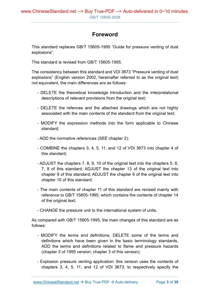 Similar standardsGB/T 15605-2008: Guide for pressure venting of dust explosions---This is an excerpt. Full copy of true-PDF in English version (including equations, symbols, images, flow-chart, tables, and figures etc.), auto-downloaded/delivered in 9 seconds, can be purchased online: https://www.ChineseStandard.net/PDF.aspx/GBT15605-2008GB NATIONAL STANDARD ICS 13.230 C 67 Replacing GB/T 15605-1995 Guide for pressure venting of dust explosions Issued on: DECEMBER 15, 2008 Implemented on: OCTOBER 01, 2009 Issued by. General Administration of Quality Supervision, Inspection and Quarantine of the People's Republic of China; Standardization Administration of the People's Republic of China. Table of ContentsForeword... 3 Introduction... 6 1 Scope... 7 2 Normative references... 7 3 Terms and definitions... 7 4 Explosion pressure venting application... 13 5 Pressure venting area calculation... 15 6 Hazards of flame and pressure... 18 7 Vent duct... 20 8 Recoil force... 23 9 Mixture... 24 10 Pressure venting device... 25 11 Maintenance... 27 Appendix A (Normative) Special delivery system pressure venting area calculation... 28 Appendix B (Informative) Design examples... 32 Appendix C (Informative) Determine length diameter ratio of the protected container/silo when calculating the pressure venting area... 36ForewordThis standard replaces GB/T 15605-1995 “Guide for pressure venting of dust explosions”. This standard is revised from GB/T 15605-1995. The consistency between this standard and VDI 3673 “Pressure venting of dust explosions” (English version 2002, hereinafter referred to as the original text) not equivalent, the main differences are as follows. - DELETE the theoretical knowledge introduction and the interpretational descriptions of relevant provisions from the original text; - DELETE the refences and the attached drawings which are not highly associated with the main contents of the standard from the original text; - MODIFY the expression methods into the form applicable to Chinese standard; - ADD the normative references (SEE chapter 2); - COMBINE the chapters 3, 4, 5, 11, and 12 of VDI 3673 into chapter 4 of this standard; - ADJUST the chapters 7, 8, 9, 10 of the original text into the chapters 5, 6, 7, 8 of this standard; ADJUST the chapter 13 of the original text into chapter 9 of this standard; ADJUST the chapter 6 of the original text into chapter 10 of this standard; - The main contents of chapter 11 of this standard are revised mainly with reference to GB/T 15605-1995, which contains the contents of chapter 14 of the original text; - CHANGE the pressure unit to the international system of units. As compared with GB/T 15605-1995, the main changes of this standard are as follows. - MODIFY the terms and definitions, DELETE some of the terms and definitions which have been given in the basic terminology standards, ADD the terms and definitions related to flame and pressure hazards (chapter 3 of 1995 version; chapter 3 of this version); - Explosion pressure venting application. this version uses the contents of chapters 3, 4, 5, 11, and 12 of VDI 3673, to respectively specify the applications in different place pressure venting such as containers, buildings, pipelines, systems connected to pipeline, and so on. DELETE the chapter 6 and chapter 7 of the 1995 version, and COMBINE the contents with chapter 4 of 1995 version into chapter 4 of this version (chapter 4, 6 and 7 of the 1995 version; chapter 4 of this version); - Venting area calculation method. the 1995 version mainly uses the calculation method of NFPA 68.1988, whilst this version uses the calculation method of VDI 3673.2002 (chapter 5 and chapter 8 of 1995 version, chapter 5 of this version); - This version no longer uses the venting area Nomogram, but uses the fitting formula (chapter 5 and chapter 8 of 1995 version, chapter 5 of this version); - ADD the hazards of flame and pressure as well as the recoil force calculation in the venting process (SEE chapters 6 and 8); - Independently LIST the relevant design of the pressure venting tube (clause 5.3 of 1995 version, chapter 7 of this version); - MODIFY the combustible mixture pressure venting design (chapter 9 of 1995 version, chapter 9 of this version); - MODIFY the chapter 10 Pressure venting device, DELETE the technical provisions on the pressure venting device, ADD the anti-vacuum suction valve area calculation Nomogram (chapter 10 of 1995 version; chapter 10 of this version); - DELETE the chapter 11 Determination of activation pressure; - DELETE Appendix A “Explosion pressure venting of pipeline, channel, and long container”, Appendix B “Basic principles of dust explosion pressure venting”, and Appendix C “Explosion of combustible dust”; - ADD the normative Appendix “Venting area calculation for special delivery system” (SEE Appendix A), informative Appendix “Design example” (SEE Appendix B), and informative Appendix “Length diameter ratio of protected container/bin as determined during venting area calculation” (SEE Appendix C). Appendix A of this standard is normative, Appendix B and Appendix C are informative. This standard was proposed by the State Administration of Work Safety. Guide for pressure venting of dust explosions1 ScopeThis standard gives the basic method for explosion pressure venting design in the places in presence of combustible dust and mixture. This standard applies to general industrial dust. This standard does not apply to toxic and corrosive dust, explosives or energetic materials. This standard does not apply to the equipment that subject to detonation disaster. The explosion pressure venting technology of this standard is permitted only if it does not seriously endanger the environment and does not cause injury to personal safety and health. If the actual test proved that it can ensure the same level of safety obtained with this standard, then the method used and the calculated pressure venting area are allow