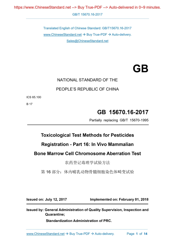 GB/T 15670.16-2017: Toxicological Test Methods for Pesticides Registration - Part 16: In Vivo Mammalian Bone Marrow Cell Chromosome Aberration Test Delivery: 9 seconds. True-PDF full-copy in English & invoice will be downloaded + auto-delivered via email. See step-by-step procedure Status: Valid