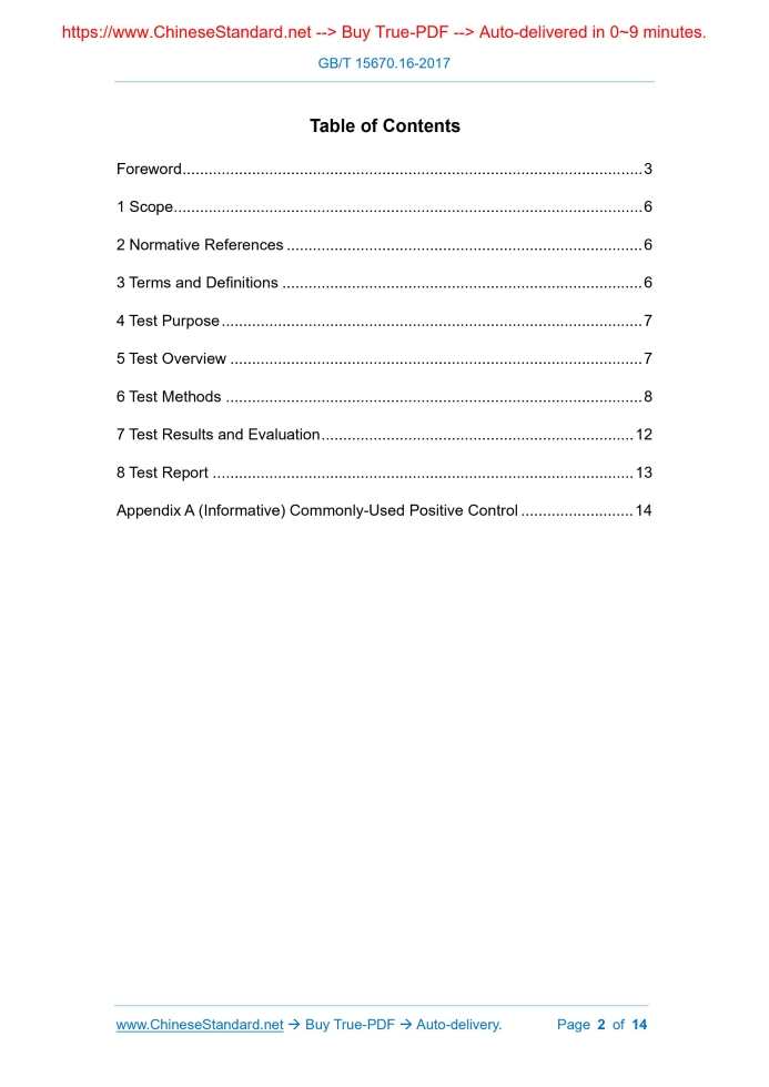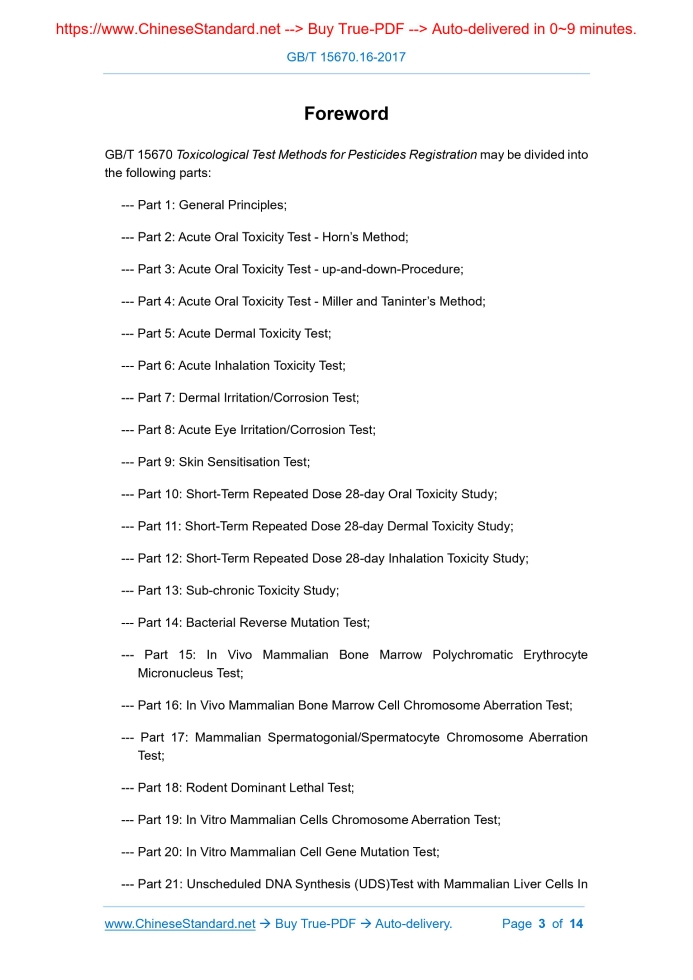 Similar standardsGB/T 15670.16-2017: Toxicological Test Methods for Pesticides Registration - Part 16: In Vivo Mammalian Bone Marrow Cell Chromosome Aberration Test---This is an excerpt. Full copy of true-PDF in English version (including equations, symbols, images, flow-chart, tables, and figures etc.), auto-downloaded/delivered in 9 seconds, can be purchased online: https://www.ChineseStandard.net/PDF.aspx/GBT15670.16-2017 GB NATIONAL STANDARD OF THE PEOPLE’S REPUBLIC OF CHINA ICS 65.100 B 17 GB 15670.16-2017 Partially replacing GB/T 15670-1995 Toxicological Test Methods for Pesticides Registration - Part 16: In Vivo Mammalian Bone Marrow Cell Chromosome Aberration Test ISSUED ON: JULY 12, 2017 IMPLEMENTED ON: FEBRUARY 01, 2018 Issued by: General Administration of Quality Supervision, Inspection and Quarantine; Standardization Administration of PRC. Table of ContentsForeword ... 3 1 Scope ... 6 2 Normative References ... 6 3 Terms and Definitions ... 6 4 Test Purpose ... 7 5 Test Overview ... 7 6 Test Methods ... 8 7 Test Results and Evaluation ... 12 8 Test Report ... 13 Appendix A (Informative) Commonly-Used Positive Control ... 14ForewordGB/T 15670 Toxicological Test Methods for Pesticides Registration may be divided into the following parts: --- Part 1: General Principles; --- Part 2: Acute Oral Toxicity Test - Horn’s Method; --- Part 3: Acute Oral Toxicity Test - up-and-down-Procedure; --- Part 4: Acute Oral Toxicity Test - Miller and Taninter’s Method; --- Part 5: Acute Dermal Toxicity Test; --- Part 6: Acute Inhalation Toxicity Test; --- Part 7: Dermal Irritation/Corrosion Test; --- Part 8: Acute Eye Irritation/Corrosion Test; --- Part 9: Skin Sensitisation Test; --- Part 10: Short-Term Repeated Dose 28-day Oral Toxicity Study; --- Part 11: Short-Term Repeated Dose 28-day Dermal Toxicity Study; --- Part 12: Short-Term Repeated Dose 28-day Inhalation Toxicity Study; --- Part 13: Sub-chronic Toxicity Study; --- Part 14: Bacterial Reverse Mutation Test; --- Part 15: In Vivo Mammalian Bone Marrow Polychromatic Erythrocyte Micronucleus Test; --- Part 16: In Vivo Mammalian Bone Marrow Cell Chromosome Aberration Test; --- Part 17: Mammalian Spermatogonial/Spermatocyte Chromosome Aberration Test; --- Part 18: Rodent Dominant Lethal Test; --- Part 19: In Vitro Mammalian Cells Chromosome Aberration Test; --- Part 20: In Vitro Mammalian Cell Gene Mutation Test; --- Part 21: Unscheduled DNA Synthesis (UDS)Test with Mammalian Liver Cells In Toxicological Test Methods for Pesticides Registration - Part 16: In Vivo Mammalian Bone Marrow Cell Chromosome Aberration Test1 ScopeThis Part of GB/T15670 specifies the basic principles, methods and requirements of the in vivo mammalian bone marrow cell chromosome aberration test. This Part is applicable to the in vivo mammalian bone marrow cell chromosome aberration test for pesticide registration.2 Normative ReferencesThe following documents are essential to the application of this document. For the dated documents, only the versions with the dates indicated are applicable to this document; for the undated documents, only the latest version (including all the amendments) is applicable to this document. GB 14925 Laboratory Animal - Requirements of Environment and Housing Facilities3 Terms and DefinitionsFor the purpose of this document, the following terms and definitions apply. 3.1 Chromatid-type aberration Chromosomal structural damage, which is manifested by damage of chromatids break or chromatids break and recombination. 3.2 Chromosome-type aberration Chromosome structure damage, which is manifested by break or break recombination changes at the same site of two chromatids. 3.3 Endoreduplication The process, after the S phase of DNA replication, the nucleus does not enter the6 Test Methods6.1 Test substance and instrument reagent 6.1.1 Test substance Distilled water is preferred as the solvent. If the test substance is insoluble in water, it can be prepared into an emulsion or suspension with edible oil, edible starch, and 0.5% carboxymethyl cellulose sodium. The test substance shall be prepared fresh before gavage, unless some data show that it is stable when stored in solution (or emulsion, suspension). If it is not a common solvent, there shall be reference materials and explain its ingredients and the reason for the selection of solvent. 6.1.2 Instruments and reagents 6.1.2.1 Instruments: biological microscope, constant temperature water bath, etc. 6.1.2.2 0.1% colchicine: place in the brown bottle, and store in the refrigerator at 4°C. 6.1.2.3 Giemsa dye solution: Giemsa dye: 3.8g; Methanol: 375mL; Glycerol: 125mL. Preparation: place Giemsa dye and a small amount of methanol in a mortar and grind carefully; then add methanol to 375mL; after it is completely dissolved, add 125mL of glycerol and mix well. Put it in a 37°C thermostat for 48h. Shake several times during the heat preservation period to promote the full dissolution of the dye. Take out and filter; and use it after two weeks. 6.1.2.4 Phosphate buffer solution (pH 6.8): 1/15mol/L disodium hydrogen phosphate solution: take 9.47g of Na2HPO4 and dissolve it in 1000mL of distilled water. 1/15mol/L potassium dihydrogen phosphate solution: take 9.07g of KH2PO4 and dissolve it in 1000mL of distilled water. Mix 50 mL of disodium hydrogen phosphate solution with 50 mL of potassium dihydrogen phosphate solution; measure and adjust to pH 6.8 with a pH meter. 6.1.2.5 Giemsa application solution: take 1 portion of Giemsa dye solution and 9 portions of phosphate buffer solution (pH 6.8); mixed and prepared for current use. 6.3.2 Limit test If a single exposure (or two exposures on the same day) dose is above 2000mg/kg body weight, there is still no observable toxic effect, and no genotoxicity is expected based on the data of structurally related compounds; then 3 doses are not required for test. If the exposure time is within 14d, the dose is set to 2000 mg/kg body weight; if the exposure 