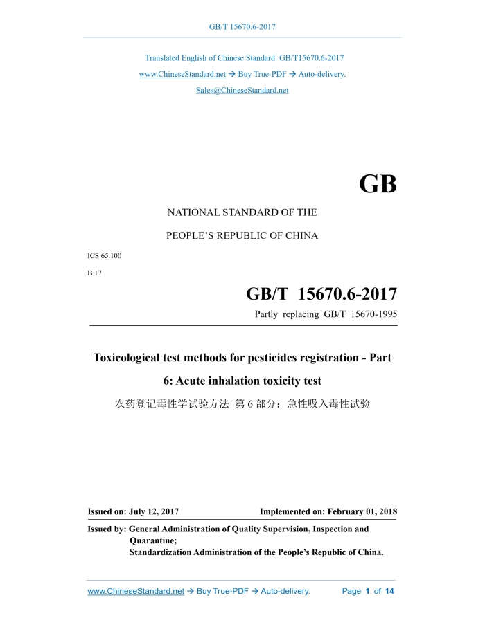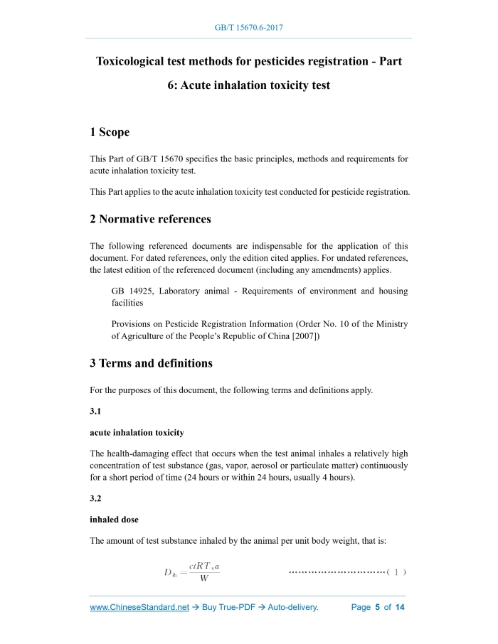 Similar standardsGB/T 15670.6-2017: Toxicological test methods for pesticides registration - Part 6: Acute inhalation toxicity test---This is an excerpt. Full copy of true-PDF in English version (including equations, symbols, images, flow-chart, tables, and figures etc.), auto-downloaded/delivered in 9 seconds, can be purchased online: https://www.ChineseStandard.net/PDF.aspx/GBT15670.6-2017 GB NATIONAL STANDARD OF THE PEOPLE’S REPUBLIC OF CHINA ICS 65.100 B 17 Partly replacing GB/T 15670-1995 Toxicological test methods for pesticides registration - Part 6.Acute inhalation toxicity test Issued on: JULY 12, 2017 Implemented on: FEBRUARY 01, 2018 Issued by. General Administration of Quality Supervision, Inspection and Quarantine; Standardization Administration of the People’s Republic of China. Table of ContentsForeword... 3 1 Scope... 5 2 Normative references... 5 3 Terms and definitions... 5 4 Purpose of the test... 7 5 Overview of the test... 7 6 Test methods... 8 7 Test results and evaluation... 12 8 Test report... 13 Toxicological test methods for pesticides registration - Part 6.Acute inhalation toxicity test1 ScopeThis Part of GB/T 15670 specifies the basic principles, methods and requirements for acute inhalation toxicity test. This Part applies to the acute inhalation toxicity test conducted for pesticide registration.2 Normative referencesThe following referenced documents are indispensable for the application of this document. For dated references, only the edition cited applies. For undated references, the latest edition of the referenced document (including any amendments) applies. GB 14925, Laboratory animal - Requirements of environment and housing facilities Provisions on Pesticide Registration Information (Order No. 10 of the Ministry of Agriculture of the People’s Republic of China [2007])3 Terms and definitionsFor the purposes of this document, the following terms and definitions apply. 3.1 acute inhalation toxicity The health-damaging effect that occurs when the test animal inhales a relatively high concentration of test substance (gas, vapor, aerosol or particulate matter) continuously for a short period of time (24 hours or within 24 hours, usually 4 hours). 3.2 inhaled dose The amount of test substance inhaled by the animal per unit body weight, that is. equal to a certain aerodynamic diameter (for example, 5 μm) account for 50% of the total mass or total weight of the aerosol sample, the aerodynamic equivalent diameter of the aerosol particles is the mass median aerodynamic equivalent diameter (5 μm) of the aerosol sample. 3.7 geometric standard deviation; GSD A dimensionless number used to describe the size range of aerosol particles. The smaller the geometric standard deviation, the higher the proportion of particles of similar size, that is, the better the uniformity of aerosol particles and the lower the dispersion. Usually, aerosol samples with a geometric standard deviation less than or equal to 2 are called single-phase dispersing aerosols. 3.8 inhalable diameter The aerodynamic equivalent diameter of particles that can be inhaled through the mouth and/or nose of the subject and deposited in any part of the respiratory tract. Aerosol particles with an aerodynamic equivalent diameter of less than 10 μm are usually called inhalable particles.4 Purpose of the testThrough short-term inhalation exposure, a preliminary understanding of the acute toxicity characteristics and dose-response relationship of the test substance on test animals can be gained, to provide scientific reference for acute inhalation toxicity classification, label management and other related toxicological studies, and also to provide a basis for formulating protective measures during production and application.5 Overview of the testAccording to the physicochemical properties of the test substance, select an appropriate method to prepare it into a gas, vapor, aerosol or particulate suspension state of specific concentration, and input it into the dynamic toxicity system; randomly divide the test animals into control and different toxicity dose groups, and place them in the toxicity system for 4 hours of exposure. After the toxicity is over, remove the test animals; carefully observe the manifestations and signs of toxic effects, death, etc. during the toxicity period and within 14 days, and perform gross autopsy on dead animals in time; at the end of the observation period, kill the animals for gross autopsy, and if diseased tissues or organs are found, conduct histopathological examination.6 Test methods6.1 Test preparation 6.1.1 Test substance The test substance shall be a sample with a stable preparation process and in compliance with the quality standards, with the name, source, batch number, content (or specification), storage conditions and preparation method, etc., and a test report attached. The excipients, solvents or other media used shall be marked with the batch number, specification and manufacturer. 6.1.2 Selection and preparation of test substance vaporization or aerosol preparation method 6.1.2.1 Gaseous test substance After mixing it with air to a certain concentration through a flow meter, directly input it into the toxicity cabinet. 6.1.2.2 Low boiling point volatile liquid test substance After volatilization through air bubbling or appropriate heating, mix it with air and pass into the toxicity cabinet. 6.1.2.3 High boiling point non-volatile liquid test substance According to the physical and chemical properties of the test object, a spray method can be selected, or an aerosol generating device can be used to prepare a liquid aerosol that meets the test requirements and then mix it with a certain amount of air and input it into the toxicity cabinet. 6.1.2.4 Powdered or solid test substances Prepare the test substance into solid aerosol using an aerosol generator; mix it with a certain amount of air and introduce it into the toxicity cabinet. 6.1.3 Dynamic inhalatio