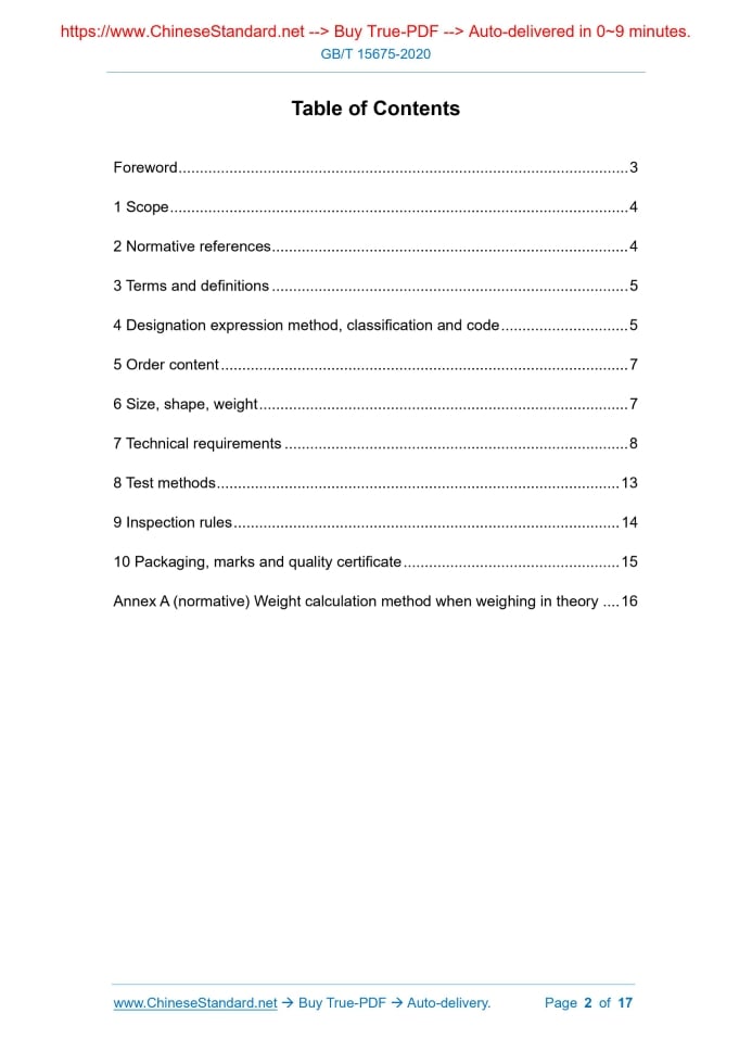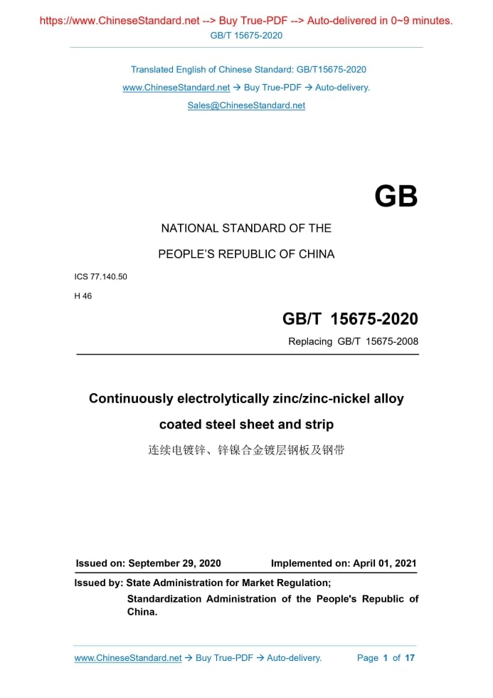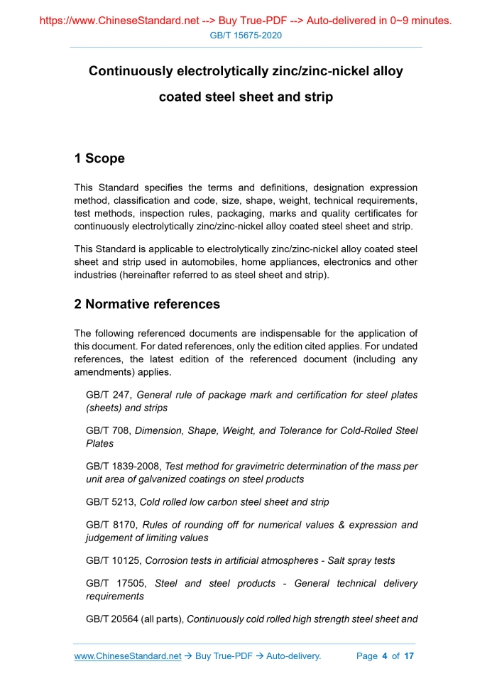 Similar standardsGB/T 15675-2020: Continuously electrolytically zinc/zinc-nickel alloy coated steel sheet and strip---This is an excerpt. Full copy of true-PDF in English version (including equations, symbols, images, flow-chart, tables, and figures etc.), auto-downloaded/delivered in 9 seconds, can be purchased online: https://www.ChineseStandard.net/PDF.aspx/GBT15675-2020 GB NATIONAL STANDARD OF THE PEOPLE’S REPUBLIC OF CHINA ICS 77.140.50 H 46 Replacing GB/T 15675-2008 Continuously electrolytically zinc/zinc-nickel alloy coated steel sheet and strip Issued on. SEPTEMBER 29, 2020 Implemented on. APRIL 01, 2021 Issued by. State Administration for Market Regulation; Standardization Administration of the People's Republic of China. Table of ContentsForeword... 3 1 Scope... 4 2 Normative references... 4 3 Terms and definitions... 5 4 Designation expression method, classification and code... 5 5 Order content... 7 6 Size, shape, weight... 7 7 Technical requirements... 8 8 Test methods... 13 9 Inspection rules... 14 10 Packaging, marks and quality certificate... 15 Annex A (normative) Weight calculation method when weighing in theory... 161 ScopeThis Standard specifies the terms and definitions, designation expression method, classification and code, size, shape, weight, technical requirements, test methods, inspection rules, packaging, marks and quality certificates for continuously electrolytically zinc/zinc-nickel alloy coated steel sheet and strip. This Standard is applicable to electrolytically zinc/zinc-nickel alloy coated steel sheet and strip used in automobiles, home appliances, electronics and other industries (hereinafter referred to as steel sheet and strip).2 Normative referencesThe following referenced documents are indispensable for the application of this document. For dated references, only the edition cited applies. For undated references, the latest edition of the referenced document (including any amendments) applies. GB/T 247, General rule of package mark and certification for steel plates (sheets) and strips GB/T 708, Dimension, Shape, Weight, and Tolerance for Cold-Rolled Steel Plates GB/T 1839-2008, Test method for gravimetric determination of the mass per unit area of galvanized coatings on steel products GB/T 5213, Cold rolled low carbon steel sheet and strip GB/T 8170, Rules of rounding off for numerical values & expression and judgement of limiting values GB/T 10125, Corrosion tests in artificial atmospheres - Salt spray tests GB/T 17505, Steel and steel products - General technical delivery requirements3 Terms and definitionsFor the purposes of this document, the following terms and definitions apply. 3.1 electrolytic zinc coating; ZE a coating that is composed of pure zinc and produced by continuous electrolytically zinc production line through electroplating; the coating does not contain any trace elements that are harmful to the bonding force of the binder or the paint performance 3.3 anti-fingerprint treatment conduct electrolytic passivation treatment on the surface of steel sheet and strip and apply with anti-fingerprint film, so as to improve the stain resistance of electronic or electrical products4 Designation expression method, classification and code4.1 Designation expression method The designation of steel sheet and strip is composed of two parts. substrate designation and coating type. They are connected with "+" in the middle. 4.2 Classification and code 4.2.1 Steel sheet and strip are divided into three levels according to surface quality. The level code shall meet the requirements of Table 1. 4.2.2 Steel sheet and strip are divided into two types according to the type of coating. pure zinc coating (ZE) and zinc-nickel alloy coating (ZN). 4.2.3 Steel sheet and strip are divided into three forms according to coating form. equal-thickness coating, differential-thickness coating and single-sided coating. 4.2.5 The type and code of surface treatment shall meet the requirements of Table 2.5 Order content5.1 The contract or order for placing an order in accordance with this Standard shall include the following. 5.2 If the size and unevenness accuracy, surface quality level and packaging method are not specified in the order contract, then the normal size, unevenness accuracy, and surface quality level are high level surfaces.6 Size, shape, weight6.1 The nominal thickness of steel sheet and strip is the sum of the thickness of the substrate and the thickness of the coating. 6.2 The size, shape and allowable deviation of steel sheet and strip shall meet the requirements of GB/T 708.7 Technical requirements7.1 Substrate Steel sheet and strip can use products in GB/T 5213, GB/T 20564 (all parts) as substrates. According to the negotiation between the supplier and the purchaser, products other than the above-mentioned standards can also be used as the substrate. 7.3 Smelting method Steel shall be smelted by oxygen converter or electric furnace. Unless otherwise specified, the smelting method is chosen by the supplier. 7.4 Mechanical and technological properties 7.4.3 For electro-galvanized, zinc-nickel alloy coated steel sheet and strip on other substrates, the requirements for mechanical and technological properties shall be negotiated and determined at the time of order. 7.5 Coating weight 7.5.1 The available weight range of pure zinc coating and zinc-nickel alloy coating shall meet the requirements of Table 3. 7.5.2 The recommended coating weight codes are shown in Table 4.If the purchaser has special requirements, other coating weights can also be provided after negotiation between the supplier and the purchaser. 7.5.3 The weight of single-sided and single-point coatings of equal-thickness coatings shall meet the requirements of Table 4. 7.5.4 For unequal-thickness coating, single-sided coating and equal-thickness 7.6 Coating adhesion The adhesion of the coating shall be tested according to the test method specified in GB/T 39130.Unless otherwise specif