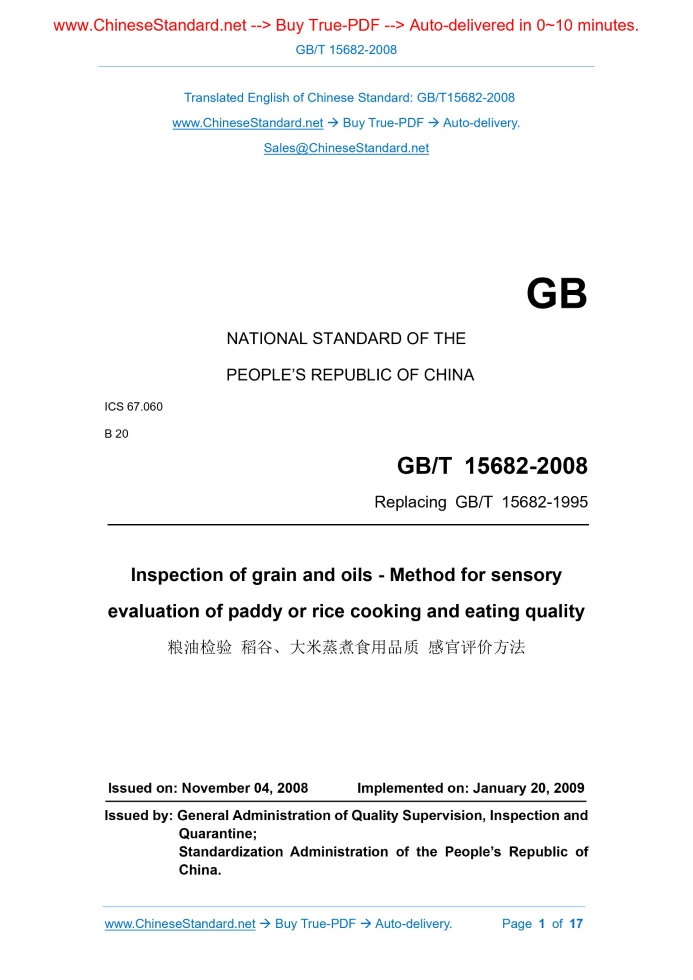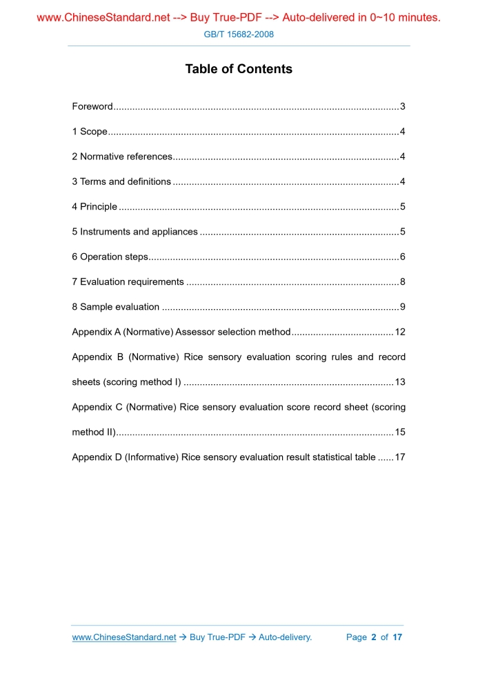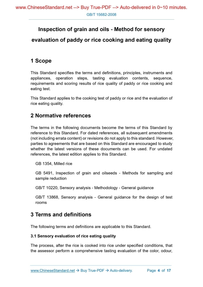 Similar standardsGB/T 15682-2008: Inspection of grain and oils - Method for sensory evaluation of paddy or rice cooking and eating quality---This is an excerpt. Full copy of true-PDF in English version (including equations, symbols, images, flow-chart, tables, and figures etc.), auto-downloaded/delivered in 9 seconds, can be purchased online: https://www.ChineseStandard.net/PDF.aspx/GBT15682-2008 GB NATIONAL STANDARD OF THE PEOPLE’S REPUBLIC OF CHINA ICS 67.060 B 20 Replacing GB/T 15682-1995 Inspection of grain and oils - Method for sensory evaluation of paddy or rice cooking and eating quality ISSUED ON: NOVEMBER 04, 2008 IMPLEMENTED ON: JANUARY 20, 2009 Issued by: General Administration of Quality Supervision, Inspection and Quarantine; Standardization Administration of the People’s Republic of China. Table of ContentsForeword ... 3 1 Scope ... 4 2 Normative references ... 4 3 Terms and definitions ... 4 4 Principle ... 5 5 Instruments and appliances ... 5 6 Operation steps ... 6 7 Evaluation requirements ... 8 8 Sample evaluation ... 9 Appendix A (Normative) Assessor selection method ... 12 Appendix B (Normative) Rice sensory evaluation scoring rules and record sheets (scoring method I) ... 13 Appendix C (Normative) Rice sensory evaluation score record sheet (scoring method II) ... 15 Appendix D (Informative) Rice sensory evaluation result statistical table ... 17 Inspection of grain and oils - Method for sensory evaluation of paddy or rice cooking and eating quality1 ScopeThis Standard specifies the terms and definitions, principles, instruments and appliances, operation steps, tasting evaluation contents, sequence, requirements and scoring results of rice quality of paddy or rice cooking and eating test. This Standard applies to the cooking test of paddy or rice and the evaluation of rice eating quality.2 Normative referencesThe terms in the following documents become the terms of this Standard by reference to this Standard. For dated references, all subsequent amendments (not including errata content) or revisions do not apply to this standard. However, parties to agreements that are based on this Standard are encouraged to study whether the latest versions of these documents can be used. For undated references, the latest edition applies to this Standard. GB 1354, Milled rice GB 5491, Inspection of grain and oilseeds - Methods for sampling and sample reduction GB/T 10220, Sensory analysis - Methodology - General guidance GB/T 13868, Sensory analysis - General guidance for the design of test rooms3 Terms and definitionsThe following terms and definitions are applicable to this Standard. 3.1 Sensory evaluation of rice eating quality The process, after the rice is cooked into rice under specified conditions, that the assessor perform a comprehensive tasting evaluation of the color, odour, 5.11 Round white porcelain dinner plate: the diameter is about 20 cm; the edge of the plate is equally glued with plastic adhesive tapes in four colors of red, yellow, blue and green.6 Operation steps6.1 Sample preparation 6.1.1 Sampling Perform according to BG 5491. 6.1.2 Preparation of rice samples Take 1 500 g ~ 2 000 g of rice; use the hulling machine (5.1) for hulling to obtain brown rice; prepare the brown rice on the rice mill (5.2) into the standard third- class precision rice that is specified in GB 1354. For commercial rice, directly take samples. 6.1.3 Number and registration of samples Randomly arrange the sample number, the box number (5.6) and pot number (5.4 or 5.7) of the prepared rice. Record the necessary information such as the type, place of origin, harvest or production time, storage and processing methods and time of the sample. 6.1.4 Selection of reference samples 6.1.4.1 Paddy reference sample Select 3 ~ 5 samples whose paddy fatty acid value (calculated by KOH) is not greater than 20 mg/100g (dry basis); after sample preparation and rice production, the assessor shall conduct 2 ~ 3 tastings in accordance with the provisions of 8.3.1, to select one sample of normal color, aroma and odour, whose comprehensive score is about 75 points, as the reference sample for each evaluation. 6.1.4.2 Rice reference sample Select 3 ~ 5 fresh rice samples that meet the standard third-class precision that is specified in GB 1354. Through rice production, the assessor shall conduct 2 ~ 3 tastings in accordance with 8.3.1, to select one sample of normal color, aroma and odor, whose comprehensive score is about 75 points, as the reference sample for each evaluation. 6.2 Preparation of rice 6.2.1 Preparation of small sample rice 6.2.1.1 Weighing: weigh each 10 g of sample in a steam rice dish (5.6). The number of samples is prepared as 1 for each assessor. 6.2.1.2 Rice washing: pour the weighed sample into the drain sieve (5.9); place the drain sieve in the pot (5.8); quickly add 300 mL of water; stir clockwise 10 times; stir counterclockwise 10 times; quickly change the water and repeat the above operation once. Use 200 mL of distilled water to rinse again; drain the remaining water; put it in a steam rice dish. Control the rice washing time within 3 min ~ 5 min. 6.2.1.3 Water soaking: the amount of distilled water that is added to milled long- grain nonglutinous rice is 1.6 times the sample amount; the amount of distilled water that is added to milled medium to short-grain nonglutinous rice is 1.3 times the sample amount. The water addition can be appropriately increased or decreased according to the hardness of the rice. The soaking water temperature is about 25 °C; soak for 30 min. 6.2.1.4 Steaming: add an appropriate amount of water to the steamer (5.4); use an electric stove (or induction cooker) (5.5) to heat it to boiling; remove the lid; then, cover the steam rice dish that contains the sample and place it on the steamer; cover the pot; continue to heat and start timing; steam for 40 minutes; stop heating; simmer for 20 minutes. 6.2.1.5 Put the prepared steam rice dishes of different