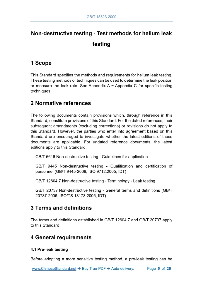 Similar standardsGB/T 15823-2009: Non-destructive testing -- Test methods for helium leak testing---This is an excerpt. Full copy of true-PDF in English version (including equations, symbols, images, flow-chart, tables, and figures etc.), auto-downloaded/delivered in 9 seconds, can be purchased online: https://www.ChineseStandard.net/PDF.aspx/GBT15823-2009GB NATIONAL STANDARD OF THE PEOPLE’S REPUBLIC OF CHINA ICS 19.100 J 04 Replacing GB/T 15823-1995 Non-destructive testing - Test methods for helium leak testing ISSUED ON: MAY 26, 2009 IMPLEMENTED ON: DECEMBER 01, 2009 Issued by: General Administration of Quality Supervision, Inspection and Quarantine of the PRC; Standardization Administration of the PRC. Table of ContentsForeword ... 3 1 Scope ... 5 2 Normative references ... 5 3 Terms and definitions ... 5 4 General requirements ... 5 5 Testing ... 7 6 Documentation ... 9 7 Report ... 9 Appendix A (Normative) Suction gun technique ... 11 Appendix B (Normative) Tracer probe technique ... 16 Appendix C (Normative) Shield technique ... 20 Non-destructive testing - Test methods for helium leak testing1 ScopeThis Standard specifies the methods and requirements for helium leak testing. These testing methods or techniques can be used to determine the leak position or measure the leak rate. See Appendix A ~ Appendix C for specific testing techniques.2 Normative referencesThe following documents contain provisions which, through reference in this Standard, constitute provisions of this Standard. For the dated references, their subsequent amendments (excluding corrections) or revisions do not apply to this Standard. However, the parties who enter into agreement based on this Standard are encouraged to investigate whether the latest editions of these documents are applicable. For undated reference documents, the latest editions apply to this Standard. GB/T 5616 Non-destructive testing - Guidelines for application GB/T 9445 Non-destructive testing - Qualification and certification of personnel (GB/T 9445-2008, ISO 9712:2005, IDT) GB/T 12604.7 Non-destructive testing - Terminology - Leak testing GB/T 20737 Non-destructive testing - General terms and definitions (GB/T 20737-2006, ISO/TS 18173:2005, IDT)3 Terms and definitionsThe terms and definitions established in GB/T 12604.7 and GB/T 20737 apply to this Standard.4 General requirements4.1 Pre-leak testing Before adopting a more sensitive testing method, a pre-leak testing can be When performing pressure/vacuum leak testing, the indicating-type pressure gauge shall be directly connected to the tested part, or connected to the tested part from the remote end; so that the tester can easily observe these pressure gauges/vacuum gauges during the whole process of testing. For large vessels or systems under test that require one or more pressure gauges/vacuum gauges, it is recommended to use a recording-type pressure gauge/vacuum gauge, to replace one of the two or more indicating-type pressure gauges/vacuum gauges. 4.3.1.4 Application When Appendix A ~ Appendix C require the use of other types of pressure gauges/vacuum gauges, they can be used separately instead of the corresponding number of indicating-type or recording-type pressure gauges; or can be used in combination. 4.3.2 Temperature measuring device When Appendix A ~ Appendix C require temperature measurement, the temperature measuring device shall pass the verification. 4.3.3 Standard leak The standard leaks used for helium mass spectrometer leak testing can be divided into the following two categories: a) Permeable standard leak - It shall be a permeable leak of glass or quartz that has been melted and calibrated. It has a helium leak rate of 1×10-11 Pa · m3/s ~ 1×10-7 Pa · m3/s; shall pass the verification. b) Channel-type standard leak - It shall be a channel-type leak calibrated with helium that allows the tracer gas to pass through a tube. It shall have a leak rate equal to or less than the product of the required testing sensitivity and the actual percentage concentration of tracer gas. It shall pass the verification.5 Testing5.1 Preparation for testing 5.1.1 Surface preparation The surface of the tested part shall be free of oil, grease, paint and other dirt that may hinder the testing. When liquids are used to clean the parts, or the water pressure test or hydro-pneumatic test is performed before the leak testing, the tested parts shall be fully dried before the testing. 5.1.2 Seal Before testing, plugs, cover plates, sealing grease, glue, or other suitable materials that can be easily removed after leak testing shall be used to seal all holes. The sealing material shall not contain tracer gas. 5.1.3 Testing temperature The minimum temperature of the tested parts during the testing shall be in accordance with the requirements of each appendix; or in accordance with the provisions of relevant product design documents and of procurement technical conditions for hydraulic, hydro-pneumatic or pneumatic tests of the tested parts. The minimum or maximum temperature during testing shall not exceed the temperature allowed by the leak testing method or technique used. 5.1.4 Pressure/vacuum (pressure limit) Unless otherwise specified in the relevant design documents and procurement technical conditions, components, which need to be subjected to pressure leak testing, shall not be tested at a pressure exceeding 25% of the design pressure. 5.2 Testing timing Leak testing should be performed before hydraulic or hydro-pneumatic testing. If the acceptance party considers it necessary, a leak testing can be performed again after the hydraulic or hydro-pneumatic testing. The pressure vessel shall not be evacuated unless it is confirmed by design calculation. 5.3 Testing methods and techniques Common helium leak testing methods and techniques are shown in Table 1. The specific requirements of various helium leak testing methods and techniques listed in Table 1 are shown in Appendix A ~ Appendix C. 