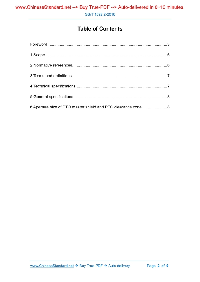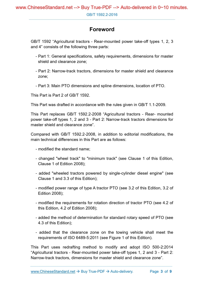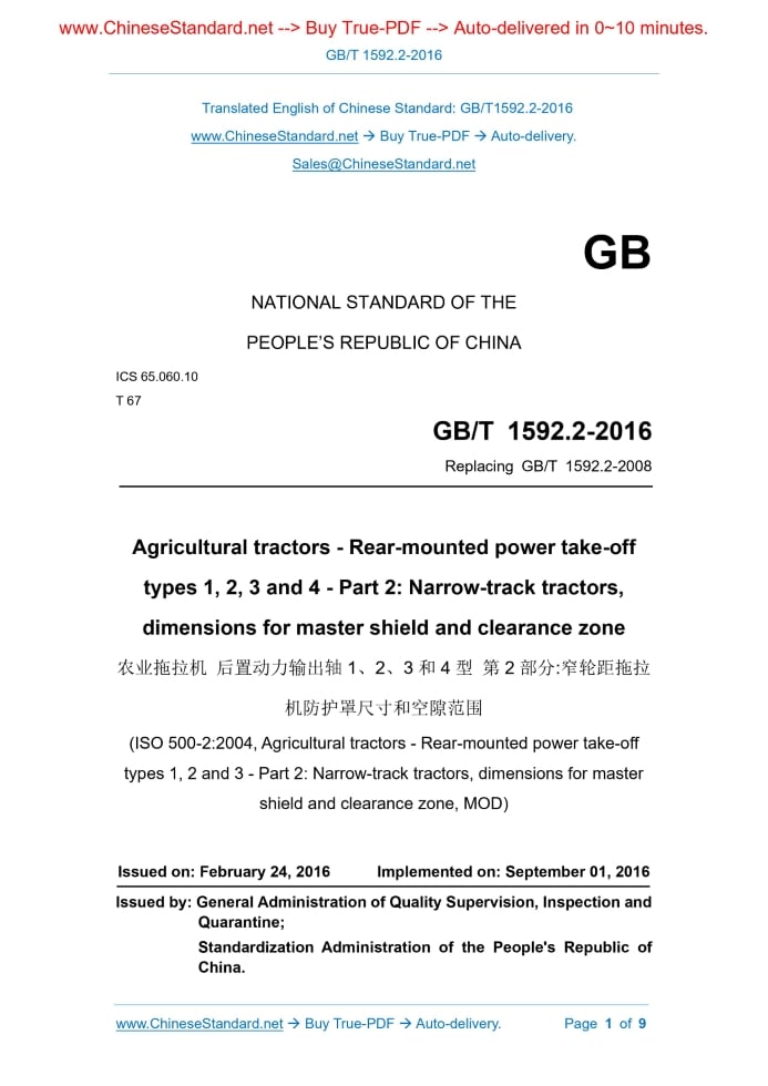 Similar standardsGB/T 1592.2-2016: Agricultural tractors -- Rear-mounted power take-off types 1, 2, 3 and 4 -- Part 2: Narrow-track tractors, dimensions for master shield and clearance zone---This is an excerpt. Full copy of true-PDF in English version (including equations, symbols, images, flow-chart, tables, and figures etc.), auto-downloaded/delivered in 9 seconds, can be purchased online: https://www.ChineseStandard.net/PDF.aspx/GBT1592.2-2016 GB NATIONAL STANDARD OF THE PEOPLE’S REPUBLIC OF CHINA ICS 65.060.10 T 67 Replacing GB/T 1592.2-2008 Agricultural tractors - Rear-mounted power take-off types 1, 2, 3 and 4 - Part 2: Narrow-track tractors, dimensions for master shield and clearance zone (ISO 500-2:2004, Agricultural tractors - Rear-mounted power take-off types 1, 2 and 3 - Part 2: Narrow-track tractors, dimensions for master shield and clearance zone, MOD) ISSUED ON: FEBRUARY 24, 2016 IMPLEMENTED ON: SEPTEMBER 01, 2016 Issued by: General Administration of Quality Supervision, Inspection and Quarantine; Standardization Administration of the People's Republic of China. Table of ContentsForeword ... 3 1 Scope ... 6 2 Normative references ... 6 3 Terms and definitions ... 7 4 Technical specifications ... 7 5 General specifications ... 8 6 Aperture size of PTO master shield and PTO clearance zone ... 8ForewordGB/T 1592 “Agricultural tractors - Rear-mounted power take-off types 1, 2, 3 and 4” consists of the following three parts: - Part 1: General specifications, safety requirements, dimensions for master shield and clearance zone; - Part 2: Narrow-track tractors, dimensions for master shield and clearance zone; - Part 3: Main PTO dimensions and spline dimensions, location of PTO. This Part is Part 2 of GB/T 1592. This Part was drafted in accordance with the rules given in GB/T 1.1-2009. This Part replaces GB/T 1592.2-2008 “Agricultural tractors - Rear- mounted power take-off types 1, 2 and 3 - Part 2: Narrow-track tractors dimensions for master shield and clearance zone”. Compared with GB/T 1592.2-2008, in addition to editorial modifications, the main technical differences in this Part are as follows: - modified the standard name; - changed "wheel track" to "minimum track" (see Clause 1 of this Edition, Clause 1 of Edition 2008); - added "wheeled tractors powered by single-cylinder diesel engine" (see Clause 1 and 3.3 of this Edition); - modified power range of type A tractor PTO (see 3.2 of this Edition, 3.2 of Edition 2008); - modified the requirements for rotation direction of tractor PTO (see 4.2 of this Edition, 4.2 of Edition 2008); - added the method of determination for standard rotary speed of PTO (see 4.3 of this Edition); - added that the clearance zone on the towing vehicle shall meet the requirements of ISO 6489-5:2011 (see Figure 1 of this Edition). This Part uses redrafting method to modify and adopt ISO 500-2:2014 “Agricultural tractors - Rear-mounted power take-off types 1, 2 and 3 - Part 2: Narrow-track tractors, dimensions for master shield and clearance zone”. Agricultural tractors - Rear-mounted power take-off types 1, 2, 3 and 4 - Part 2: Narrow-track tractors, dimensions for master shield and clearance zone1 ScopeThis Part of GB/T 1592 specifies the dimensions for master shield and clearance zone for rear-mounted power take-off types 1, 2 of wheeled tractors powered by single-cylinder diesel engine and narrow-track (gauge) tractors of which the minimum track is less than or equal to 1150 mm. This Part is applicable to rear-mounted power take-off of agricultural tractors (hereinafter referred to as the power take-off / PTO).2 Normative referencesThe following referenced documents are indispensable for the application of this document. For dated references, only the edition cited applies. For undated references, the latest edition of the referenced document (including any amendments) applies. GB/T 1592.1-2016, Agricultural tractors - Rear-mounted power take-off types 1, 2, 3 and 4 - Part 1: General specifications, safety requirements, dimensions for master shield and clearance zone (ISO 500-1:2014, MOD) GB/T 3871.3, Agricultural tractors - Test procedures - Part 3: Power tests for power take-off (GB/T 3871.3-2006, ISO 789-1:1990, MOD) GB/T 17126.2, Agricultural Tractors and Machinery - Power Take-Off Drive Shafts and Power-Input Connection - Part 2: Specification for Use of PTO Drive Shafts, And Position and Clearance of PTO Drive Line and PIC for Various Attachments (GB/T 17126.2-2009, ISO 5673-2:2005, IDT) GB/T 19408.1, Agricultural vehicles - Mechanical connections between towed and towing vehicles - Part 1: Dimensions of hitch-hooks (GB/T 19408.1-2003, ISO 6489-1:2001, IDT) GB/T 19408.2, Agricultural vehicles - Mechanical connections between towed and towing vehicles - Part 2: Specifications for clevis coupling 40 (GB/T 19408.2-2009, ISO 6489-2:2002, IDT) GB/T 19408.3, Agricultural vehicles - Mechanical connections between towed and towing vehicles - Part 3: Tractor drawbar (GB/T 19408.3-2009, ISO 6489-3:2004, IDT) GB/T 19408.4, Agricultural vehicles - Mechanical connections between towed and towing vehicles - Part 4: Dimensions of piton-type coupling (GB/T 19408.4-2009, ISO 6489-4:2004, IDT) GB/T 19408.5, Agricultural vehicles - Mechanical connections between towed and towing vehicles - Part 5: Dimensions of ball-type coupling device (GB/T 19408.5-2009, ISO 24347:2005, IDT) ISO 6489-5:2011, Agricultural vehicles - Mechanical connections between towed and towing vehicles - Part 5: Specifications for non-swivel clevis couplings3 Terms and definitionsFor the purposes of this document, the following terms and definitions apply. 3.1 power take-off; PTO an external drive shaft for transmitting rotational power to farm tool at the rear of a tractor 3.2 type A tractor a tractor that the track is fixed or adjustable; the minimum wheel track of at least one axle is not more than 950 mm; the power of PTO determined according to GB/T 3871.3 is less than 