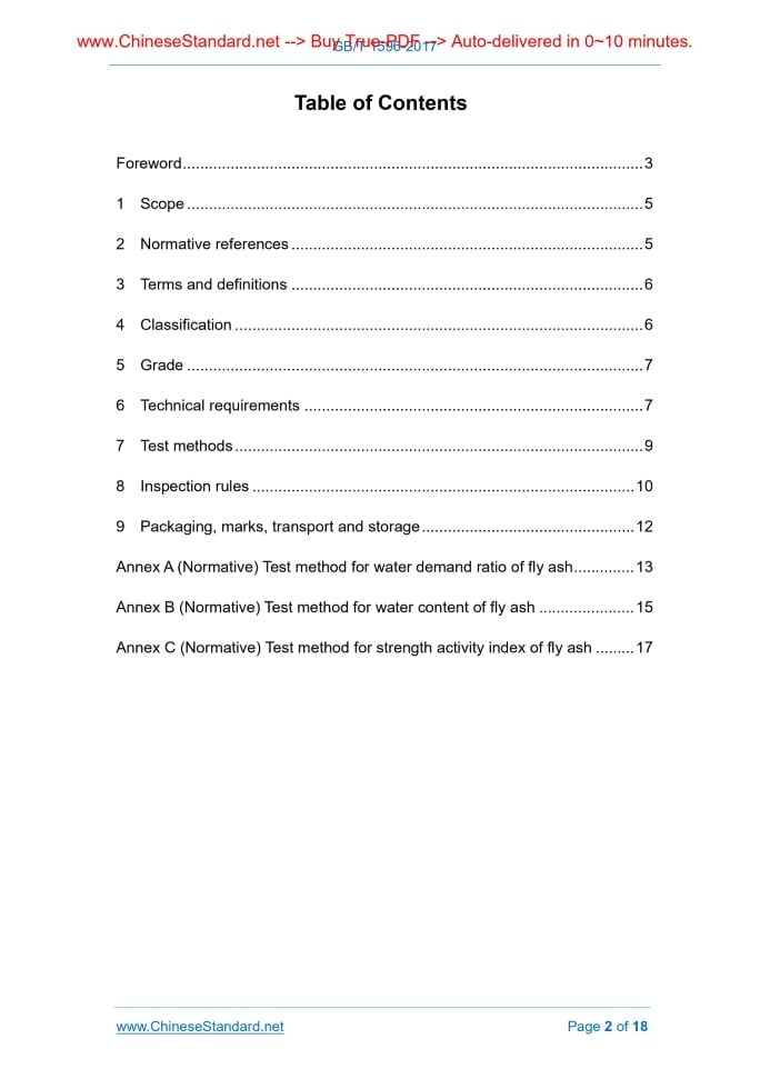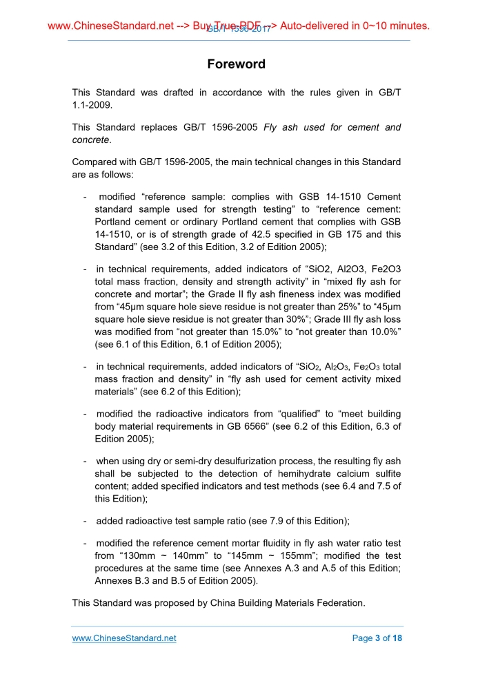 GB/T 1596-2017: Fly ash used for cement and concrete---This is an excerpt. Full copy of true-PDF in English version (including equations, symbols, images, flow-chart, tables, and figures etc.), auto-downloaded/delivered in 9 seconds, can be purchased online: https://www.ChineseStandard.net/PDF.aspx/GBT1596-2017GB NATIONAL STANDARD OF THE PEOPLE’S REPUBLIC OF CHINA ICS 91.100.10 Q 11 Replacing GB/T 1596-2005 Fly ash used for cement and concrete Issued on. JULY 12, 2017 Implemented on. JUNE 1, 2018 Issued by. General Administration of Quality Supervision, Inspection and Quarantine; Standardization Administration Committee. Table of ContentsForeword... 3 1 Scope... 5 2 Normative references... 5 3 Terms and definitions... 6 4 Classification... 6 5 Grade... 7 6 Technical requirements... 7 7 Test methods... 9 8 Inspection rules... 10 9 Packaging, marks, transport and storage... 12 Annex A (Normative) Test method for water demand ratio of fly ash... 13 Annex B (Normative) Test method for water content of fly ash... 15 Annex C (Normative) Test method for strength activity index of fly ash... 17ForewordThis Standard was drafted in accordance with the rules given in GB/T 1.1-2009. This Standard replaces GB/T 1596-2005 Fly ash used for cement and concrete. Compared with GB/T 1596-2005, the main technical changes in this Standard are as follows. - modified “reference sample. complies with GSB 14-1510 Cement standard sample used for strength testing” to “reference cement. Portland cement or ordinary Portland cement that complies with GSB 14-1510, or is of strength grade of 42.5 specified in GB 175 and this Standard” (see 3.2 of this Edition, 3.2 of Edition 2005); - in technical requirements, added indicators of “SiO2, Al2O3, Fe2O3 total mass fraction, density and strength activity” in “mixed fly ash for concrete and mortar”; the Grade II fly ash fineness index was modified from “45μm square hole sieve residue is not greater than 25%” to “45μm square hole sieve residue is not greater than 30%”; Grade III fly ash loss was modified from “not greater than 15.0%” to “not greater than 10.0%” (see 6.1 of this Edition, 6.1 of Edition 2005); - in technical requirements, added indicators of “SiO2, Al2O3, Fe2O3 total mass fraction and density” in “fly ash used for cement activity mixed materials” (see 6.2 of this Edition); - modified the radioactive indicators from “qualified” to “meet building body material requirements in GB 6566” (see 6.2 of this Edition, 6.3 of Edition 2005); - when using dry or semi-dry desulfurization process, the resulting fly ash shall be subjected to the detection of hemihydrate calcium sulfite content; added specified indicators and test methods (see 6.4 and 7.5 of this Edition); - added radioactive test sample ratio (see 7.9 of this Edition); - modified the reference cement mortar fluidity in fly ash water ratio test from “130mm ~ 140mm” to “145mm ~ 155mm”; modified the test procedures at the same time (see Annexes A.3 and A.5 of this Edition; Annexes B.3 and B.5 of Edition 2005). This Standard was proposed by China Building Materials Federation. This Standard shall be under the jurisdiction of National Technical Committee on Cement of Standardization Administration of China (SAC/TC 184). Main drafting organizations of this Standard. China Building Materials Academy, Yangtze River Water Resources Commission Academy of Sciences of the Yangtze River, Shanghai Academy of Building Research, China Three Gorges Corporation, Zhuzhou Hongxin Special Building Material Co., Ltd., Xiamen ISO Standard Sand Co. Ltd. The drafting organizations of this Standard. Yuanbaoshan Power Co., Ltd., Huadian Power International Co., Ltd., Zouxian Power Plant, Sichuan Tao Feng Fly Ash Trade Co., Ltd., Guizhou Mingchuan Fly Ash Co., Ltd., Xuanwei Power Fly Ash Development Co., Ltd., Shenzhen Weihai Building Materials Co., Ltd., Shanghai Construction Materials Co., Ltd., Jiangsu Huanghai Cement Co., Ltd., Xinjiang Tianshan Cement Co., Ltd., Shandong Zhuozhou Cement Co., Ltd., Ningbo Xinhai Construction Materials Testing Co., Ltd., Shanghai Bridge Industrial Co., Ltd., Yunnan Building Materials Products Quality Inspection Institute, Inner Mongolia Building Materials Product Quality Inspection Institute. Main drafters of this Standard. Jiang Lizhen, Zhu Wenshang, Wang Shuyin, Du Yong, Yang Lixiang, Li Wenwei, Yan Jianjun, Shen Yanjun, Chen Guiquan, Li Laifang, Xue Yueyu, Yu Haibo, Wu Baohua, Zhu Mintao, Deng Minhui, Wang Jianbiao, Li Xihua, Chen Wenyao, Gong Bo, He Jiangfang, Wu Feicai, Gao Huijuan, He Jun, Liu Qingbin, Lin Maosong, Ma Zhaomu, Wang Xingqin, Ren Fenmei. Versions of standard substituted by this Standard are. - GB/T 1596-1979, GB/T 1596-1991, GB/T 1596-2005. Fly ash used for cement and concrete1 ScopeThis Standard specifies the terms and definitions, classification, grade, technical requirements, test methods, inspection rules, packaging, marks, transport and storage of fly ash used for cement and concrete. This Standard is applicable to the fly ash used as admixture when mixing mortar and concrete as well as the fly ash used as active mixed material in cement production.2 Normative referencesThe following referenced documents are indispensable for the application of this document. For dated references, only the edition cited applies. For undated references, the latest edition of the referenced document (including any amendments) applies. GB 175, Common Portland Cement GB/T 176, Method for Chemical Analysis of Cement GB/T 208, STANDARD test method for cement density GB/T 1345, The Test Sieving Method for Fineness of Cement GB/T 1346, Standard test method for water requirement for normal consistency setting time and soundness of the Portland cement GB/T 2419, Test method for fluidity of cement mortar GBT 5484, Methods for chemical analysis of gypsum GB 6566, Limits of radionuclides in building materials3 Terms and definitionsFor the purposes