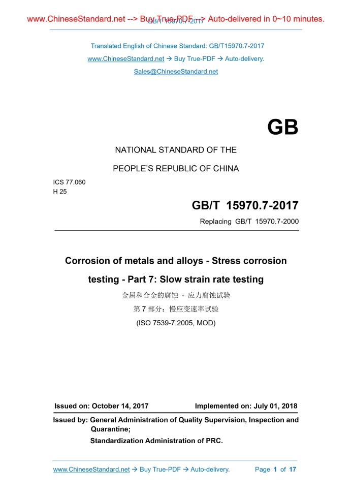 GB/T 15970.7-2017: Corrosion of metals and alloys -- Stress corrosion testing -- Part 7: Slow strain rate testing Delivery: 9 seconds. True-PDF full-copy in English & invoice will be downloaded + auto-delivered via email. See step-by-step procedure Status: Valid GB/T 15970.7: Historical versions