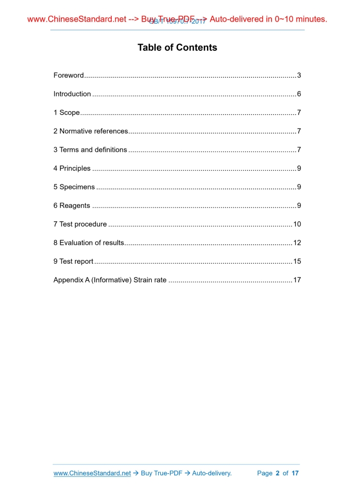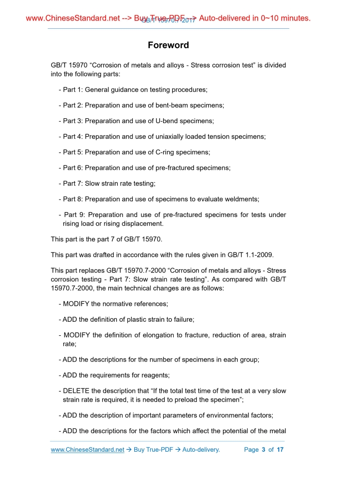 Similar standardsGB/T 15970.7-2017: Corrosion of metals and alloys -- Stress corrosion testing -- Part 7: Slow strain rate testing---This is an excerpt. Full copy of true-PDF in English version (including equations, symbols, images, flow-chart, tables, and figures etc.), auto-downloaded/delivered in 9 seconds, can be purchased online: https://www.ChineseStandard.net/PDF.aspx/GBT15970.7-2017 GB NATIONAL STANDARD OF THE PEOPLE’S REPUBLIC OF CHINA ICS 77.060 H 25 Replacing GB/T 15970.7-2000 Corrosion of metals and alloys - Stress corrosion testing - Part 7. Slow strain rate testing (ISO 7539-7.2005, MOD) Issued on: OCTOBER 14, 2017 Implemented on: JULY 01, 2018 Issued by. General Administration of Quality Supervision, Inspection and Quarantine; Standardization Administration of PRC. Table of ContentsForeword ... 3 Introduction ... 6 1 Scope ... 7 2 Normative references ... 7 3 Terms and definitions ... 7 4 Principles ... 9 5 Specimens ... 9 6 Reagents ... 9 7 Test procedure ... 10 8 Evaluation of results ... 12 9 Test report ... 15 Appendix A (Informative) Strain rate ... 17ForewordGB/T 15970 “Corrosion of metals and alloys - Stress corrosion test” is divided into the following parts. - Part 1. General guidance on testing procedures; - Part 2. Preparation and use of bent-beam specimens; - Part 3. Preparation and use of U-bend specimens; - Part 4. Preparation and use of uniaxially loaded tension specimens; - Part 5. Preparation and use of C-ring specimens; - Part 6. Preparation and use of pre-fractured specimens; - Part 7. Slow strain rate testing; - Part 8. Preparation and use of specimens to evaluate weldments; - Part 9. Preparation and use of pre-fractured specimens for tests under rising load or rising displacement. This part is the part 7 of GB/T 15970. This part was drafted in accordance with the rules given in GB/T 1.1-2009. This part replaces GB/T 15970.7-2000 “Corrosion of metals and alloys - Stress corrosion testing - Part 7. Slow strain rate testing”. As compared with GB/T 15970.7-2000, the main technical changes are as follows. - MODIFY the normative references; - ADD the definition of plastic strain to failure; - MODIFY the definition of elongation to fracture, reduction of area, strain rate; - ADD the descriptions for the number of specimens in each group; - ADD the requirements for reagents; - DELETE the description that “If the total test time of the test at a very slow strain rate is required, it is needed to preload the specimen”; - ADD the description of important parameters of environmental factors; - ADD the descriptions for the factors which affect the potential of the metal electrode; - ADD the provisions for the auxiliary electrodes that generate external currents; - ADD the requirements for the ratio of solution volume to specimen’s surface area; - ADD the sensibility of the use of plastic strain to failure to assess the stress- corrosion-fracturing; - ADD the descriptions for testing the plastic strain to failure; - ADD the expression formula of the plastic strain to failure and the limitations of the use of the formula; - MODIFY the method of determining the critical stress or strain value; - ADD the description of the test results; - DELETE the contents of the original Appendix A; - CHANGE the original Appendix B into Appendix A. This part uses the redrafting methods to modify and adopt the ISO 7539-7.2005 Corrosion of metals and alloys - Stress corrosion testing - Part 7. Method for slow strain rate testing. As compared with ISO 7539-7.2005, this part has structural changes and adds the clause 6. The technical differences between this part and ISO 7539-7.2005 and their reasons are as follows. - ADJUST the relevant standards in the normative references, to adapt to Chinese technical documents (see clause 2); - MODIFY the definition of elongation to fracture, reduction of area, strain rate, post-break elongation, part shrinkage and strain rate, to be consistent with the definition given in GB/T 228.1-2010 (see clause 3); - ADD the descriptions for the number of specimens per group, to clarify the number of specimens and reduce the risk of use (see clause 5); - ADD the requirements for the reagents, to provide a reproducible chemical environment, thereby ensuring the consistent test results (see clause 6); - ADD the requirements for the ratio of solution volume to specimen’s surface area, to ensure that the specimen is exposed to sufficient corrosive solution Corrosion of metals and alloys - Stress corrosion testing - Part 7. Slow strain rate testing1 ScopeThis part of GB/T 15970 specifies a slow strain rate test procedure, for studying the susceptibility of metals and alloys to stress-corrosion-fracturing, including hydrogen-induced failure. The term “metal” as used in this part also includes alloys. This part applies to boards, rods, wires, belts, tubes and their welded assemblies.2 Normative referencesThe following documents are essential to the application of this document. For the dated documents, only the versions with the dates indicated are applicable to this document; for the undated documents, only the latest version (including all the amendments) are applicable to this standard. GB/T 6682 Water for analytical laboratory use - Specification and test methods GB/T 15970.1 Corrosion of metals and alloys - Stress corrosion testing - Part 1. General guidance on testing procedures (GB/T 15970.1-1995, idt ISO 7539-1.1987) GB/T 15970.4 Corrosion of metals and alloys - Stress corrosion testing - Part 4. Preparation and use of uniaxially loaded tension specimens (GB/T 15970.4-2000, idt ISO 7539-4.1989) GB/T 15970.6 Corrosion of metals and alloys - Stress corrosion testing - Part 6. Preparation and use of pre-fractured specimens for tests under constant load or constant displacement (GB/T 15970.6-2007, ISO 7539-6.2003, IDT)3 Terms and definitionsThe terms and definitions as defined in GB/T 15970.1 as well as the following terms and definitions a