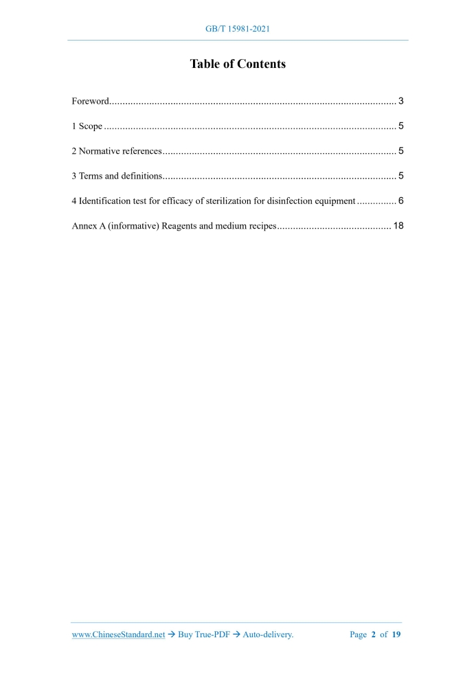 Similar standardsGB/T 15981-2021: Evaluating method for the efficacy of sterilization for disinfection equipment---This is an excerpt. Full copy of true-PDF in English version (including equations, symbols, images, flow-chart, tables, and figures etc.), auto-downloaded/delivered in 9 seconds, can be purchased online: https://www.ChineseStandard.net/PDF.aspx/GBT15981-2021NATIONAL STANDARD OF THE PEOPLE’S REPUBLIC OF CHINA ICS 11.080 CCS C 59 Replacing GB 15981-1995 Evaluating method for the efficacy of sterilization for disinfection equipment Issued on. DECEMBER 31, 2021 Implemented on. JULY 01, 2022 Issued by. State Administration for Market Regulation; Standardization Administration of the People's Republic of China. Table of ContentsForeword... 3 1 Scope... 5 2 Normative references... 5 3 Terms and definitions... 5 4 Identification test for efficacy of sterilization for disinfection equipment... 6 Annex A (informative) Reagents and medium recipes... 181 ScopeThis document specifies the test equipment, test procedures, evaluation regulations and precautions for the identification test of the efficacy of sterilization for pressure steam sterilizer, dry heat sterilizer (cabinet), ethylene oxide sterilizer, low temperature steam formaldehyde sterilizer, hydrogen peroxide gas plasma sterilizer. This document is applicable to the evaluation of the efficacy of sterilization for pressure steam sterilizers, dry heat sterilizers (cabinet), ethylene oxide sterilizers, low temperature steam formaldehyde sterilizers, and hydrogen peroxide gas plasma sterilizers.2 Normative referencesThe following referenced documents are indispensable for the application of this document. For dated references, only the edition cited applies. For undated references, the latest edition of the referenced document (including any amendments) applies. GBZ 2.1, Occupational exposure limits for hazardous agents in the workplace - Part 1.Chemical hazardous agents WS/T 649, Hygienic requirement for medical purpose-low temperature steam and formaldehyde sterilizers WS/T 683, Microbiological requirements for disinfection test3 Terms and definitionsFor the purposes of this document, the following terms and definitions apply. 3.1 D value Under the set exposure conditions, the time required to kill 90% of the total number of specific test microorganisms. 3.2 carrier Support for test microorganisms. 3.4 process challenge device; PCD A specially designed device to simulate the sterilization of articles, resistant to a specific sterilization process, and used to evaluate the effectiveness of the sterilization process.4 Identification test for efficacy of sterilization for disinfection equipment4.1 Identification test for efficacy of sterilization for pressure steam sterilizer 4.1.1 Test equipment 4.1.2 Test steps The test steps are as follows. 4.1.3 Evaluation regulations 4.1.3.1 To determine that the efficacy of sterilization of the sterilizer is qualified, it must meet the requirements at the same time. The color of the positive control medium turns yellow for each test. The negative control medium color does not change. The recovered bacteria volume of the control bacteria tablets is ≥1×105 CFU/tablet. The color of the test group remained unchanged. 4.1.3.2 When self-contained biological indicators are used for evaluation, the results are determined according to the instruction manual. 4.1.4 Precautions 4.2 Identification test for efficacy of sterilization for dry heat sterilizer (cabinet) 4.2.1 Test equipment 4.2.2 Test steps The test steps are as follows. 4.2.3 Evaluation regulations 4.2.4 Precautions 4.2.4.1 Strictly abide by aseptic technique regulations. 4.2.4.2 The test shall be carried out under full load conditions. 4.3 Identification test for efficacy of sterilization for ethylene oxide sterilizer 4.3.1 Test equipment 4.3.2 Test steps The test steps are as follows. 4.3.3 Evaluation regulations 4.3.3.1 To determine the sterilization effect of the sterilizer is qualified, it must meet the following requirements. The amount of recovered bacteria in the control group shall be greater than or equal to 1×106 CFU/tablet. There is bacterial growth in the positive control group. There is aseptic growth in the negative control group. All the test groups are aseptically grown. 4.3.4 Precautions 4.3.4.1 Ethylene oxide is flammable, explosive and toxic. To ensure the safety of the test, the operators and test personnel shall be familiar with the performance of ethylene oxide and the operating procedures of the equipment. 4.3.4.2 The working environment shall be well ventilated. The maximum allowable concentration of ethylene oxide in the air at the work site is 2mg/m3.If a person inhales too much ethylene oxide gas, it will cause poisoning symptoms. Severe cases can cause pulmonary edema. If symptoms of poisoning appear, leave the scene immediately and rest in a well-ventilated place. Mild cases breathe fresh air until symptoms clear up. Severe cases shall be sent to hospital for treatment in time. 4.4 Identification test for efficacy of sterilization for low temperature steam formaldehyde sterilizer 4.4.1 Test equipment 4.4.2 Test steps The test steps are as follows. 4.4.3 Evaluation regulations 4.4.3.1 To determine that the sterilization effect of the sterilizer is qualified, it must meet the requirements at the same time. The amount of testing recovered bacteria of the bacterial count control group in each test is 1×106 CFU/tablet~5×106 CFU/tablet. There is bacterial growth in the positive control group. There is aseptic growth in the negative control group. There is aseptic growth in the test group. 4.5 Identification test for efficacy of sterilization for hydrogen peroxide gas plasma sterilizer 4.5.1 Test equipment 4.5.1.1 Test contamination carrier. Bacillus stearothermophilus (ATCC 7953 or SSI K31) spores, with qualified resistance identification. The contamination carrier is a stainless-steel needle with a diameter of
