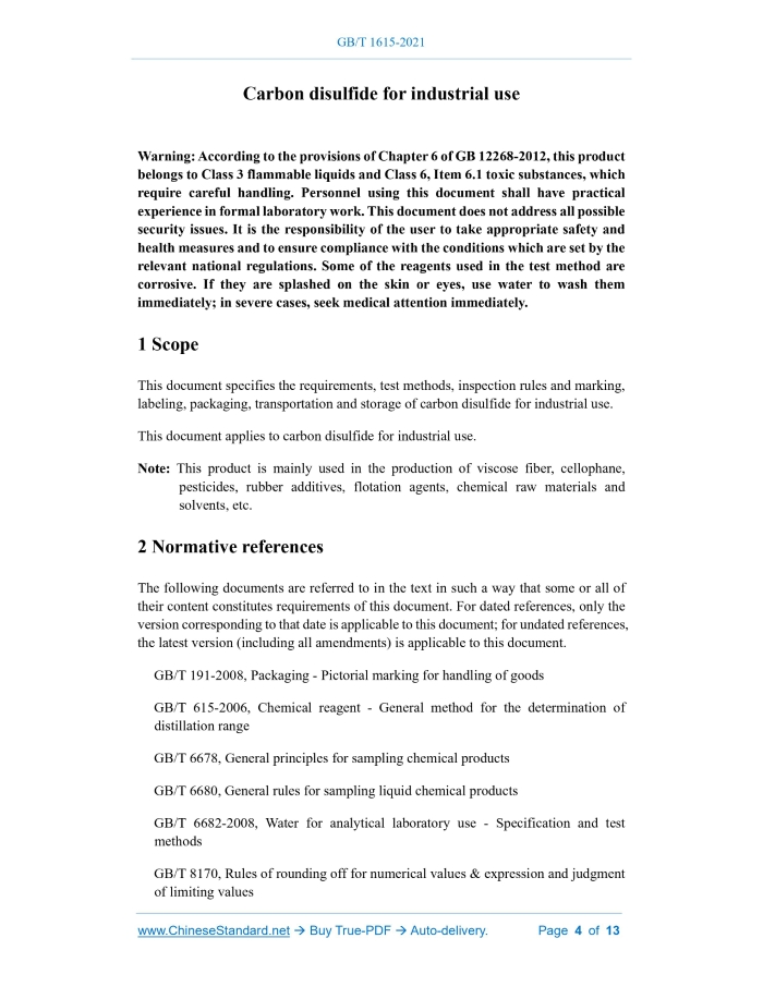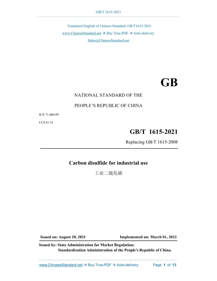 GB/T 1615-2021: Carbon disulfide for industrial use Delivery: 9 seconds. True-PDF full-copy in English & invoice will be downloaded + auto-delivered via email. See step-by-step procedure Status: Valid GB/T 1615: Historical versions