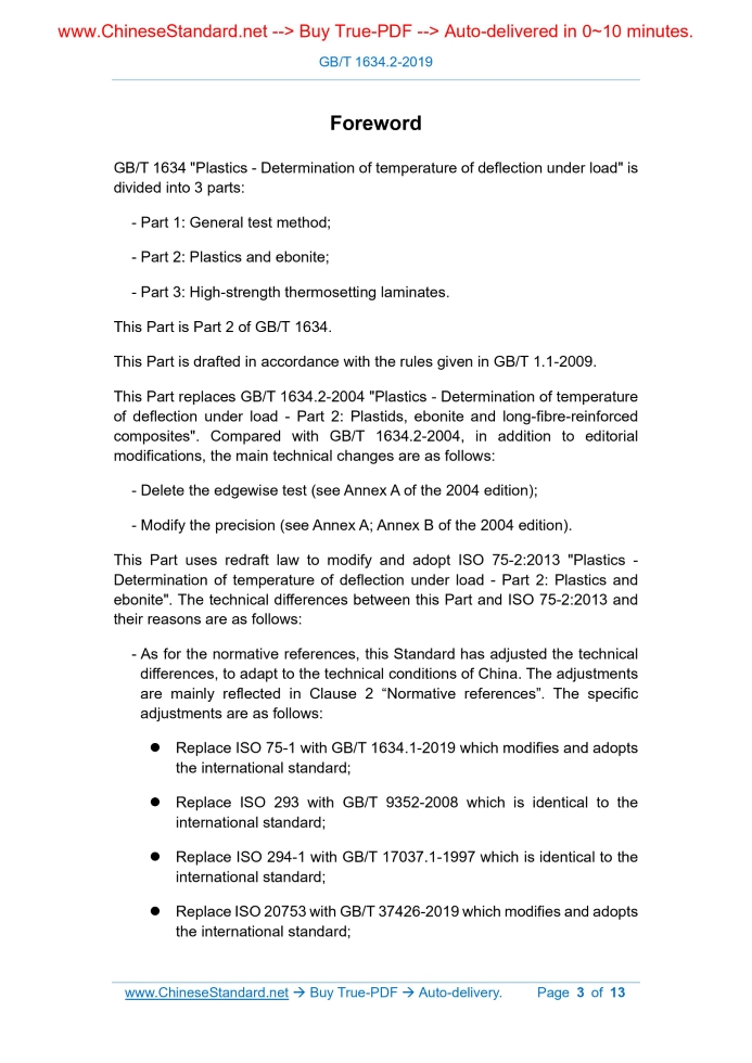 Similar standardsGB/T 1634.2-2019: Plastics -- Determination of temperature of deflection under load -- Part 2: Plastics and ebonite---This is an excerpt. Full copy of true-PDF in English version (including equations, symbols, images, flow-chart, tables, and figures etc.), auto-downloaded/delivered in 9 seconds, can be purchased online: https://www.ChineseStandard.net/PDF.aspx/GBT1634.2-2019 NATIONAL STANDARD OF THE PEOPLE’S REPUBLIC OF CHINA ICS 83.080.01 G 31 Replacing GB/T 1634.2-2004 Plastics - Determination of temperature of deflection under load - Part 2.Plastics and ebonite (ISO 75-2.2013, MOD) Issued on. MAY 10, 2019 Implemented on. APRIL 01, 2020 Issued by. State Administration for Market Regulation; Standardization Administration of the PRC. Table of ContentsForeword... 3 Introduction... 5 1 Scope... 6 2 Normative references... 6 3 Terms and definitions... 7 4 Principle... 7 5 Apparatus... 7 6 Test specimens... 8 7 Conditioning... 9 8 Procedure... 9 9 Expression of results... 10 10 Precision... 10 11 Test report... 10 Annex A (Informative) Precision... 11 Bibliography... 13ForewordGB/T 1634 "Plastics - Determination of temperature of deflection under load" is divided into 3 parts. - Part 1.General test method; - Part 2.Plastics and ebonite; - Part 3.High-strength thermosetting laminates. This Part is Part 2 of GB/T 1634. This Part is drafted in accordance with the rules given in GB/T 1.1-2009. This Part replaces GB/T 1634.2-2004 "Plastics - Determination of temperature of deflection under load - Part 2.Plastids, ebonite and long-fibre-reinforced composites". Compared with GB/T 1634.2-2004, in addition to editorial modifications, the main technical changes are as follows. - Delete the edgewise test (see Annex A of the 2004 edition); - Modify the precision (see Annex A; Annex B of the 2004 edition). This Part uses redraft law to modify and adopt ISO 75-2.2013 "Plastics - Determination of temperature of deflection under load - Part 2.Plastics and ebonite". The technical differences between this Part and ISO 75-2.2013 and their reasons are as follows. - As for the normative references, this Standard has adjusted the technical differences, to adapt to the technical conditions of China. The adjustments are mainly reflected in Clause 2 “Normative references”. The specific adjustments are as follows. Replace ISO 75-1 with GB/T 1634.1-2019 which modifies and adopts the international standard; Replace ISO 293 with GB/T 9352-2008 which is identical to the international standard; Replace ISO 294-1 with GB/T 17037.1-1997 which is identical to the international standard; Replace ISO 20753 with GB/T 37426-2019 which modifies and adopts the international standard; Replace the undated ISO 2818 with a dated ISO 2818.1994; Replace the undated ISO 10724-1 with a dated ISO 10724-1.1998. This Part has made the following editorial modifications. - Modify the Introduction; - Modify Annex A. ADD the precision data made by China’s laboratories. This Part was proposed by China Petroleum and Chemical Industry Federation. This Part shall be under the jurisdiction of National Technical Committee 15 on Plastics of Standardization Administration of China (SAC/TC 15). Main drafting organizations of this Part. China Bluestar Chengrand (Chengdu) Testing Technology Co., Ltd., Chengrand Research Institute of Chemical Industry Co., Ltd., Guangdong Yuanrong New Material Co., Ltd., Shenzhen Wance Testing Machine Co., Ltd., Chengde Jinjian Testing Instrument Co., Ltd., Shandong Dawn Polymer Material Co., Ltd., SINOPEC Beijing Yanshan Company Resin Application Research Institute. Main drafters of this Part. Xie Peng, Chen Minjian, Chen Xin, Mou Xiufa, Ren Yufeng, Zhao Lei, Huang Heliu, Jia Haiqiao. The previous editions of the standard replaced by this Part were released as follows. - GB/T 1634.2-2004.1 ScopeThis Part of GB/T 1634 specifies three methods, using different values of constant flexural stress, which can be used for the determination of the temperature of deflection under load of plastics (including filled plastics and fibre-reinforced plastics in which the fibre length is up to 7.5 mm) and ebonite.2 Normative referencesThe following documents are indispensable for the application of this document. For the dated references, only the editions with the dates indicated are applicable to this document. For the undated references, the latest edition (including all the amendments) are applicable to this document.3 Terms and definitionsFor the purposes of this document, the terms and definitions given in GB/T 1634.1-2019 apply.4 PrincipleThe principle is specified in GB/T 1634.1-2019, Clause 4.5 ApparatusThis is specified in GB/T 1634.1-2019, 5.2. This is specified in GB/T 1634.1-2019, 5.3. This is specified in GB/T 1634.1-2019, 5.5.6 Test specimensThis is specified in GB/T 1634.1-2019, 6.4. Discrepancies in test results due to variations in moulding conditions may be minimized by annealing the test specimens before testing them. Since different materials require different annealing conditions, annealing procedures shall be employed only if required by the materials standard or if agreed upon by the interested parties.7 ConditioningThis is specified in GB/T 1634.1-2019, Clause 7.8 ProcedureThis is specified in GB/T 1634.1-2019, 8.1. The flexural stress produced shall be one of the following.9 Expression of resultsThis is specified in GB/T 1634.1-2019, Clause 9.10 PrecisionSee Annex A.11 Test reportThis is specified in GB/T 1634.1-2019, Clause 11. The test report shall also include the following additional information.Annex A(Informative) Precision In order to determine the precision of the test methods specified in this Part, in 2017, 9 laboratories were organized in accordance with GB/T 6379.2-2004; an interlaboratory cycle test was conducted using 5 materials. ......Source: Above contents are excerpted from the full-copy PDF -- translated/reviewed by: www.ChineseStandard.net / Wayne Zheng et al. Tips & F