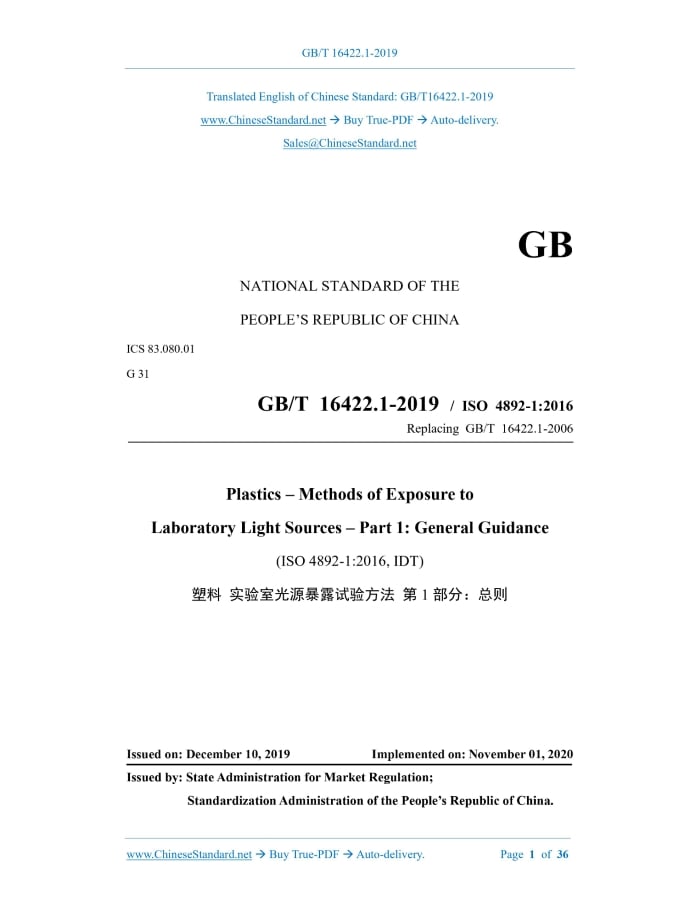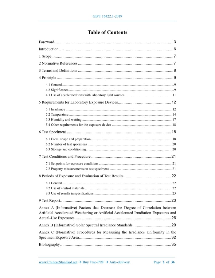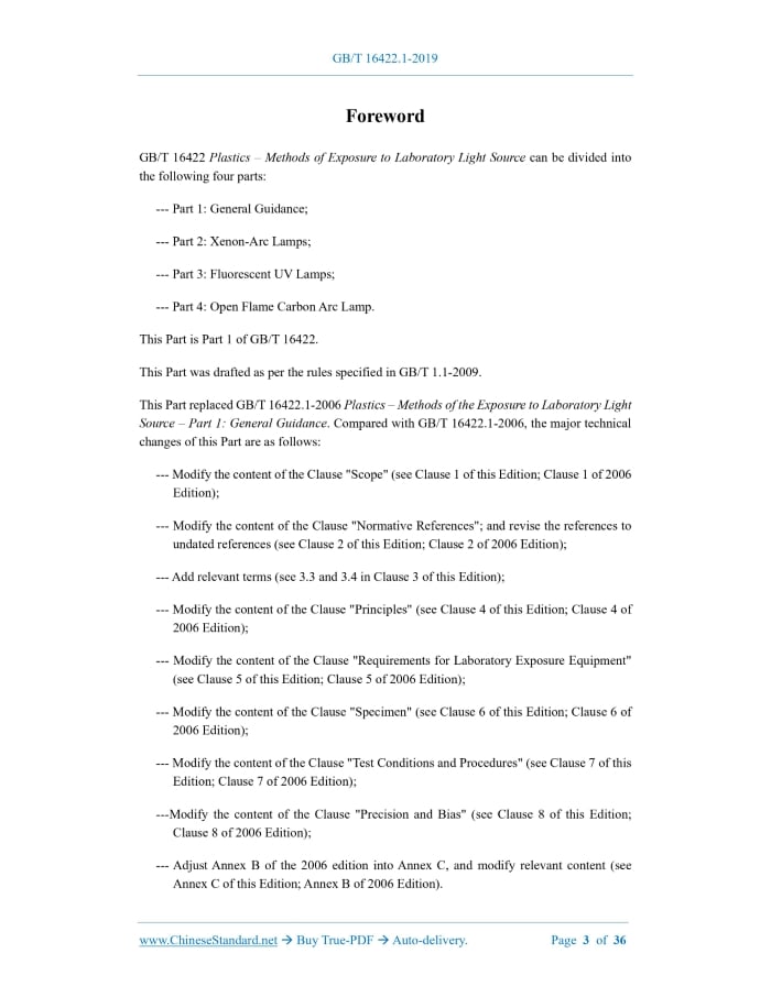 Similar standardsGB/T 16422.1-2019: Plastics -- Methods of exposure to laboratory light sources -- Part 1: General guidance---This is an excerpt. Full copy of true-PDF in English version (including equations, symbols, images, flow-chart, tables, and figures etc.), auto-downloaded/delivered in 9 seconds, can be purchased online: https://www.ChineseStandard.net/PDF.aspx/GBT16422.1-2019 GB NATIONAL STANDARD OF THE PEOPLE’S REPUBLIC OF CHINA ICS 83.080.01 G 31 GB/T 16422.1-2019 / ISO 4892-1:2016 Replacing GB/T 16422.1-2006 Plastics – Methods of Exposure to Laboratory Light Sources – Part 1: General Guidance (ISO 4892-1:2016, IDT) ISSUED ON: DECEMBER 10, 2019 IMPLEMENTED ON: NOVEMBER 01, 2020 Issued by: State Administration for Market Regulation; Standardization Administration of the People’s Republic of China. Table of ContentsForeword ... 3 Introduction ... 6 1 Scope ... 7 2 Normative References ... 7 3 Terms and Definitions ... 8 4 Principle ... 9 4.1 General ... 9 4.2 Significance ... 9 4.3 Use of accelerated tests with laboratory light sources ... 11 5 Requirements for Laboratory Exposure Devices ... 12 5.1 Irradiance ... 12 5.2 Temperature ... 14 5.3 Humidity and wetting ... 17 5.4 Other requirements for the exposure device ... 18 6 Test Specimens ... 18 6.1 Form, shape and preparation ... 18 6.2 Number of test specimens ... 20 6.3 Storage and conditioning... 20 7 Test Conditions and Procedure ... 21 7.1 Set points for exposure conditions ... 21 7.2 Property measurements on test specimens ... 21 8 Periods of Exposure and Evaluation of Test Results ... 22 8.1 General ... 22 8.2 Use of control materials ... 22 8.3 Use of results in specifications ... 23 9 Test Report ... 23 Annex A (Informative) Factors that Decrease the Degree of Correlation between Artificial Accelerated Weathering or Artificial Accelerated Irradiation Exposures and Actual-Use Exposures ... 26 Annex B (Informative) Solar Spectral Irradiance Standards ... 29 Annex C (Normative) Procedures for Measuring the Irradiance Uniformity in the Specimen Exposure Area ... 32 Bibliography ... 35ForewordGB/T 16422 Plastics – Methods of Exposure to Laboratory Light Source can be divided into the following four parts: --- Part 1: General Guidance; --- Part 2: Xenon-Arc Lamps; --- Part 3: Fluorescent UV Lamps; --- Part 4: Open Flame Carbon Arc Lamp. This Part is Part 1 of GB/T 16422. This Part was drafted as per the rules specified in GB/T 1.1-2009. This Part replaced GB/T 16422.1-2006 Plastics – Methods of the Exposure to Laboratory Light Source – Part 1: General Guidance. Compared with GB/T 16422.1-2006, the major technical changes of this Part are as follows: --- Modify the content of the Clause "Scope" (see Clause 1 of this Edition; Clause 1 of 2006 Edition); --- Modify the content of the Clause "Normative References"; and revise the references to undated references (see Clause 2 of this Edition; Clause 2 of 2006 Edition); --- Add relevant terms (see 3.3 and 3.4 in Clause 3 of this Edition); --- Modify the content of the Clause "Principles" (see Clause 4 of this Edition; Clause 4 of 2006 Edition); --- Modify the content of the Clause "Requirements for Laboratory Exposure Equipment" (see Clause 5 of this Edition; Clause 5 of 2006 Edition); --- Modify the content of the Clause "Specimen" (see Clause 6 of this Edition; Clause 6 of 2006 Edition); --- Modify the content of the Clause "Test Conditions and Procedures" (see Clause 7 of this Edition; Clause 7 of 2006 Edition); ---Modify the content of the Clause "Precision and Bias" (see Clause 8 of this Edition; Clause 8 of 2006 Edition); --- Adjust Annex B of the 2006 edition into Annex C, and modify relevant content (see Annex C of this Edition; Annex B of 2006 Edition). This part used the translation method to equivalently adopt ISO 4892-1:2016 Plastics – Methods of Exposure to Laboratory Light Sources – Part 1: General Guidance. The Chinese documents that have consistent correspondence with the international documents cited in this Part are as follows: --- GB/T 2918-2018 Plastics - Standard Atmospheres for Conditioning and Testing (ISO 291:2008, MOD); --- GB/T 9352-2008 Plastic - Compression Molding of Test Specimens of Thermoplastic Materials (ISO 293:2004, IDT); --- GB/T 17037.1-2019 Plastics - Injection Molding of Test Specimens of Thermoplastic Materials - Part 1: General Principles, and Molding of Multipurpose and Bar Test Specimens (ISO 294-1:2017, MOD); --- GB/T 17037.3-2003 Plastics - Injection Molding of Test Specimens of Thermoplastic Materials - Part 3: Small Plates (ISO 294-3:2002, IDT); --- GB/T 5471-2008 Plastics - Compression Molding of Test Specimens of Thermosetting Materials (ISO 295:2004, IDT); --- GB/T 11997-2008 Plastic - Multipurpose Test Specimens (ISO 3617:2002, IDT); --- GB/T 15596-2009 Plastics - Determination of Changes in Color and Variations in Properties after Exposure to Daylight under Glass, Natural Weathering or Laboratory Light Sources (ISO 4582:2007, IDT); --- GB/T 16422.2-2014 Plastics – Methods of Exposure to Laboratory Light Sources - Part 2: Xenon-Arc Sources (ISO 4892-2:2006, IDT); --- GB/T 16422.3-2014 Plastics - Methods of Exposure to Laboratory Light Sources - Part 3: Fluorescent UV Lamps (ISO 4892-3:2006, IDT); --- GB/T 16422.4-2014 Plastics - Methods of Exposure to Laboratory Light Sources - Part 4: Open-Flame Carbon-Arc Lamps (ISO 4892-4:2004, IDT). This Part was proposed by China Petroleum and Chemical Industry Federation. This Part shall be under the jurisdiction of National Technical Committee on Plastics of Standardization Administration of China (SAC/TC 15). Drafting organizations of this Part: Guangzhou Synthetic Materials Research Institute Co., Ltd.; Tianjin Kingfa Advanced Materials Co., Ltd.; Beijing Tiangang Auxiliary Co., Ltd.; Shandong Eco-Benign Plastics Technology Co., Ltd.; Atlas Material Testing Technology Co., Ltd.; and Xinjiang Turpan Natural Environment Test and Research Center. Plastics – Methods of