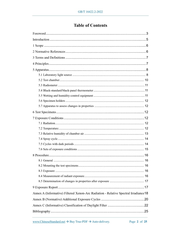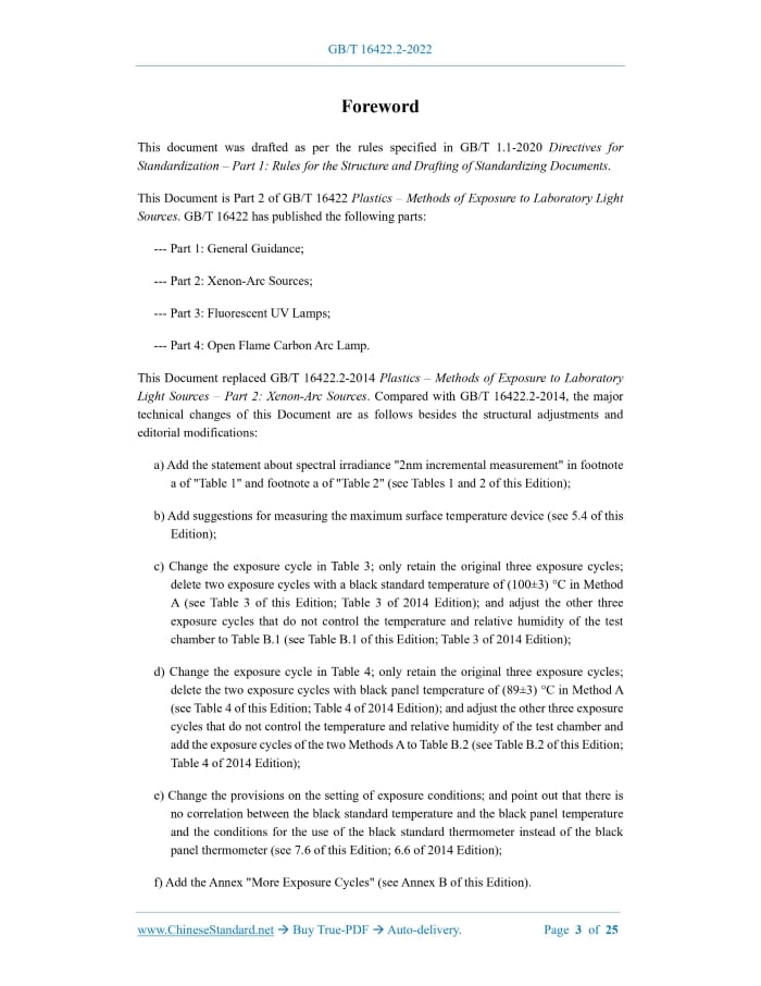 Similar standardsGB/T 16422.2-2022: Plastics - Methods of exposure to laboratory light sources - Part 2: Xenon-arc lamps---This is an excerpt. Full copy of true-PDF in English version (including equations, symbols, images, flow-chart, tables, and figures etc.), auto-downloaded/delivered in 9 seconds, can be purchased online: https://www.ChineseStandard.net/PDF.aspx/GBT16422.2-2022 GB NATIONAL STANDARD OF THE PEOPLE’S REPUBLIC OF CHINA ICS 83.080.01 CCS G 31 GB/T 16422.2-2022 / ISO 4892-2.2013 Replacing GB/T 16422.2-2014 Plastics – Methods of Exposure to Laboratory Light Sources – Part 2.Xenon-Arc Lamps (ISO 4892-2.2013, IDT) Issued on. APRIL 15, 2022 Implemented on. NOVEMBER 01, 2022 Issued by. State Administration for Market Regulation; Standardization Administration of the People’s Republic of China. Table of ContentsForeword... 3 Introduction... 5 1 Scope... 6 2 Normative References... 6 3 Terms and Definitions... 7 4 Principles... 7 5 Apparatus... 8 5.1 Laboratory light source... 8 5.2 Test chamber... 10 5.3 Radiometer... 11 5.4 Black-standard/black-panel thermometer... 11 5.5 Wetting and humidity-control equipment... 11 5.6 Specimen holders... 12 5.7 Apparatus to assess changes in properties... 12 6 Test Specimens... 12 7 Exposure Conditions... 12 7.1 Radiation... 12 7.2 Temperature... 12 7.3 Relative humidity of chamber air... 13 7.4 Spray cycle... 14 7.5 Cycles with dark periods... 14 7.6 Sets of exposure conditions... 15 8 Procedure... 16 8.1 General... 16 8.2 Mounting the test specimens... 16 8.3 Exposure... 16 8.4 Measurement of radiant exposure... 16 8.5 Determination of changes in properties after exposure... 17 9 Exposure Report... 17 Annex A (Informative) Filtered Xenon-Arc Radiation - Relative Spectral Irradiance 18 Annex B (Normative) Additional Exposure Cycles... 20 Annex C (Informative) Classification of Daylight Filter... 22 Bibliography... 25ForewordThis document was drafted as per the rules specified in GB/T 1.1-2020 Directives for Standardization – Part 1.Rules for the Structure and Drafting of Standardizing Documents. This Document is Part 2 of GB/T 16422 Plastics – Methods of Exposure to Laboratory Light Sources. GB/T 16422 has published the following parts. --- Part 1.General Guidance; --- Part 2.Xenon-Arc Sources; --- Part 3.Fluorescent UV Lamps; --- Part 4.Open Flame Carbon Arc Lamp. This Document replaced GB/T 16422.2-2014 Plastics – Methods of Exposure to Laboratory Light Sources – Part 2.Xenon-Arc Sources. Compared with GB/T 16422.2-2014, the major technical changes of this Document are as follows besides the structural adjustments and editorial modifications. a) Add the statement about spectral irradiance "2nm incremental measurement" in footnote a of "Table 1" and footnote a of "Table 2" (see Tables 1 and 2 of this Edition); b) Add suggestions for measuring the maximum surface temperature device (see 5.4 of this Edition); c) Change the exposure cycle in Table 3; only retain the original three exposure cycles; delete two exposure cycles with a black standard temperature of (100±3) °C in Method A (see Table 3 of this Edition; Table 3 of 2014 Edition); and adjust the other three exposure cycles that do not control the temperature and relative humidity of the test chamber to Table B.1 (see Table B.1 of this Edition; Table 3 of 2014 Edition); d) Change the exposure cycle in Table 4; only retain the original three exposure cycles; delete the two exposure cycles with black panel temperature of (89±3) °C in Method A (see Table 4 of this Edition; Table 4 of 2014 Edition); and adjust the other three exposure cycles that do not control the temperature and relative humidity of the test chamber and add the exposure cycles of the two Methods A to Table B.2 (see Table B.2 of this Edition; Table 4 of 2014 Edition); e) Change the provisions on the setting of exposure conditions; and point out that there is no correlation between the black standard temperature and the black panel temperature and the conditions for the use of the black standard thermometer instead of the black panel thermometer (see 7.6 of this Edition; 6.6 of 2014 Edition); f) Add the Annex "More Exposure Cycles" (see Annex B of this Edition). This Document equivalently adopts ISO 4892-2.2013 Plastics – Methods of Exposure to Laboratory Light Sources – Part 2.Xenon-Arc Lamps. This Document adds a Clause of “Terms and Definitions”. This Document made the minimum editorial modifications. --- Incorporate the amendments of ISO 4892-2.2013/Amd.1.2021, and the outer margins of the terms involved are marked with vertical double lines (‖). Please note some contents of this Document may involve patents. The issuing agency of this Document shall not assume the responsibility to identify these patents. This Document was proposed by China Petroleum and Chemical Industry Federation. This Document shall be under the jurisdiction of National Technical Committee on Plastics of Standardization Administration of China (SAC/TC 15). Drafting organizations of this Document. Guangzhou Synthetic Materials Research Institute Co., Ltd.; Shaanxi Yanchang Jingwei New Material Technology Industrial Park Co., Ltd.; Shandong Dawn Polymer Co., Ltd.; Orinko Advanced Plastics Co., Ltd.; Beijing Tiangang Auxiliary Co., Ltd.; Wanhua Chemical Group Co., Ltd.; Suzhou EMTEK Co., Ltd.; Atlas Material Testing Technology LLC.; Qingdao Hengjia Precision Technology Co., Ltd.; SAIC- GM-Wuling Automobile; Shenzhen NTEK Testing Technology Co., Ltd.; Suzhou Sunway Polymer Co., Ltd.; and Q-Lab Corporation Shanghai Office. Chief drafting staffs of this Document. Wang Haojiang, Tie Wenan, Zhao Lei, Wang Fei, Wang Chanyao, Liu Gang, Yang Li, Xie Xiao, Cheng Ge, Lu Bo, Lan Xian, Zhou Yebi, Wang Haili, Zhang Heng, Tian Xiaoyan, Chen Guoyang, and Chen Xin. The historical editions replaced by this Standard are as follows. --- It is first-time published as GB/T 9344-1988 in 1988; --- It is first-time revised as partial publication i
