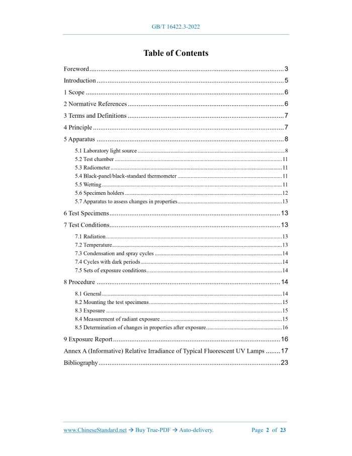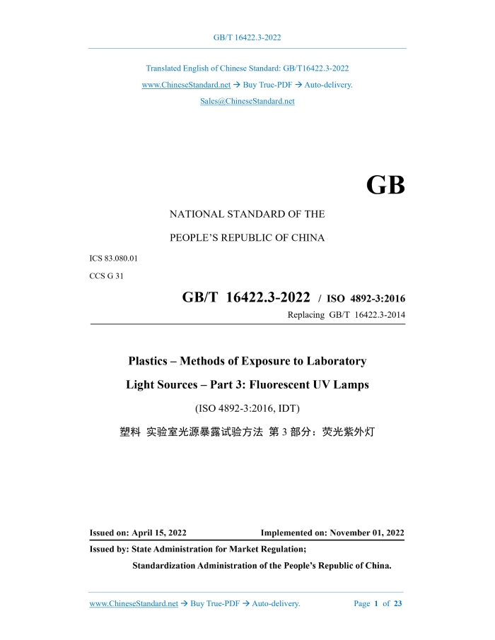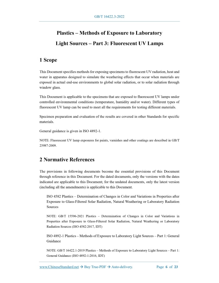 Similar standardsGB/T 16422.3-2022: Plastics - Methods of exposure to laboratory light sources - Part 3: Fluorescent UV lamps---This is an excerpt. Full copy of true-PDF in English version (including equations, symbols, images, flow-chart, tables, and figures etc.), auto-downloaded/delivered in 9 seconds, can be purchased online: https://www.ChineseStandard.net/PDF.aspx/GBT16422.3-2022 GB NATIONAL STANDARD OF THE PEOPLE’S REPUBLIC OF CHINA ICS 83.080.01 CCS G 31 GB/T 16422.3-2022 / ISO 4892-3:2016 Replacing GB/T 16422.3-2014 Plastics – Methods of Exposure to Laboratory Light Sources – Part 3: Fluorescent UV Lamps (ISO 4892-3:2016, IDT) ISSUED ON: APRIL 15, 2022 IMPLEMENTED ON: NOVEMBER 01, 2022 Issued by: State Administration for Market Regulation; Standardization Administration of the People’s Republic of China. Table of ContentsForeword ... 3 Introduction ... 5 1 Scope ... 6 2 Normative References ... 6 3 Terms and Definitions ... 7 4 Principle ... 7 5 Apparatus ... 8 5.1 Laboratory light source ... 8 5.2 Test chamber ... 11 5.3 Radiometer ... 11 5.4 Black-panel/black-standard thermometer ... 11 5.5 Wetting ... 11 5.6 Specimen holders ... 12 5.7 Apparatus to assess changes in properties ... 13 6 Test Specimens ... 13 7 Test Conditions ... 13 7.1 Radiation ... 13 7.2 Temperature ... 13 7.3 Condensation and spray cycles ... 14 7.4 Cycles with dark periods ... 14 7.5 Sets of exposure conditions ... 14 8 Procedure ... 14 8.1 General ... 14 8.2 Mounting the test specimens ... 15 8.3 Exposure ... 15 8.4 Measurement of radiant exposure ... 15 8.5 Determination of changes in properties after exposure ... 16 9 Exposure Report ... 16 Annex A (Informative) Relative Irradiance of Typical Fluorescent UV Lamps ... 17 Bibliography ... 23 Plastics – Methods of Exposure to Laboratory Light Sources – Part 3: Fluorescent UV Lamps1 ScopeThis Document specifies methods for exposing specimens to fluorescent UV radiation, heat and water in apparatus designed to simulate the weathering effects that occur when materials are exposed in actual end-use environments to global solar radiation, or to solar radiation through window glass. This Document is applicable to the specimens that are exposed to fluorescent UV lamps under controlled environmental conditions (temperature, humidity and/or water). Different types of fluorescent UV lamp can be used to meet all the requirements for testing different materials. Specimen preparation and evaluation of the results are covered in other Standards for specific materials. General guidance is given in ISO 4892-1. NOTE: Fluorescent UV lamp exposures for paints, varnishes and other coatings are described in GB/T 23987-2009.2 Normative ReferencesThe provisions in following documents become the essential provisions of this Document through reference in this Document. For the dated documents, only the versions with the dates indicated are applicable to this Document; for the undated documents, only the latest version (including all the amendments) is applicable to this Document. ISO 4582 Plastics – Determination of Changes in Color and Variations in Properties after Exposure to Glass-Filtered Solar Radiation, Natural Weathering or Laboratory Radiation Sources NOTE: GB/T 15596-2021 Plastics – Determination of Changes in Color and Variations in Properties after Exposure to Glass-Filtered Solar Radiation, Natural Weathering or Laboratory Radiation Sources (ISO 4582:2017, IDT) ISO 4892-1 Plastics – Methods of Exposure to Laboratory Light Sources – Part 1: General Guidance NOTE: GB/T 16422.1-2019 Plastics – Methods of Exposure to Laboratory Light Sources – Part 1: General Guidance (ISO 4892-1:2016, IDT)3 Terms and DefinitionsFor the purposes of this Document, the terms and definitions given in ISO 4892-1 apply.4 Principle4.1 Fluorescent UV lamps, when following the manufacturer’s recommendations for lamp maintenance and/or rotation, may be used to simulate the spectral irradiance of global solar radiation in the short wavelength ultraviolet (UV) region of the spectrum. 4.2 Specimens are exposed to various levels of UV radiation, heat and moisture (see 4.4) under controlled environmental conditions. 4.3 The exposure conditions may be varied by selection of the following: a) type of fluorescent UV lamp; b) irradiance level; c) temperature during the UV exposure; d) type of wetting (see 4.4); e) wetting temperature and cycle; f) timing of the UV/dark cycle. 4.4 Wetting is usually produced by condensation of water vapor on to the exposed specimen surface or by spraying the test specimens with demineralized/deionized water. 4.5 The procedure(s) may include measurement of the irradiance and the radiant exposure in the plane of the specimen. 4.6 It is recommended that a similar material of known performance (a control) be exposed simultaneously with the test specimens to provide a standard for comparative purposes. 4.7 Intercomparison of results obtained from specimens exposed in different types of apparatus or to different types of lamps should not be made unless an appropriate statistical relationship has been established between the different types of equipment for the material to be tested.5 Apparatus5.1 Laboratory light source 5.1.1 Fluorescent UV lamps are fluorescent lamps in which radiant emission in the ultraviolet region of the spectrum, i.e., below 400 nm, makes up at least 80 % of the total light output. There are three types of fluorescent UV lamp used in this Document. — UVA-340 (type 1A) fluorescent UV lamp: these lamps have a radiant emission below 300 nm of less than 1 % of the total light output, have an emission peak at 343 nm, and are more commonly identified as UVA-340 for simulation of global solar radiation from 300 nm to 340 nm (see Table 1). Figure A.1 is a graph of spectral irradiance from 250 nm to 400 nm of a typical UVA-340 (type 1A) fluorescent lamp compared to global solar radiation. — UVA-351 (type 1B) fluorescent UV lamp: these 