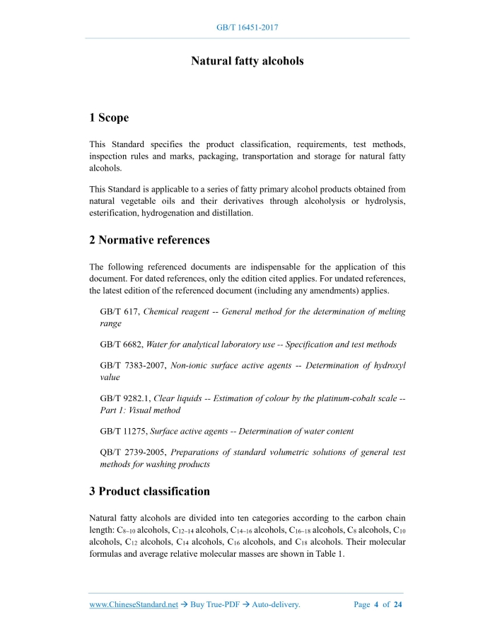 Similar standardsGB/T 16451-2017: Natural fatty alcohols---This is an excerpt. Full copy of true-PDF in English version (including equations, symbols, images, flow-chart, tables, and figures etc.), auto-downloaded/delivered in 9 seconds, can be purchased online: https://www.ChineseStandard.net/PDF.aspx/GBT16451-2017GB NATIONAL STANDARD OF THE PEOPLE’S REPUBLIC OF CHINA ICS 71.080.60 G 17 Replacing GB/T 16451-2008 Natural fatty alcohols Issued on. DECEMBER 29, 2017 Implemented on. JULY 01, 2018 Issued by. General Administration of Quality Supervision, Inspection and Quarantine of the People's Republic of China; Standardization Administration of the People's Republic of China. Table of ContentsForeword... 3 1 Scope... 4 2 Normative references... 4 3 Product classification... 4 4 Requirements... 5 5 Test methods... 7 6 Inspection rules... 21 7 Marks, packaging, transportation, storage... 231 ScopeThis Standard specifies the product classification, requirements, test methods, inspection rules and marks, packaging, transportation and storage for natural fatty alcohols. This Standard is applicable to a series of fatty primary alcohol products obtained from natural vegetable oils and their derivatives through alcoholysis or hydrolysis, esterification, hydrogenation and distillation.2 Normative referencesThe following referenced documents are indispensable for the application of this document. For dated references, only the edition cited applies. For undated references, the latest edition of the referenced document (including any amendments) applies. GB/T 617, Chemical reagent -- General method for the determination of melting range GB/T 6682, Water for analytical laboratory use -- Specification and test methods GB/T 7383-2007, Non-ionic surface active agents -- Determination of hydroxyl value GB/T 9282.1, Clear liquids -- Estimation of colour by the platinum-cobalt scale -- Part 1.Visual method3 Product classificationNatural fatty alcohols are divided into ten categories according to the carbon chain length. C8~10 alcohols, C12~14 alcohols, C14~16 alcohols, C16~18 alcohols, C8 alcohols, C10 alcohols, C12 alcohols, C14 alcohols, C16 alcohols, and C18 alcohols.4 RequirementsNatural fatty alcohols have an inherent characteristic odor. The physical and chemical indicators shall meet the requirements in Table 2.When used as cosmetic raw material, they shall also meet the requirements in Table 3.5 Test methodsUnless otherwise stated, only reagents confirmed to be analytically pure and grade three water in accordance with GB/T6682 are used in the analysis. 5.1 Sample preparation After mixing the samples (solid samples shall be melted and mixed) before sampling test. 5.2 Appearance Put samples in beakers or glass jars. Visually inspect the color and state of the sample at 30°C. 5.4 Color 5.4.1 Specimen processing The solid fatty alcohol specimen needs to be heated to 75°C±5°C. After it is completely melted, immediately pour it into a pre-warmed colorimetric tube. 5.4.2 Determination According to the provisions of GB/T 9282.1.The resulting platinum-cobalt color units are expressed in Hazen. 5.5 Acid value NOTE. The number of milligrams of potassium hydroxide required to neutralize the acidity of 1 g of fatty alcohol specimen is called the acid value. 5.6 Saponification value NOTE. The number of milligrams of potassium hydroxide required to saponify 1 g of fatty alcohol specimen is called the saponification value of fatty alcohol. 5.6.1 Reagents Reagents include. 5.6.3 Test procedures Weigh 10 g of specimen (accurate to 0.001 g) and place it in the conical flask [5.6.2a)]. Use a pipette to transfer 25 mL of 0.1 mol/L potassium hydroxide-ethanol solution. Install the reflux condenser. 5.6.4 Calculation of results The saponification value X2 of fatty alcohol is calculated in KOH, expressed in milligrams per gram (mg/g), and calculated according to formula (2). 5.7 Iodine value NOTE. The number of grams of iodine absorbed per 100 g of fatty alcohol specimen is called iodine value. 5.7.1 Reagents Reagents include. 5.7.2 Instruments Commonly used laboratory instruments and the following. 5.7.3 Test procedures Accurately weigh 5 g of specimen (accurate to 0.001 g) in iodine bottle. Use a graduated cylinder to add 20 mL of carbon tetrac 5.7.4 Calculation of results Fatty alcohol iodine value X3, calculated as I2, expressed in grams per hectogram (g/100 g), is calculated according to formula (3). 5.7.5 Precision The absolute difference between two independent determination results obtained under repeatability conditions is not more than 0.2 g/100 g. The premise is that the case of greater than 0.2 g/100 g does not exceed 5%. 5.8 Hydroxyl value (chemical method) - arbitration method According to the provisions for the acetic anhydride method in GB/T 7383-2007. 5.9 Main component content, hydroxyl value and alkane content (chromatographic method)6 Inspection rules6.1 Inspection classification 6.1.1 Type inspection Type inspection items include all items in Chapter 4.Type inspection shall be carried out in the following situations. 6.1.2 Exit-factory inspection The requirements in Table 2 in Chapter 4 are all exit-factory inspection items. 6.2 Batching and sampling rules 6.3 Judgment rules and re-inspection For the test results of physical and chemical indicators, use the rounding value comparison method to determine whether the products are accepted or rejected. If one item fails, twice as many samples can be taken again to reinspect the failed item. 6.4 Arbitration If both parties to the delivery still have disputes over the re-inspection results, they can request arbitration for inspection according to this Standard. The arbitration result shall be the final basis.7 Marks, packaging, transportation, storage7.1 Marks Each package of natural fatty alcohol and the accompanying quality certificate shall have the following marks. 7.2 Packaging Bulk fatty alcohol products are generally transported by tank truck 