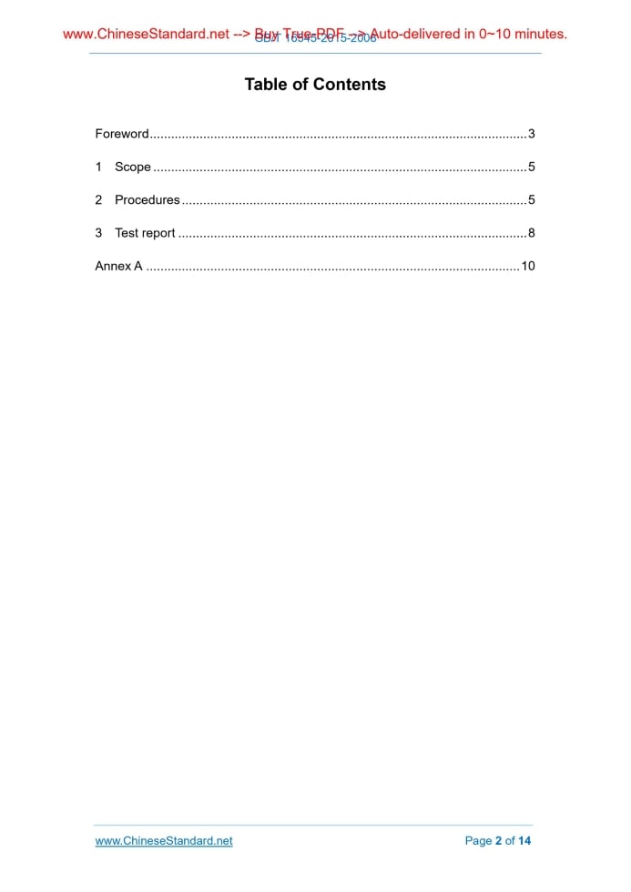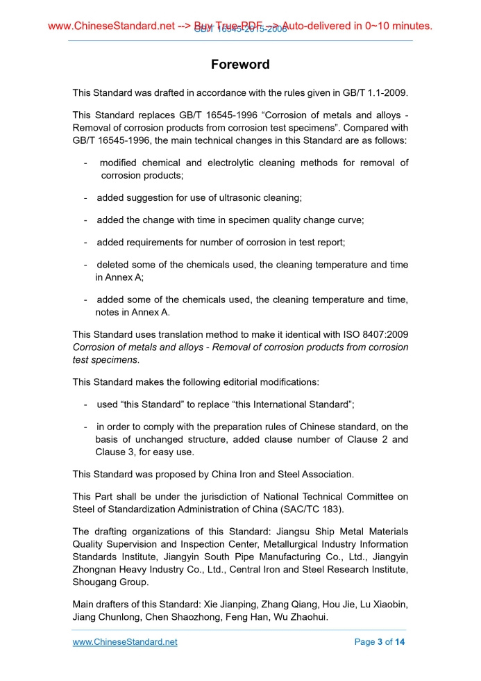 Similar standardsGB/T 16545-2015: Corrosion of metals and alloys -- Removal of corrosion products from corrosion test specimens---This is an excerpt. Full copy of true-PDF in English version (including equations, symbols, images, flow-chart, tables, and figures etc.), auto-downloaded/delivered in 9 seconds, can be purchased online: https://www.ChineseStandard.net/PDF.aspx/GBT16545-2015 GB NATIONAL STANDARD OF THE PEOPLE’S REPUBLIC OF CHINA ICS 77.060 H 25 GB/T 16545-2015 / ISO 8407.2009 Replacing GB/T 16545-1996 Corrosion of metals and alloys - Removal of corrosion products from corrosion test specimens (ISO 8407.2009, IDT) Issued on: SEPTEMBER 11, 2015 Implemented on: JUNE 1, 2016 Issued by. General Administration of Quality Supervision, Inspection and Quarantine; Standardization Administration Committee. Table of ContentsForeword ... 3 1 Scope ... 5 2 Procedures ... 5 3 Test report ... 8 Annex A ... 10ForewordThis Standard was drafted in accordance with the rules given in GB/T 1.1-2009. This Standard replaces GB/T 16545-1996 “Corrosion of metals and alloys - Removal of corrosion products from corrosion test specimens”. Compared with GB/T 16545-1996, the main technical changes in this Standard are as follows. - modified chemical and electrolytic cleaning methods for removal of corrosion products; - added suggestion for use of ultrasonic cleaning; - added the change with time in specimen quality change curve; - added requirements for number of corrosion in test report; - deleted some of the chemicals used, the cleaning temperature and time in Annex A; - added some of the chemicals used, the cleaning temperature and time, notes in Annex A. This Standard uses translation method to make it identical with ISO 8407.2009 Corrosion of metals and alloys - Removal of corrosion products from corrosion test specimens. This Standard makes the following editorial modifications. - used “this Standard” to replace “this International Standard”; - in order to comply with the preparation rules of Chinese standard, on the basis of unchanged structure, added clause number of Clause 2 and Clause 3, for easy use. This Standard was proposed by China Iron and Steel Association. This Part shall be under the jurisdiction of National Technical Committee on Steel of Standardization Administration of China (SAC/TC 183). The drafting organizations of this Standard. Jiangsu Ship Metal Materials Quality Supervision and Inspection Center, Metallurgical Industry Information Standards Institute, Jiangyin South Pipe Manufacturing Co., Ltd., Jiangyin Zhongnan Heavy Industry Co., Ltd., Central Iron and Steel Research Institute, Shougang Group. Main drafters of this Standard. Xie Jianping, Zhang Qiang, Hou Jie, Lu Xiaobin, Jiang Chunlong, Chen Shaozhong, Feng Han, Wu Zhaohui. Corrosion of metals and alloys – Removal of corrosion products from corrosion test specimens1 Scope1.1 This Standard specifies procedures for the removal of corrosion products formed on metal and alloy corrosion test specimens during their exposure in corrosive environments. NOTE For the purpose of this Standard, the term “metals” refers to pure metals and alloys. 1.2 The specified procedures are designed to remove all corrosion products without significant removal of base metal. This allows an accurate determination of the mass loss of the metal, which occurred during exposure to the corrosive environment. 1.3 This Standard may, in some cases, also be applied to metal coatings. However, possible effects from the substrate must be considered.2 Procedures2.1 General 2.1.1 A light mechanical cleaning treatment by brushing with a soft bristle brush under running water should first be applied to remove lightly adherent or bulky corrosion products. 2.1.2 If the treatment described in 2.1.1 does not remove all corrosion products, it will be necessary to use other procedures. These are of three types. a) chemical; b) electrolytic; c) more vigorous mechanical treatments. NOTE These treatments will also remove some base metal. 2.1.3 Whichever method is used, it might be necessary to repeat the cleaning treatment to ensure complete removal of the corrosion products. Removal shall be confirmed by visual examination. The use of a low-power microscope (i.e. ×7 ~ ×30) is particularly helpful with a pitted surface since corrosion products 2.1.4.3 The true mass of the specimen, after removal of the corrosion products, will be a value between the masses represented by the points B and D, depending on the degree of protection furnished by the corrosion products during the cleaning procedure. 2.1.5 The preferred cleaning method will be that which a) provides efficient removal of corrosion products, b) provides low or zero mass loss when applied to new uncorroded specimens (see 2.1.4.1), and c) provides a curve of mass as a function of the number of cleaning cycles or time of pickling, which is close to horizontal when the latter is plotted as the abscissa (see 2.1.4.2). 2.1.6 When chemical or electrolytic procedures are used, solutions freshly prepared with distilled or deionized water and reagent grade chemicals shall be used. 2.1.7 After cleaning, the specimen should be thoroughly rinsed with tap water, a light brushing during this procedure will help to remove any remaining surface products resulting from the cleaning process. Finally, the specimens shall be rinsed with distilled or deionized water. The specimen shall then be rinsed thoroughly in ethanol and dried using a hot air blower or an oven. After that, the specimens shall be allowed to cool in a dessicator to the balance room temperature before weighing. 2.2 Chemical procedures 2.2.1 Chemical procedures involve immersion of the corrosion test specimen in a chemical solution which is specifically designed to remove the corrosion products with minimal dissolution of any base metal. Several procedures are listed in Annex A (see Table A.1). To facilitate the cleaning, it is strongly recommended